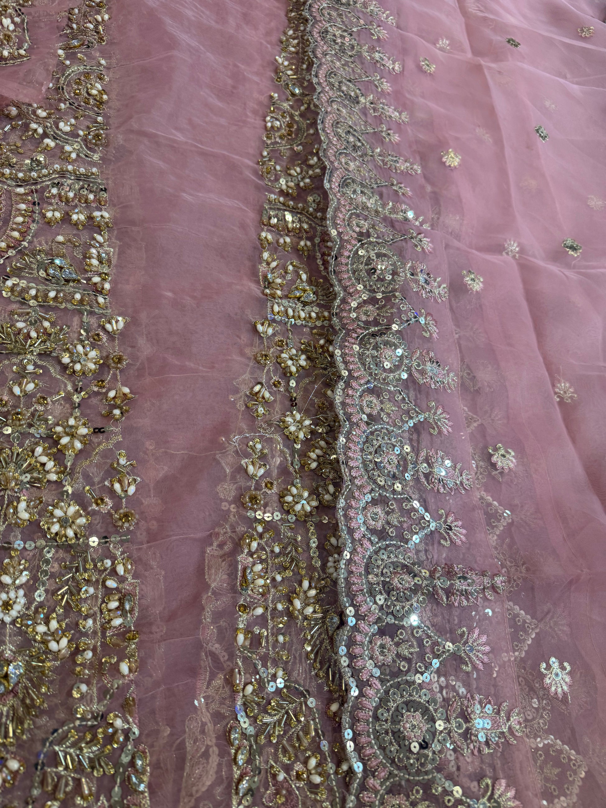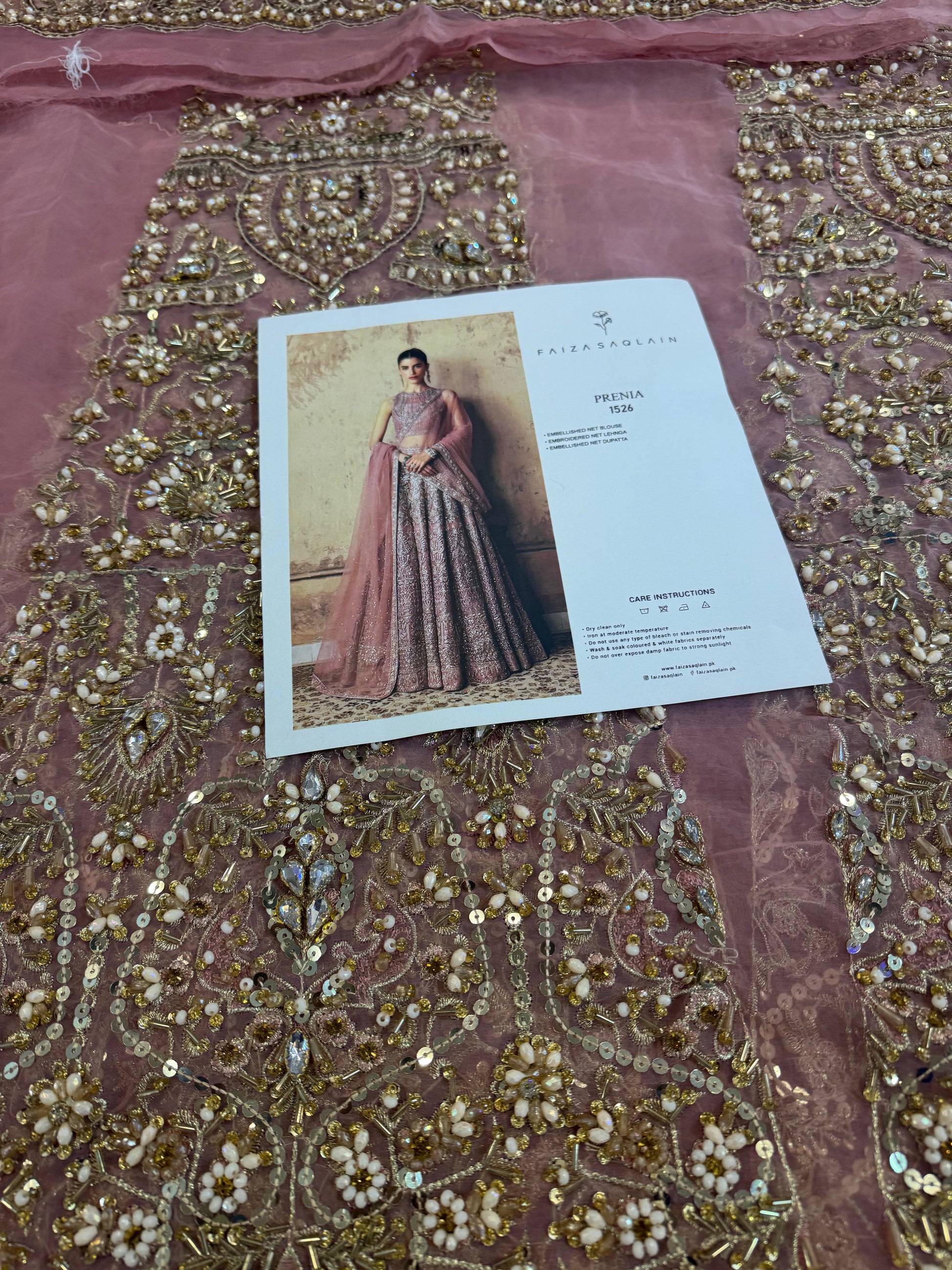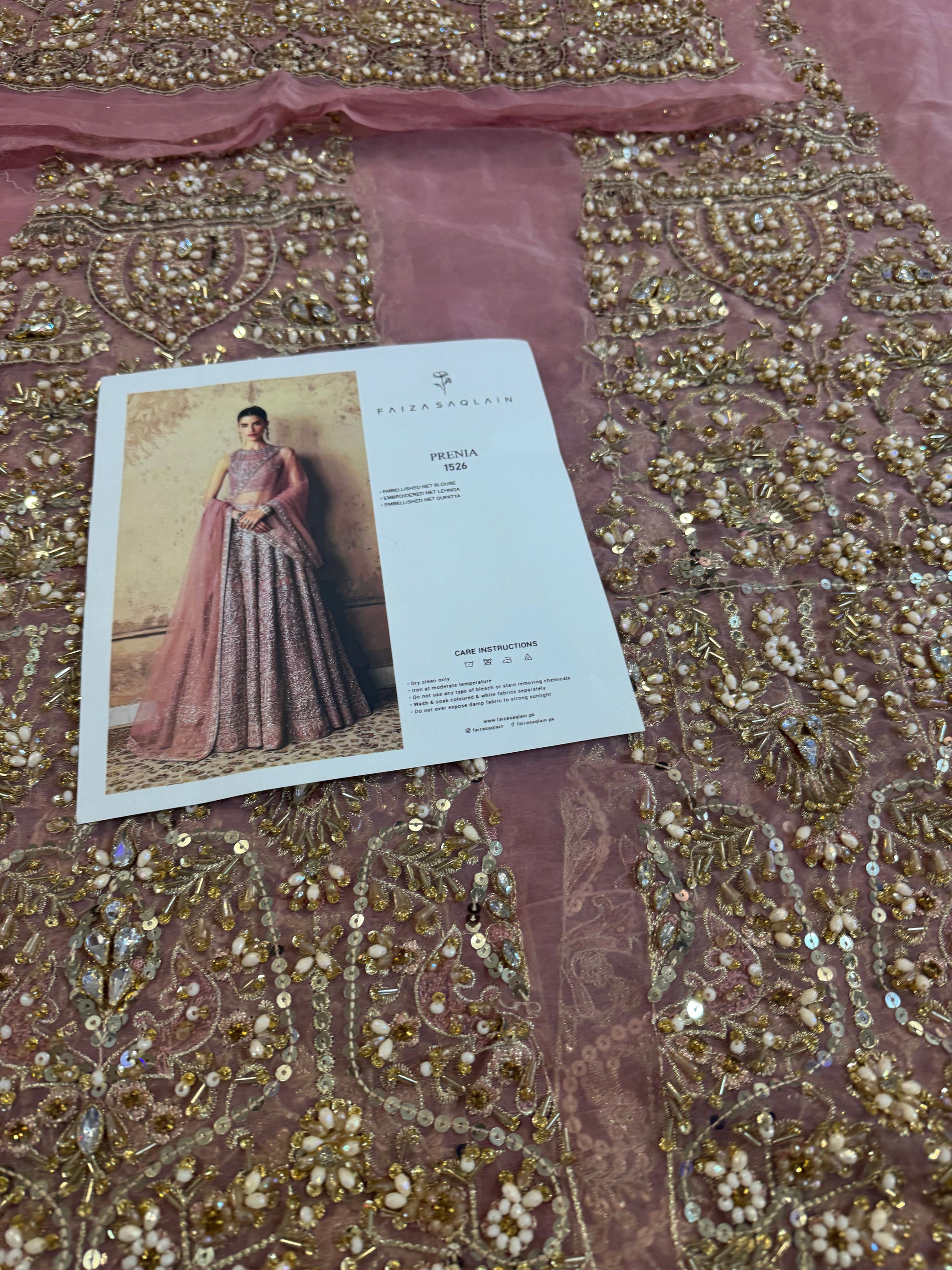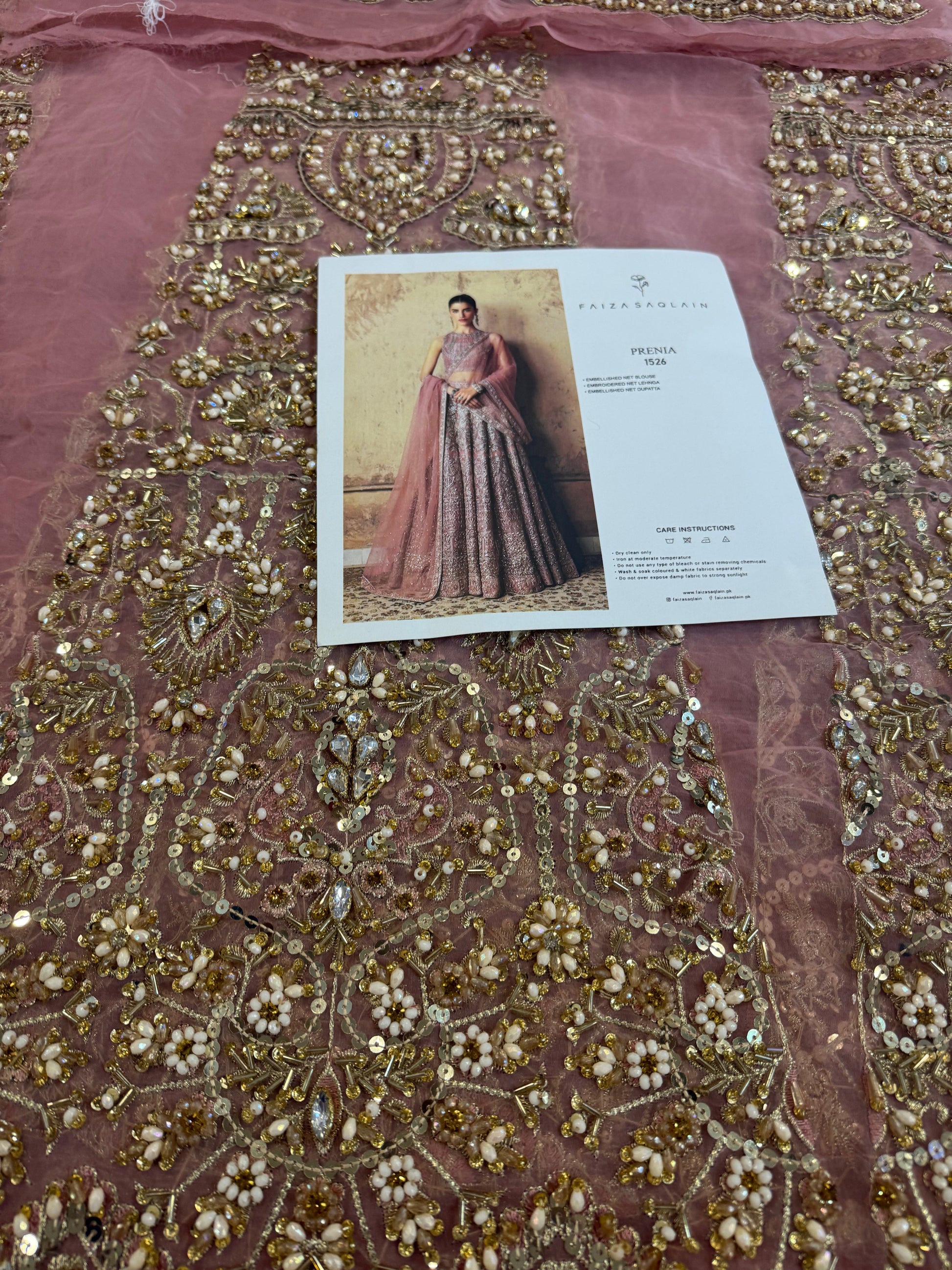 Description: Reflecting true artistry, Prenia is a contemporary rendition of a classic silhouette. Crafted from a dusty rose pink net, the lehnga and choli feature lavishly adorned gota, resham and sequin embellishments. Elevating the piece further is the diaphanous net dupatta, rich with delicate adornments, ensuring you look memorable at every celebration.