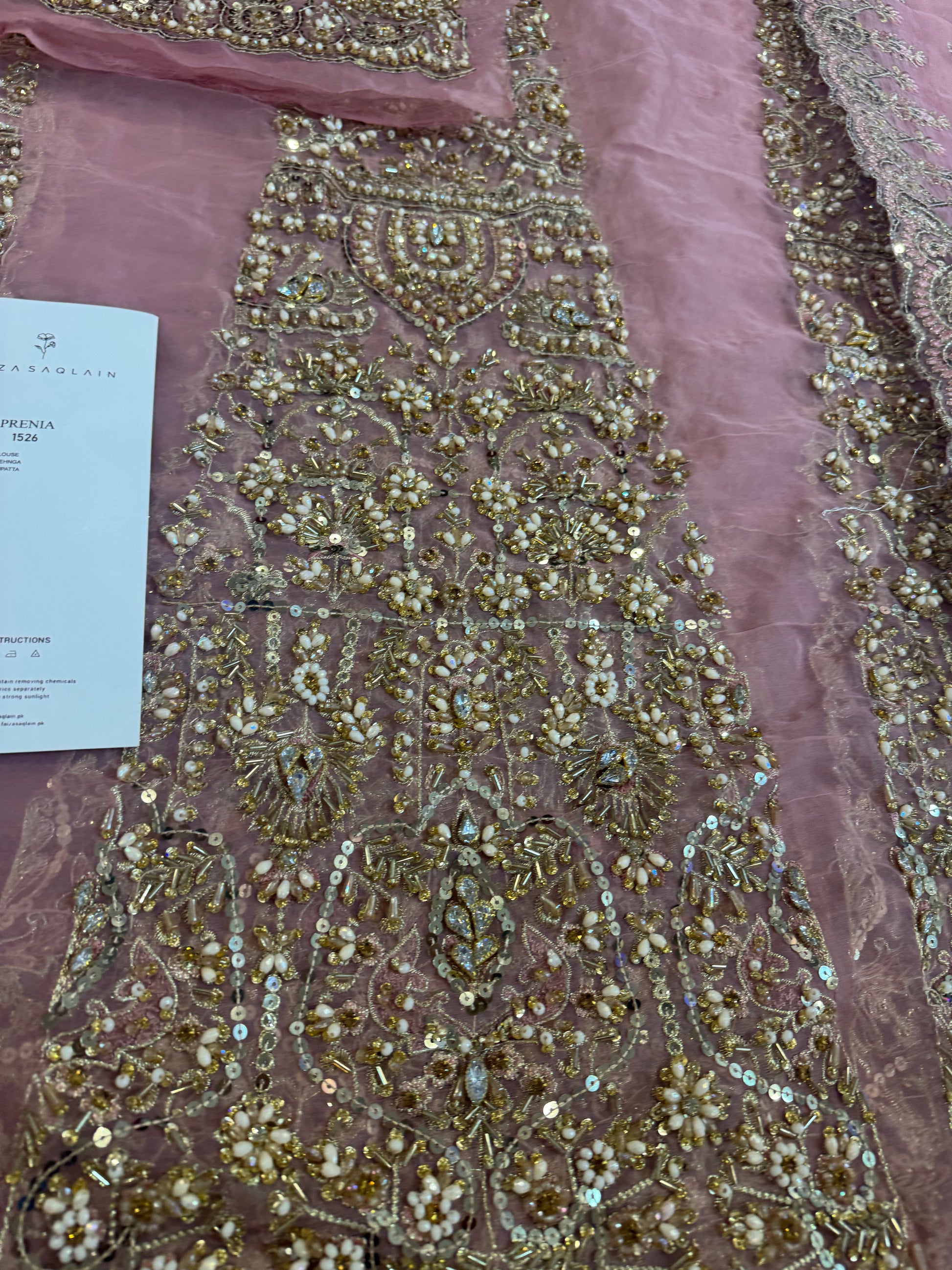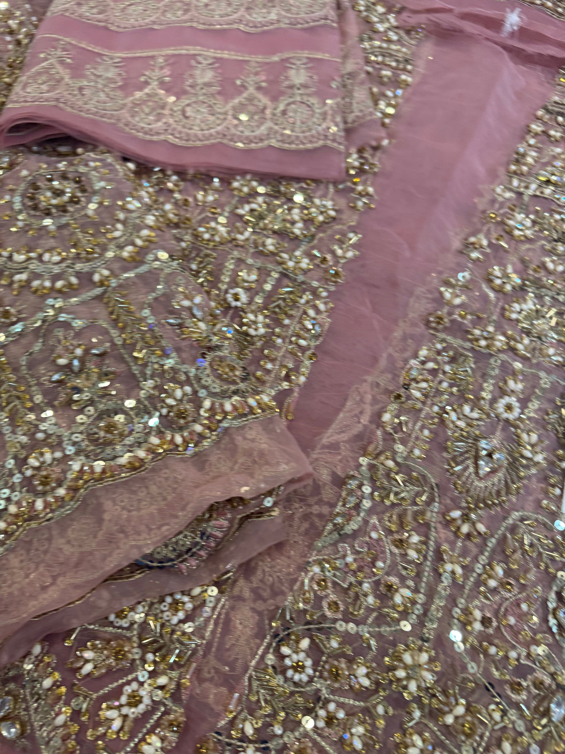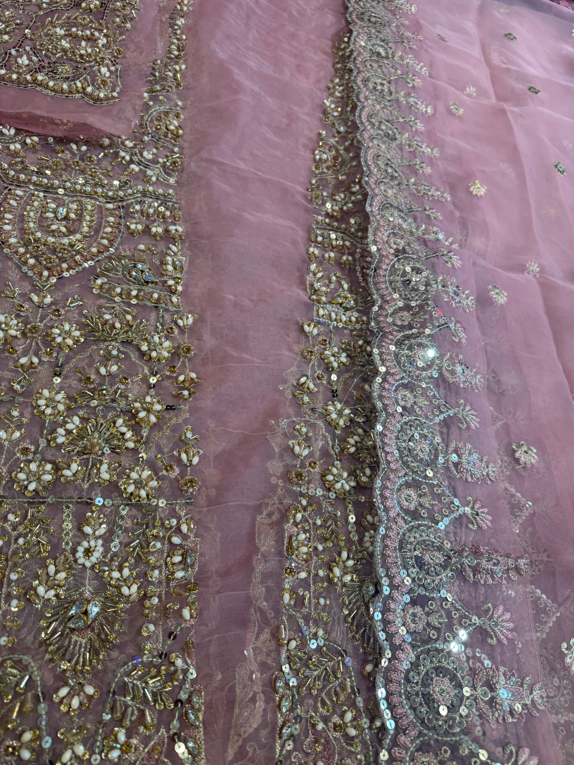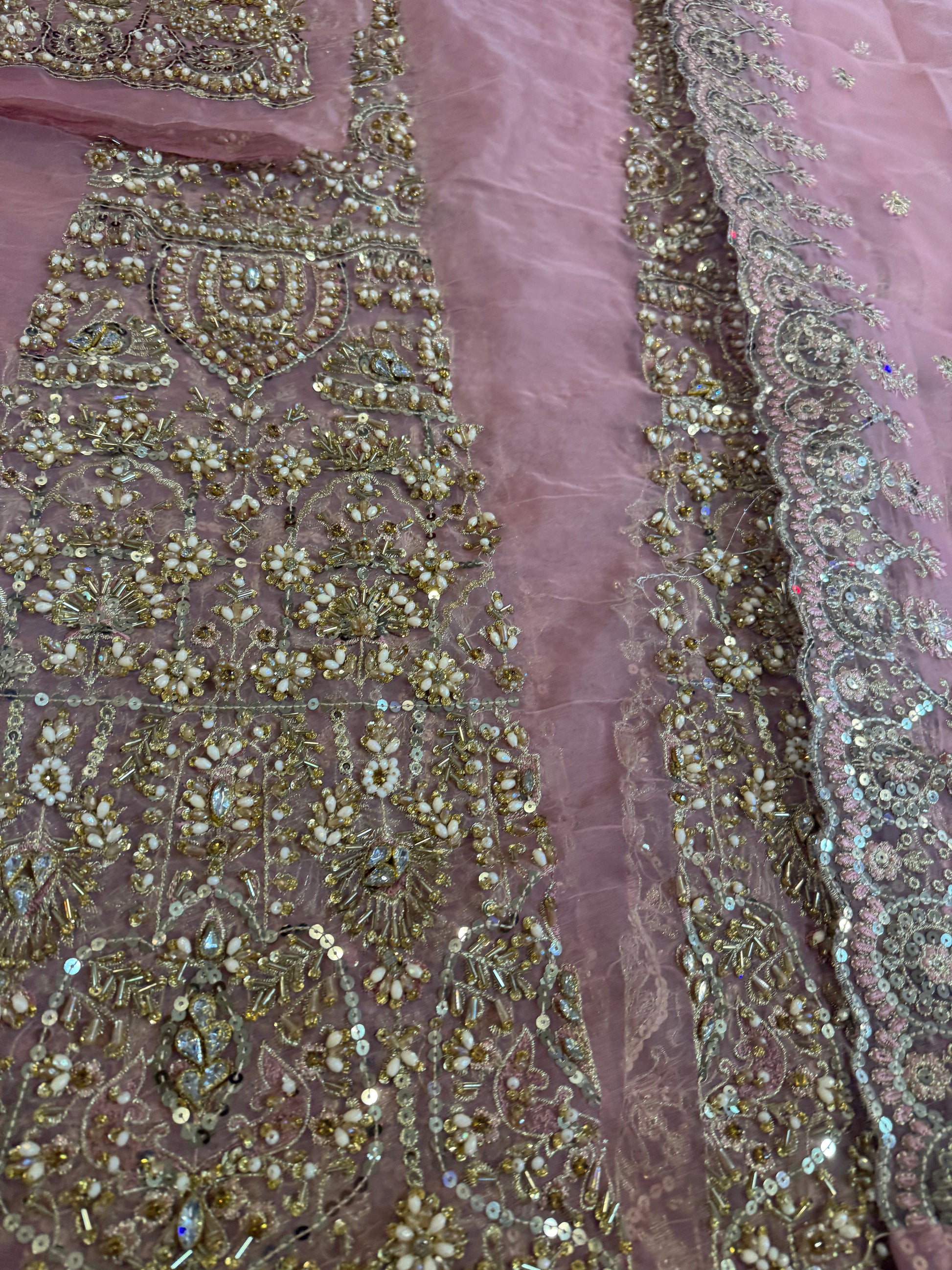 Description: Reflecting true artistry, Prenia is a contemporary rendition of a classic silhouette. Crafted from a dusty rose pink net, the lehnga and choli feature lavishly adorned gota, resham and sequin embellishments. Elevating the piece further is the diaphanous net dupatta, rich with delicate adornments, ensuring you look memorable at every celebration.