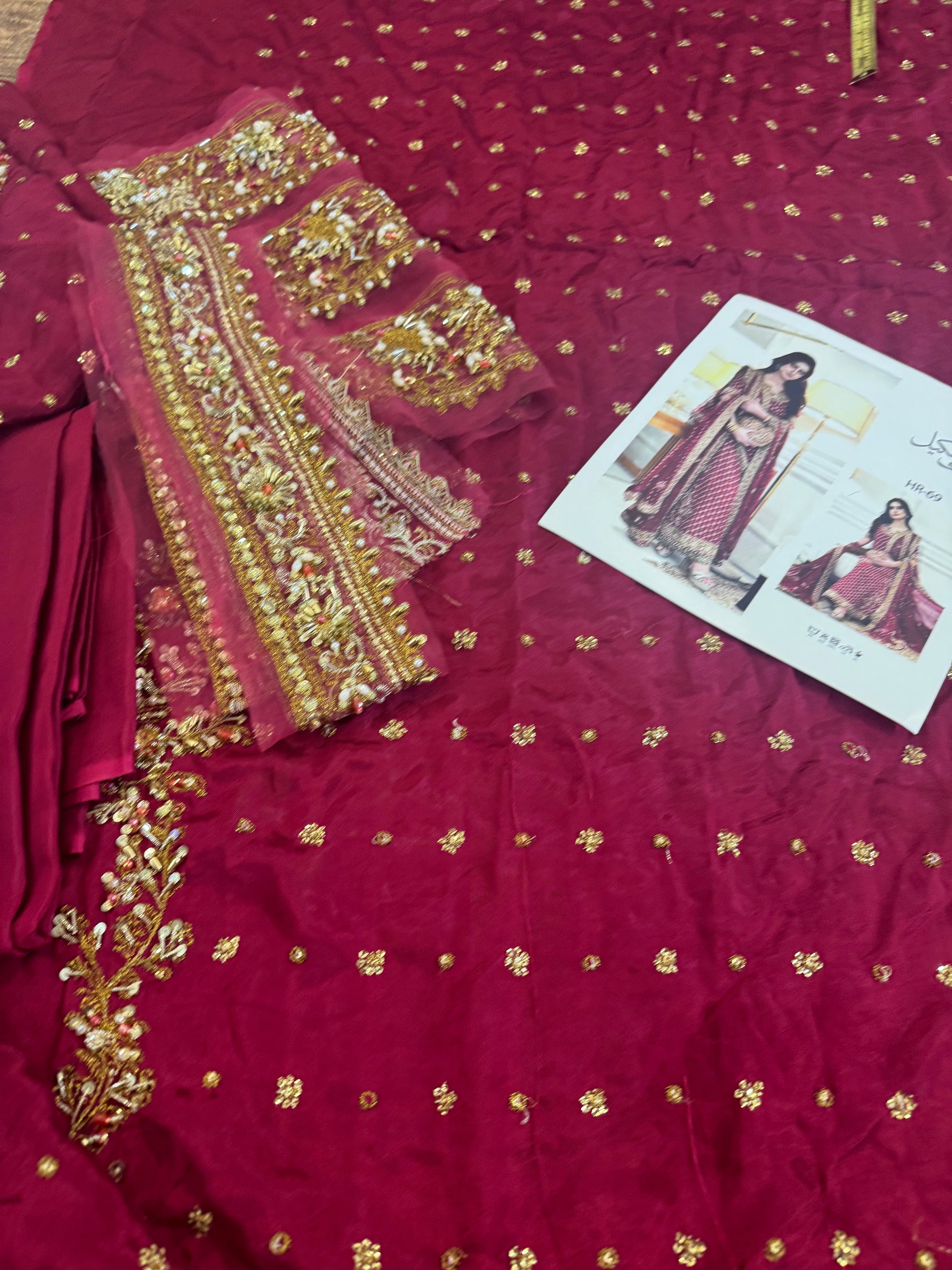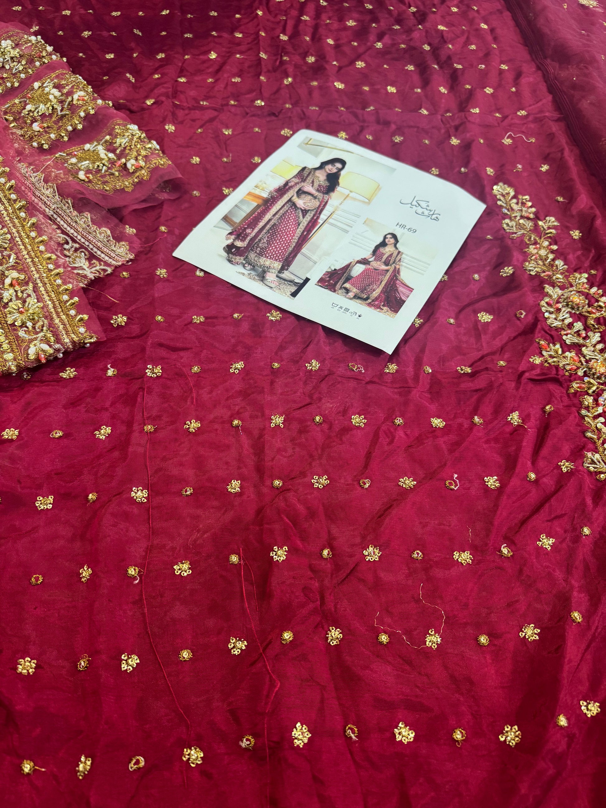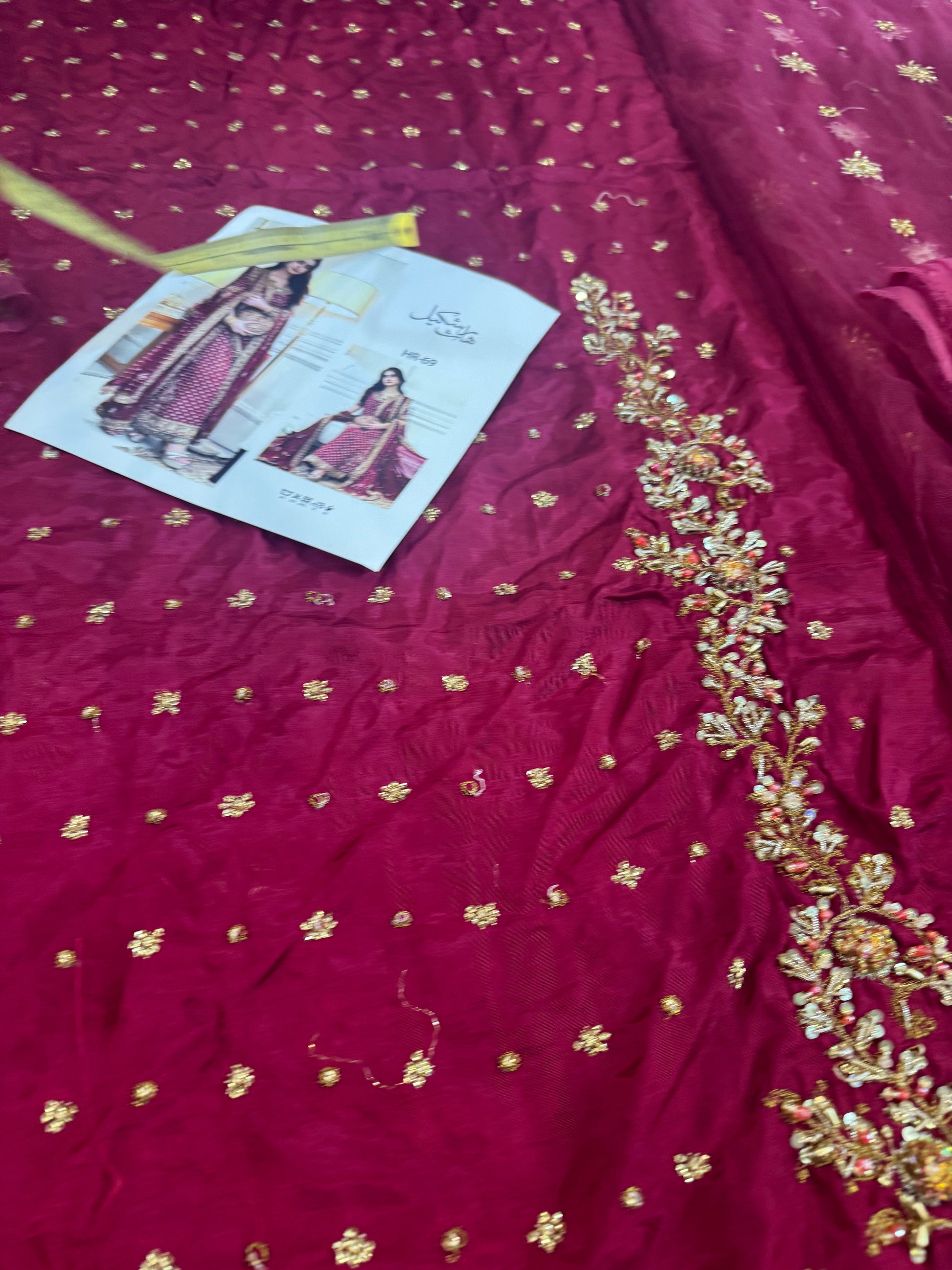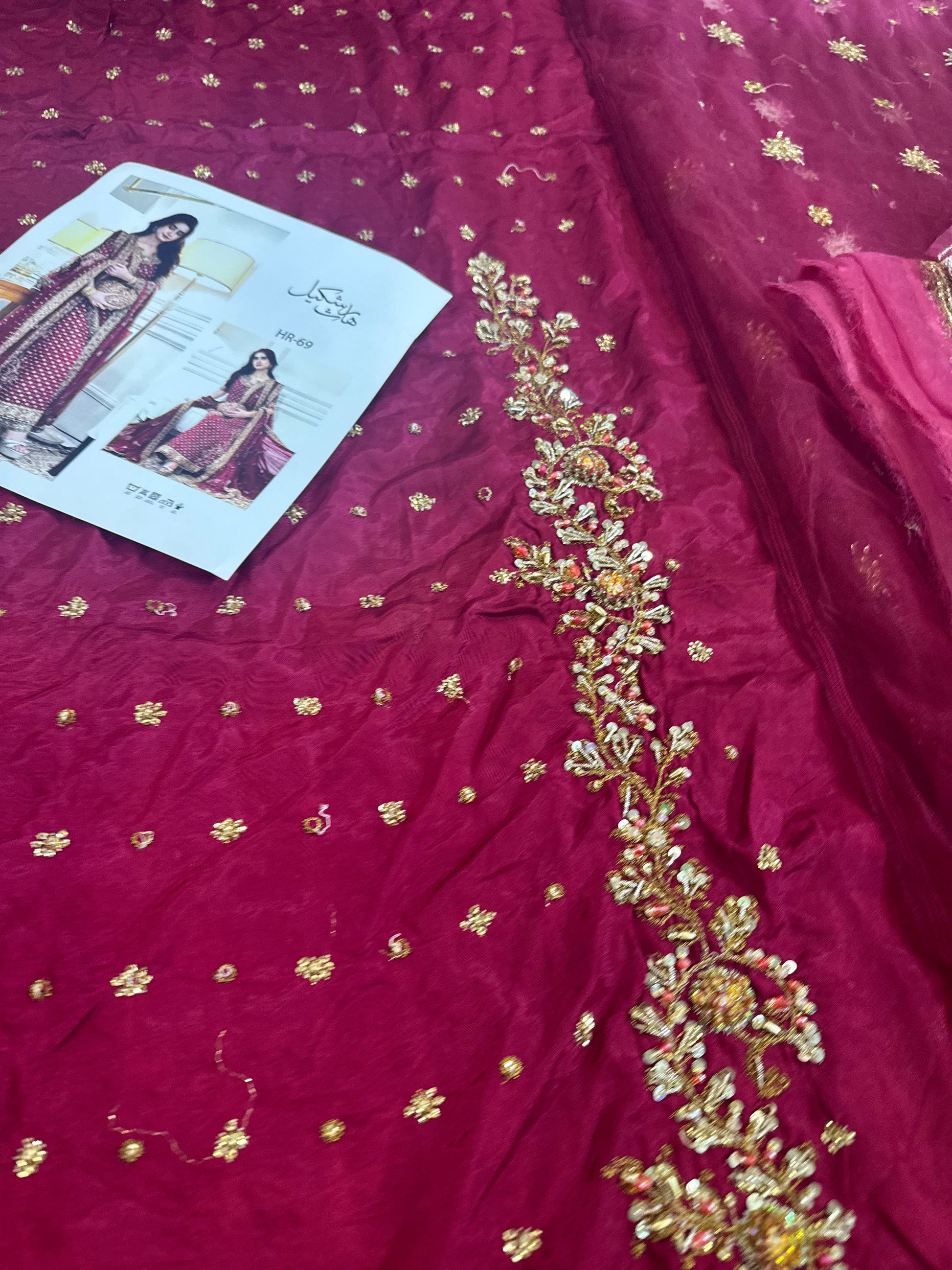 This Haris Shakeel bridal ensemble, from the brand's 'Faushia' wedding collection, is a stunning example of their intricate craftsmanship. The shocking pink outfit is adorned with a detailed pattern of sequins and traditional hand embellishments like dabka and cora work, creating a luxurious and elegant look. The flowy pure chiffon dupatta, also embellished, adds a graceful touch, while the matching trousers complete the sophisticated silhouette. This outfit is a perfect blend of modern style and traditional Pakistani bridal wear, making it a spectacular choice for any special occasion.