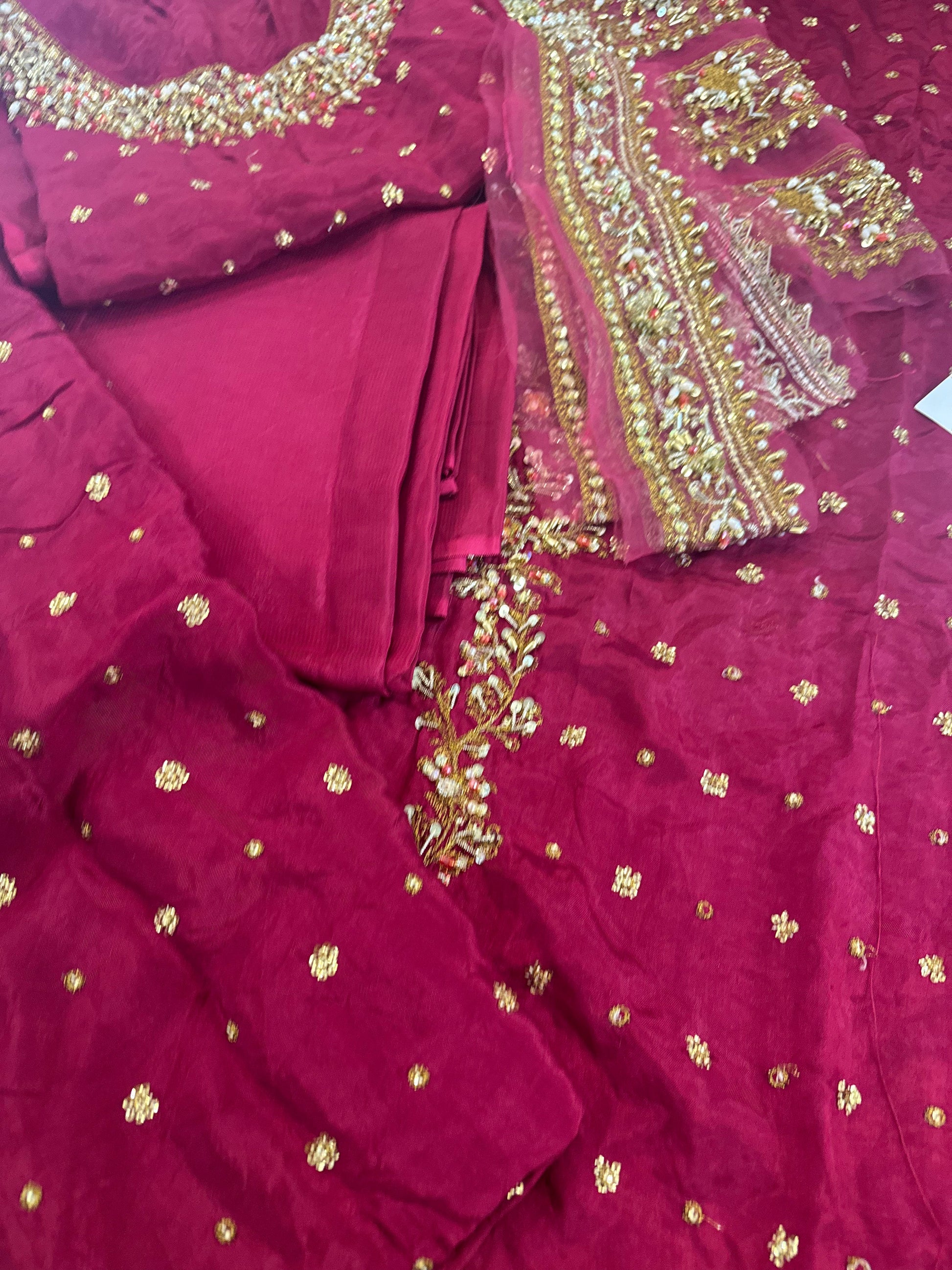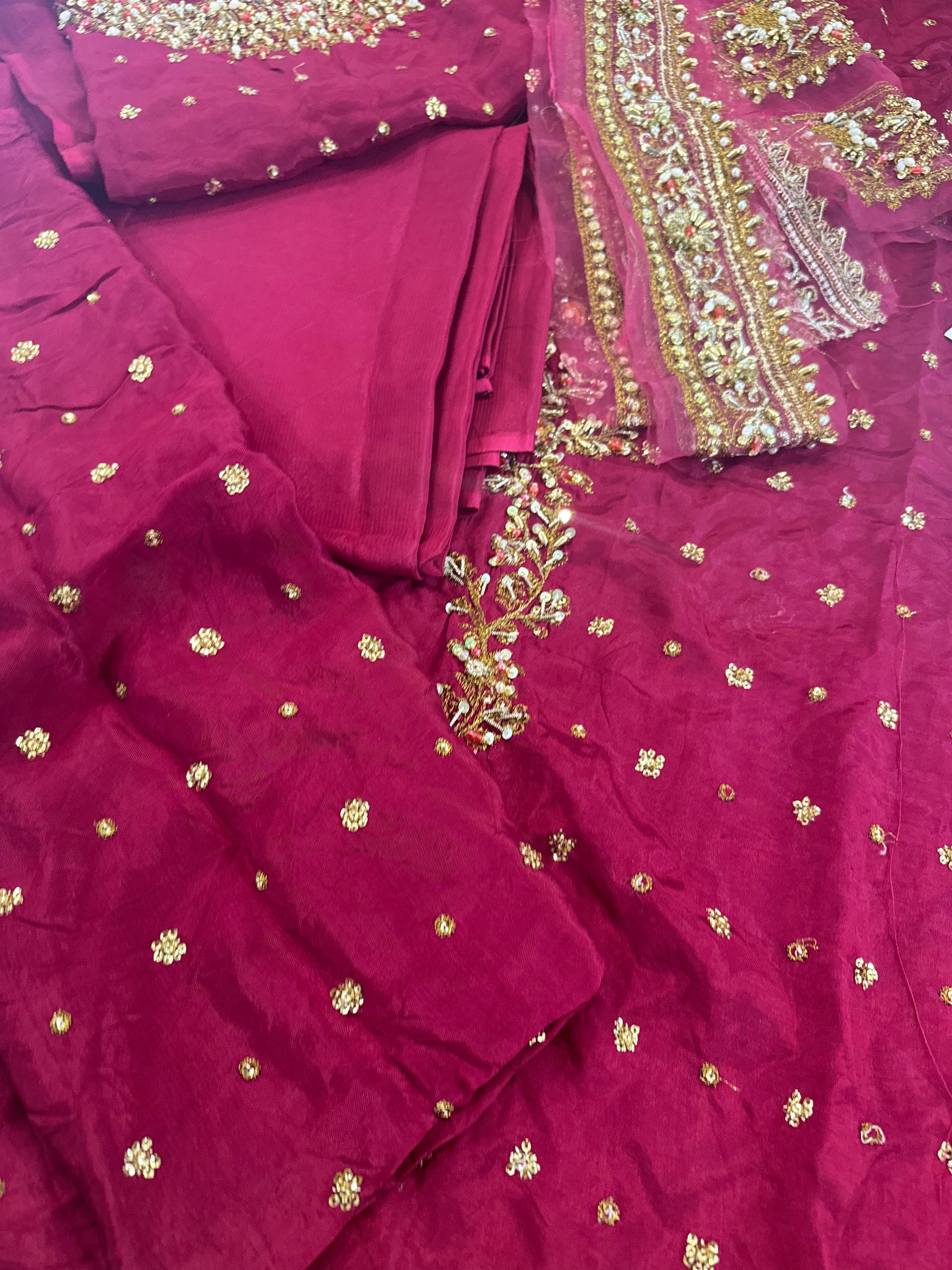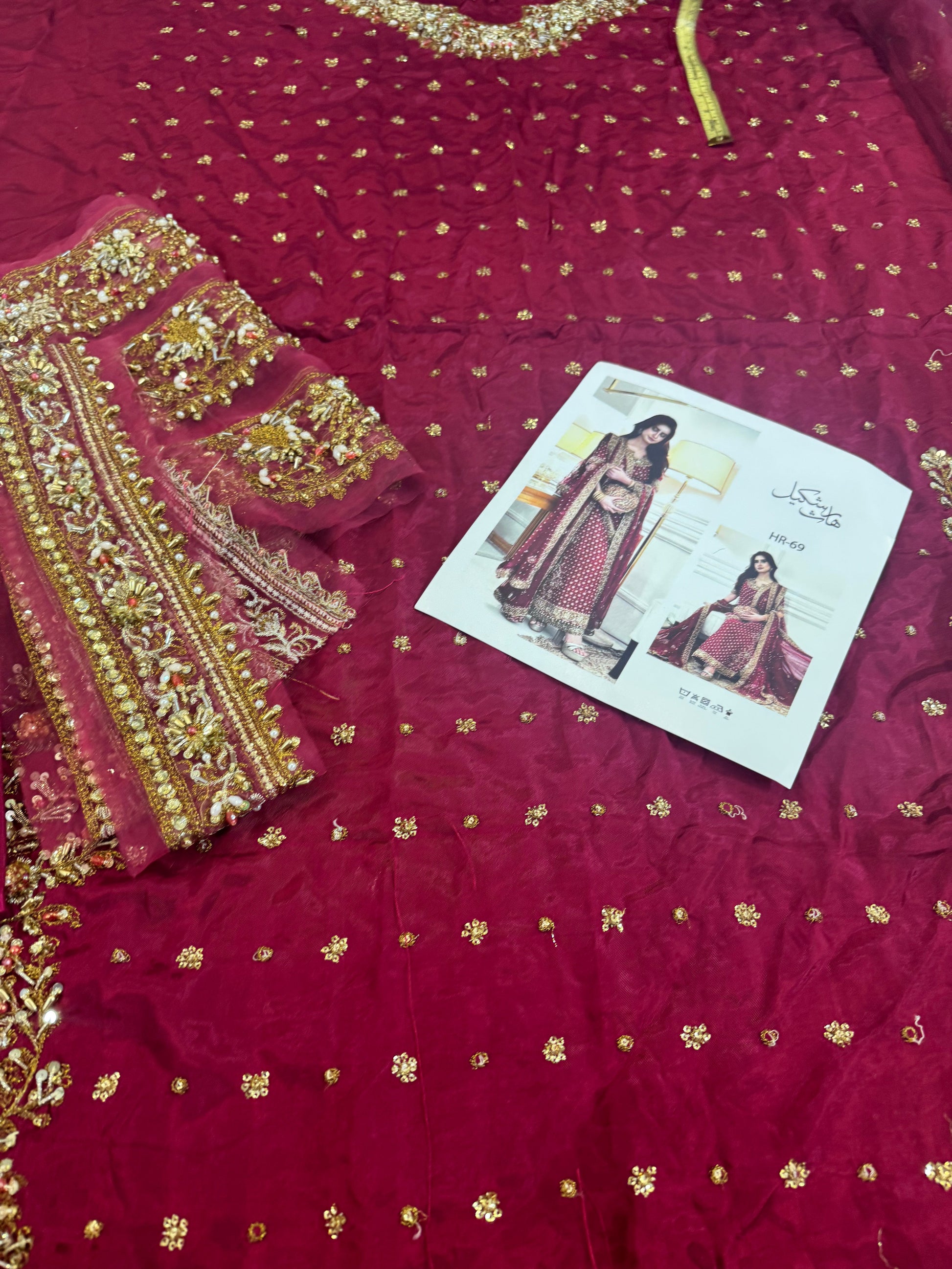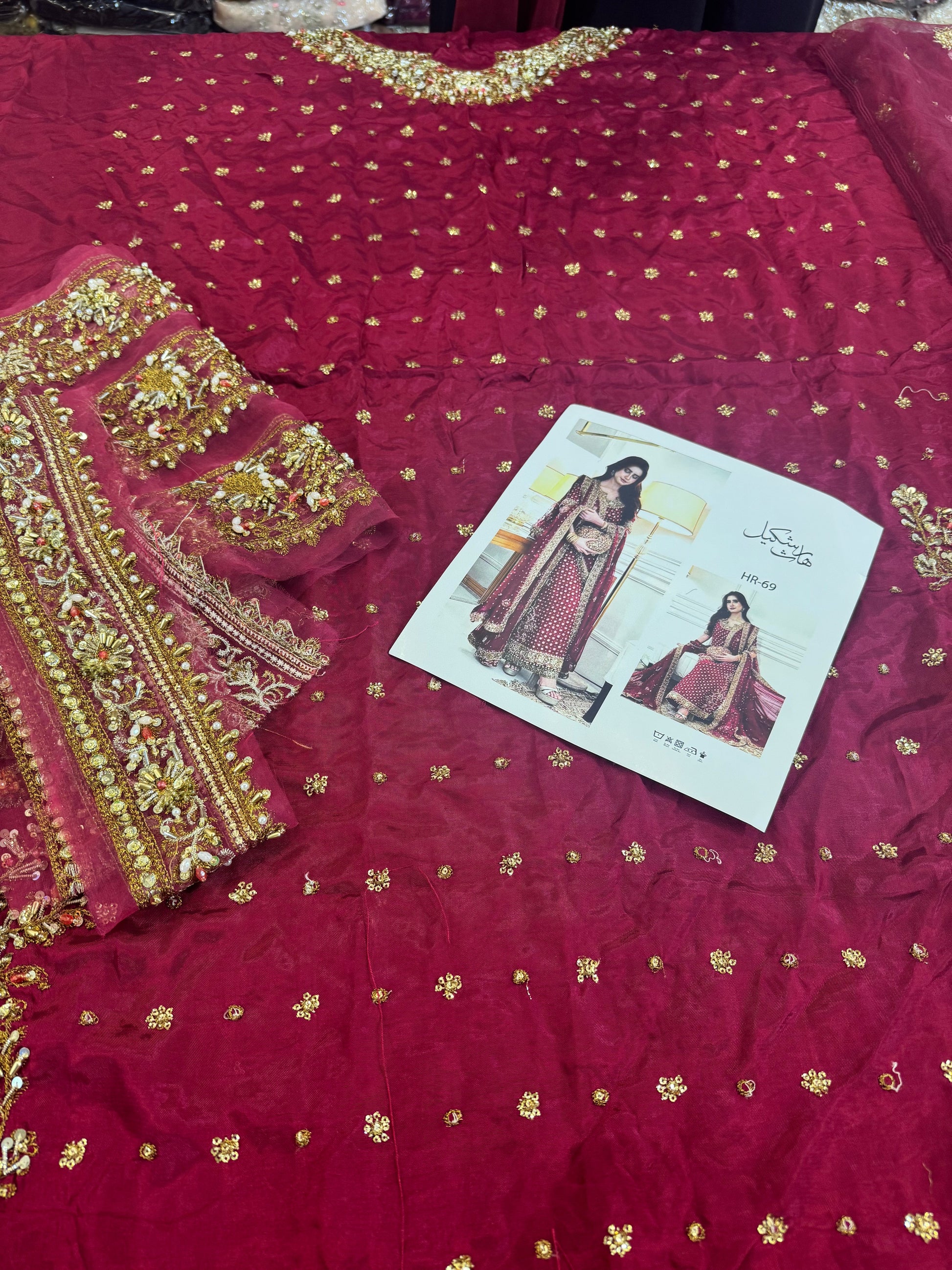 This Haris Shakeel bridal ensemble, from the brand's 'Faushia' wedding collection, is a stunning example of their intricate craftsmanship. The shocking pink outfit is adorned with a detailed pattern of sequins and traditional hand embellishments like dabka and cora work, creating a luxurious and elegant look. The flowy pure chiffon dupatta, also embellished, adds a graceful touch, while the matching trousers complete the sophisticated silhouette. This outfit is a perfect blend of modern style and traditional Pakistani bridal wear, making it a spectacular choice for any special occasion.