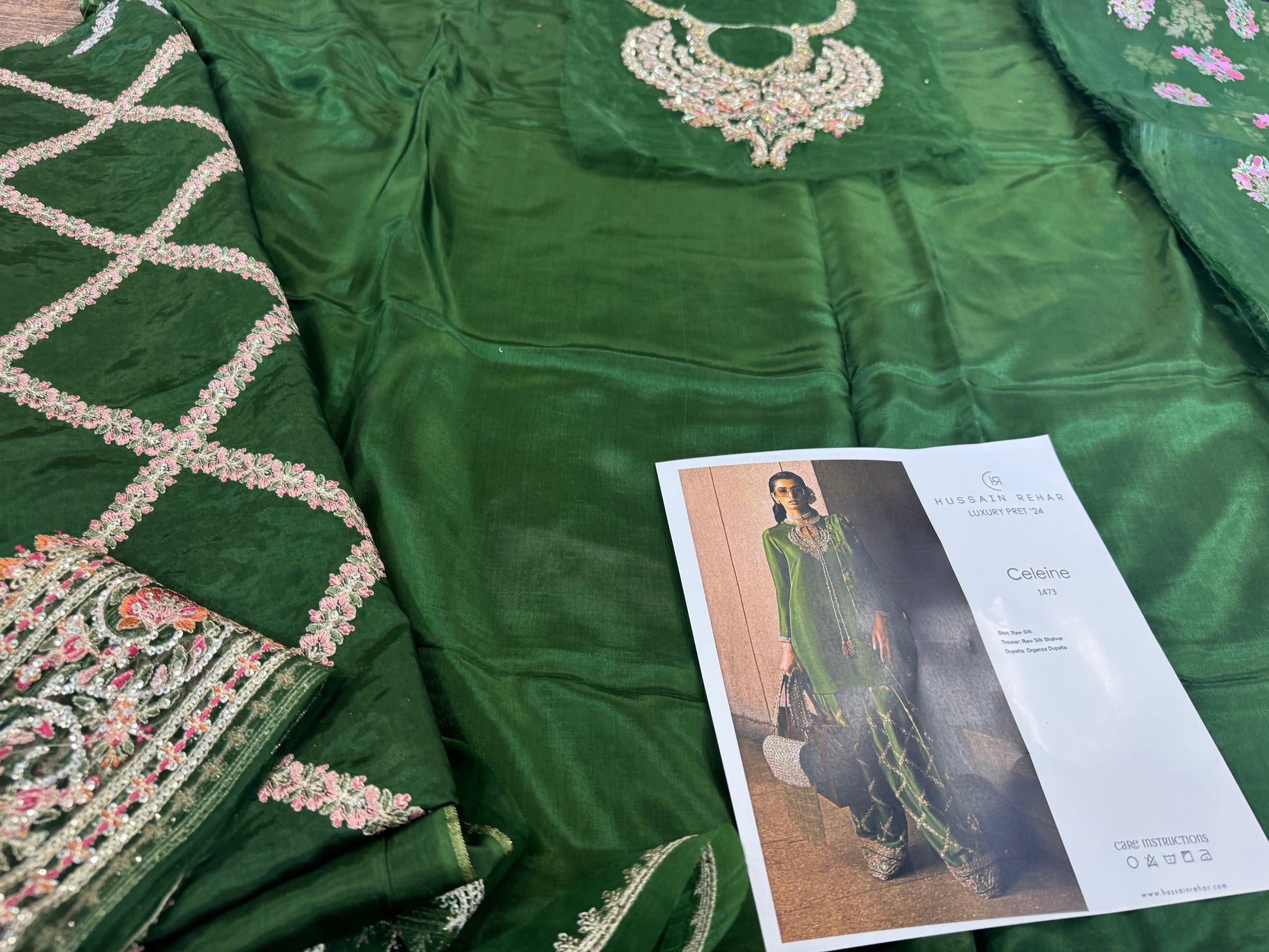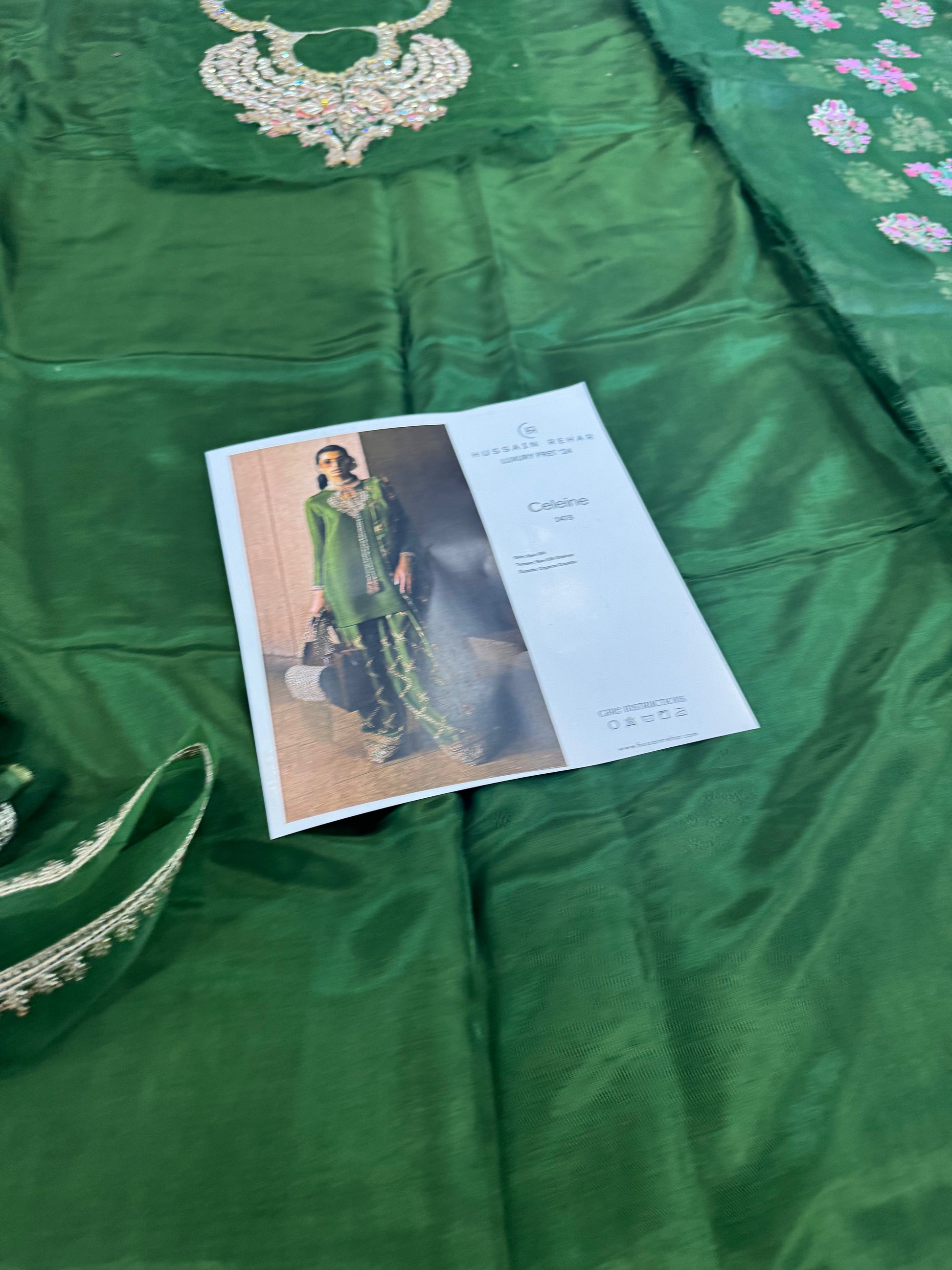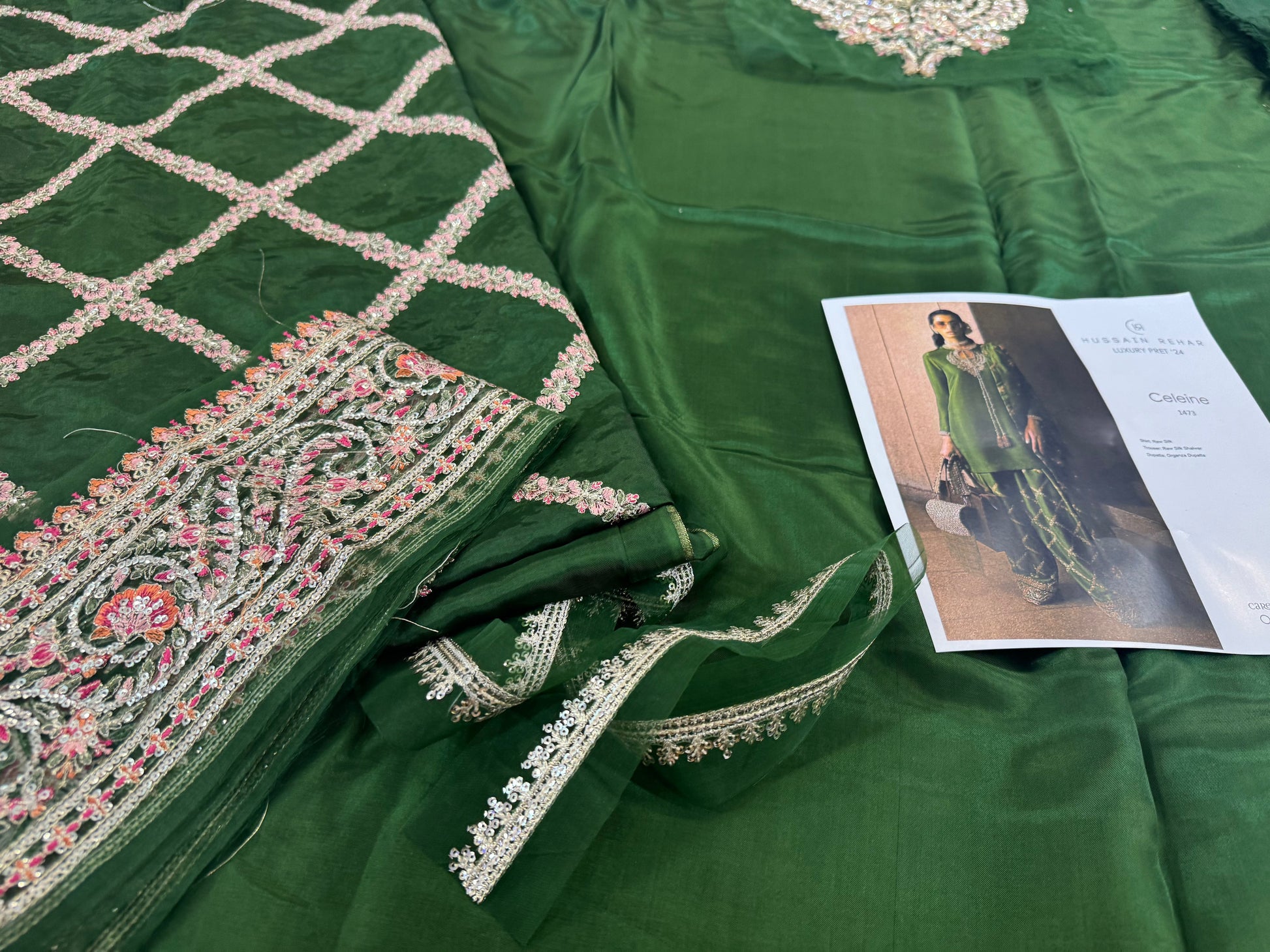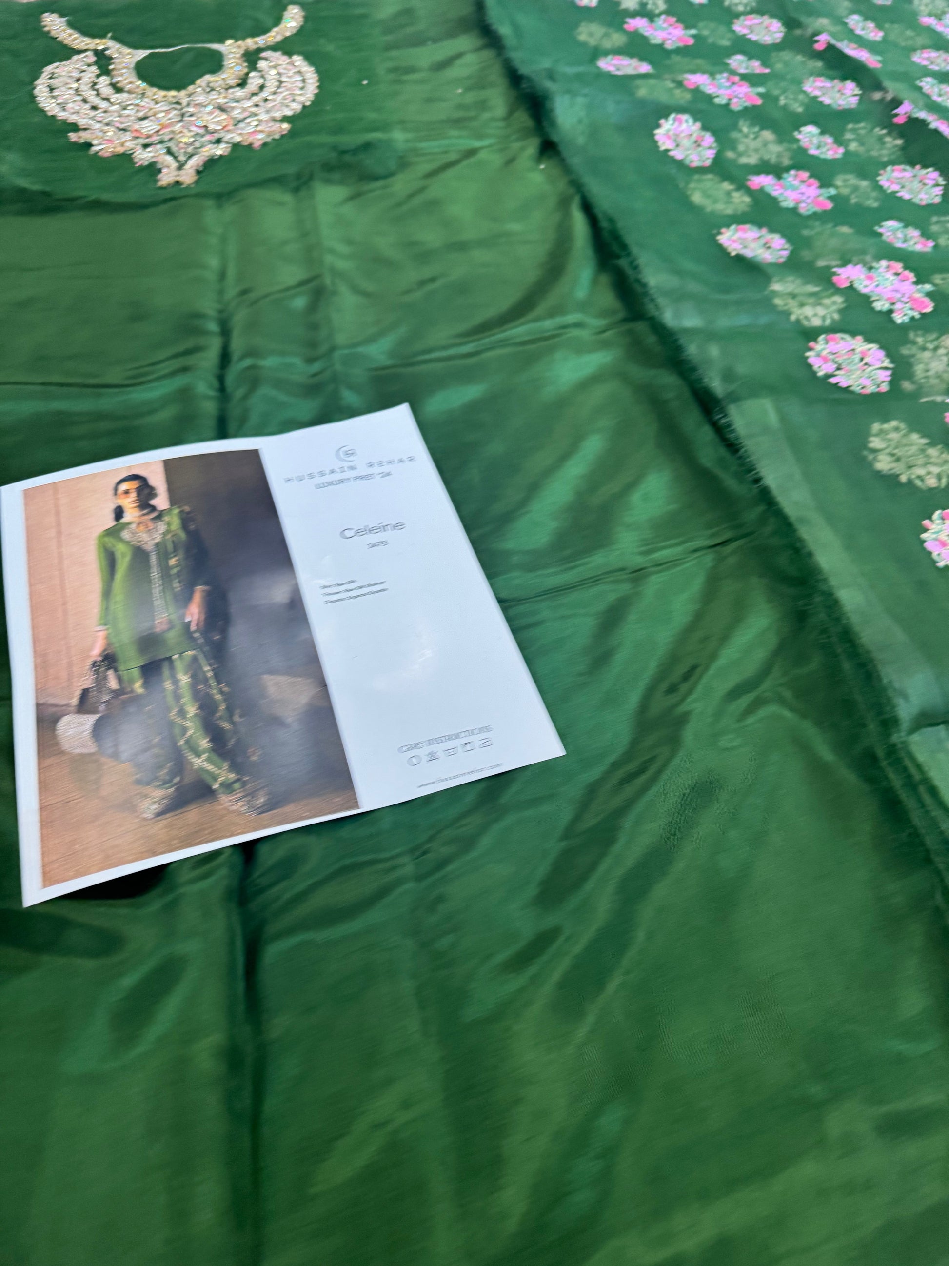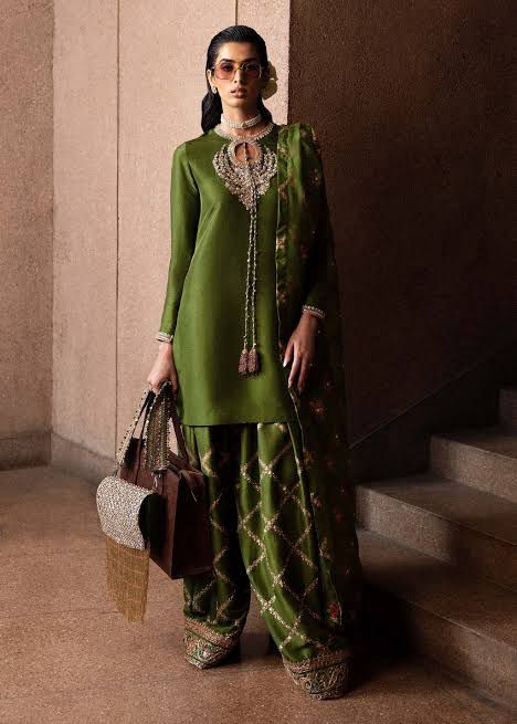 A regal olive green ensemble including a beautiful short raw silk shirt with embellishment detailing on neckline. The neckline is also adorned with gold sequins and naqshi with green, gold and pink buggle beads. It is paired with heavily embroidered and embellished shalwar. It comes with printed organza dupatta with block printed finishing on all four sides.