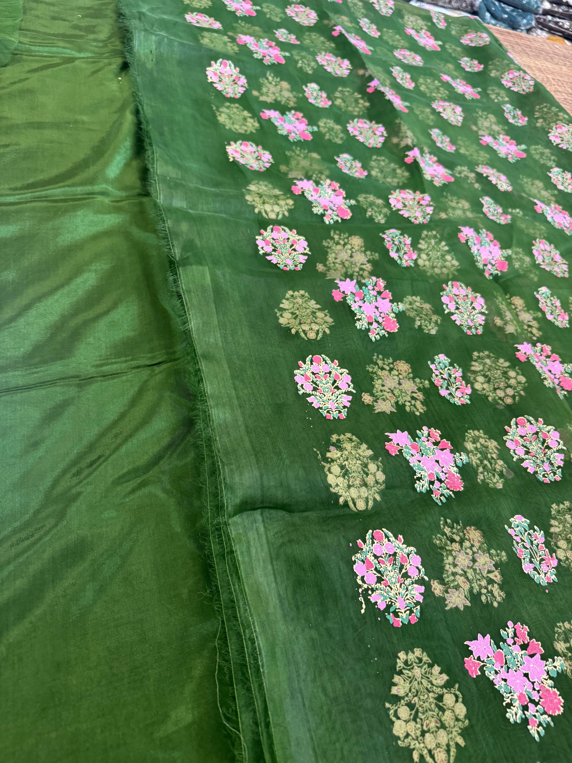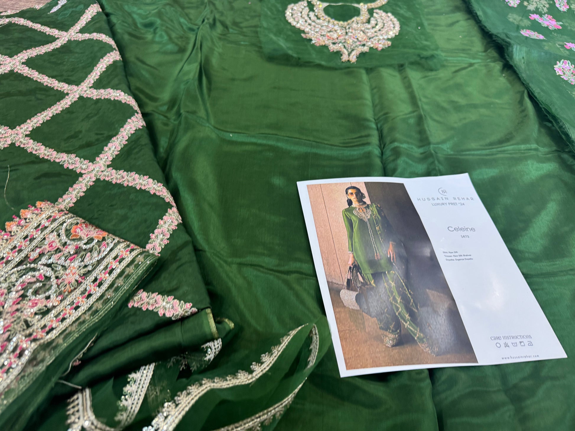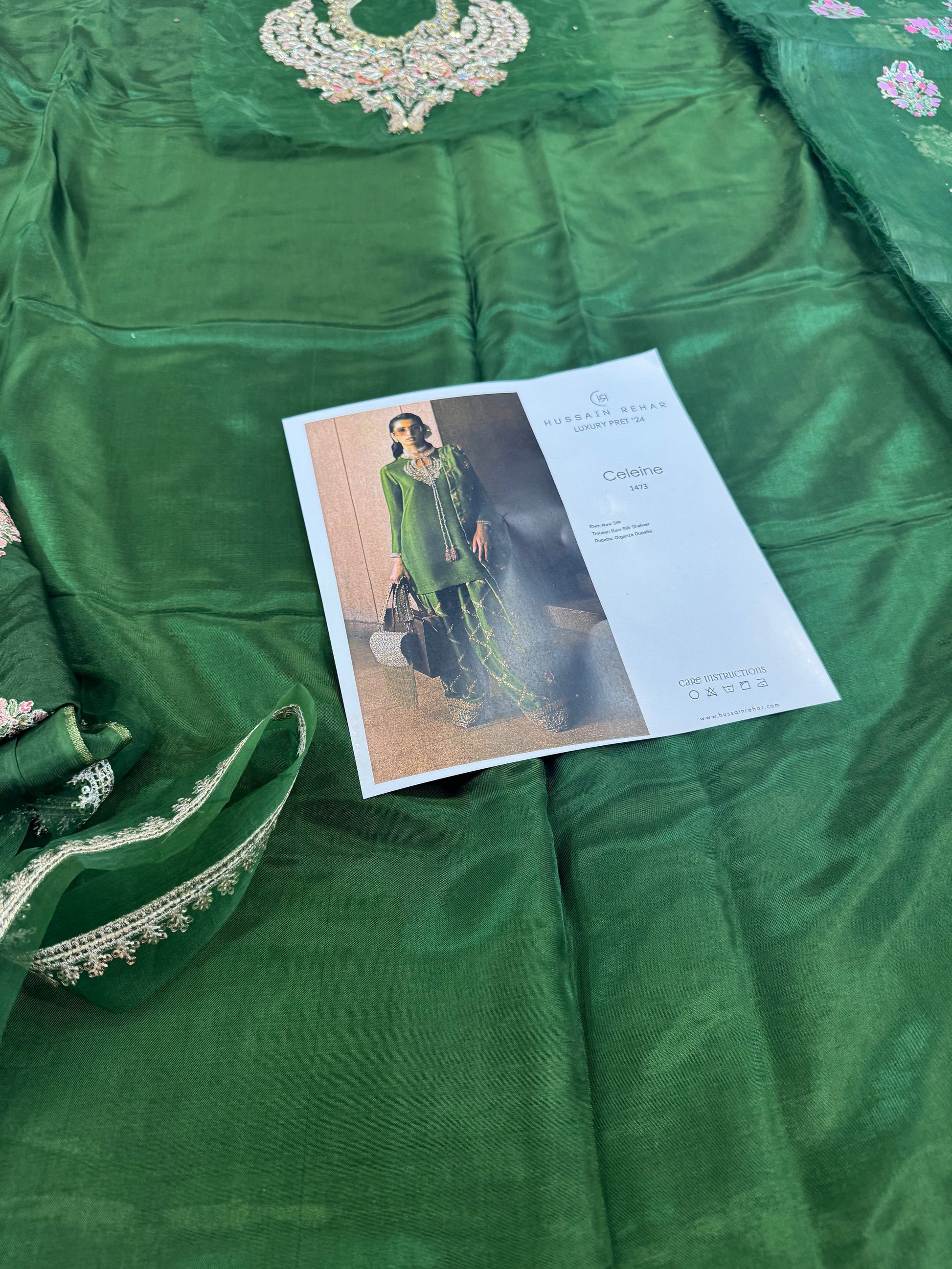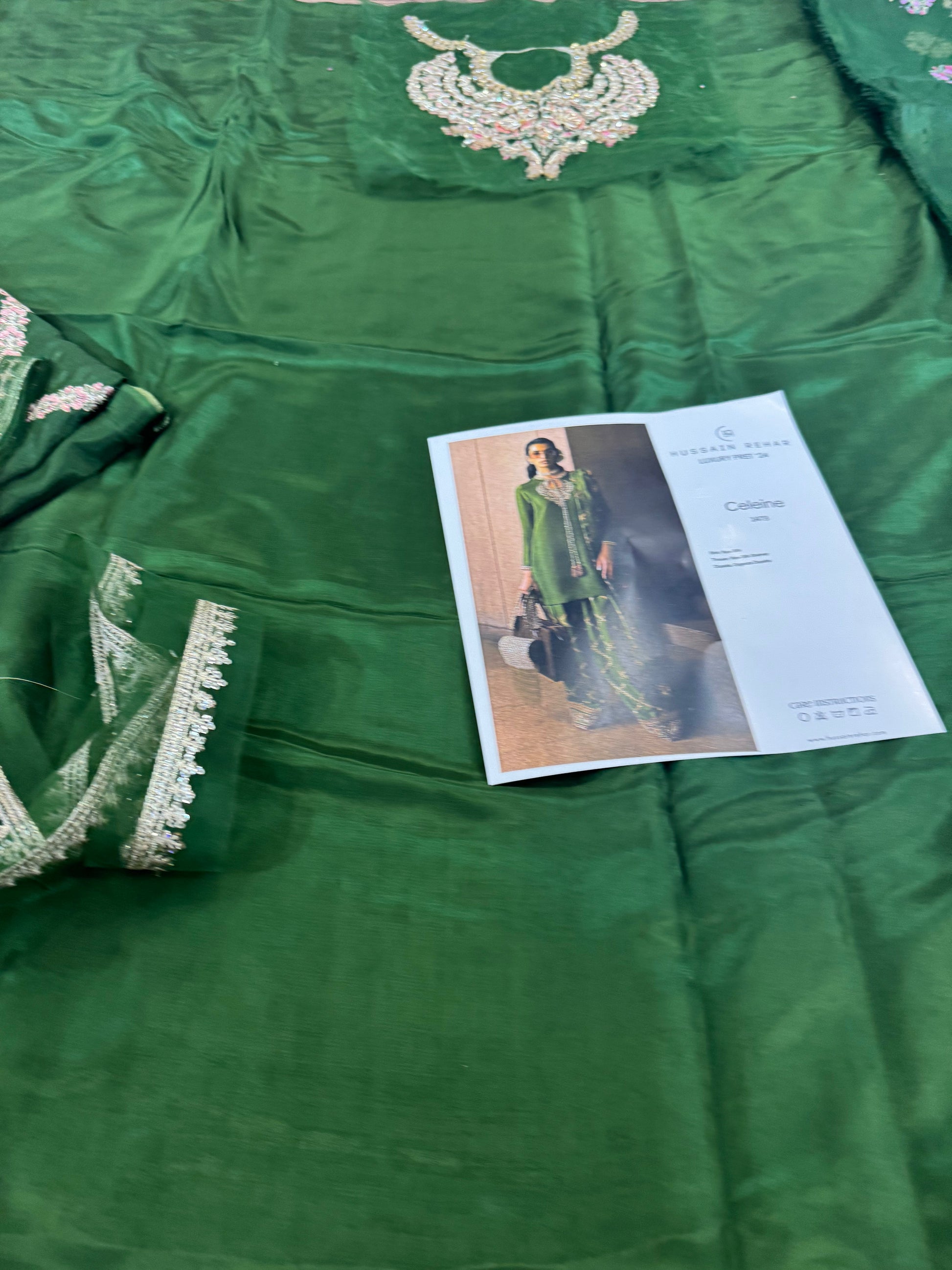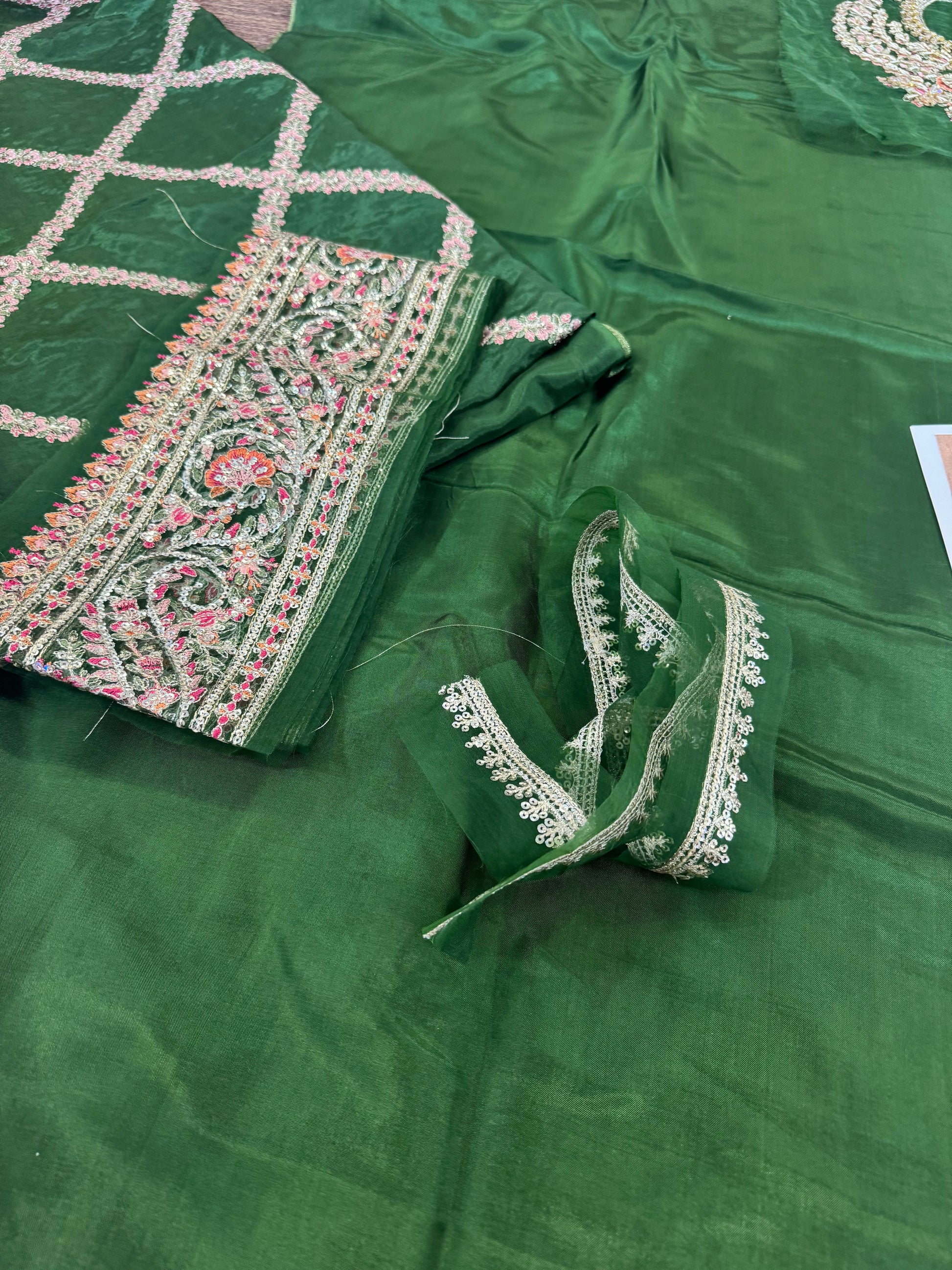 A regal olive green ensemble including a beautiful short raw silk shirt with embellishment detailing on neckline. The neckline is also adorned with gold sequins and naqshi with green, gold and pink buggle beads. It is paired with heavily embroidered and embellished shalwar. It comes with printed organza dupatta with block printed finishing on all four sides.