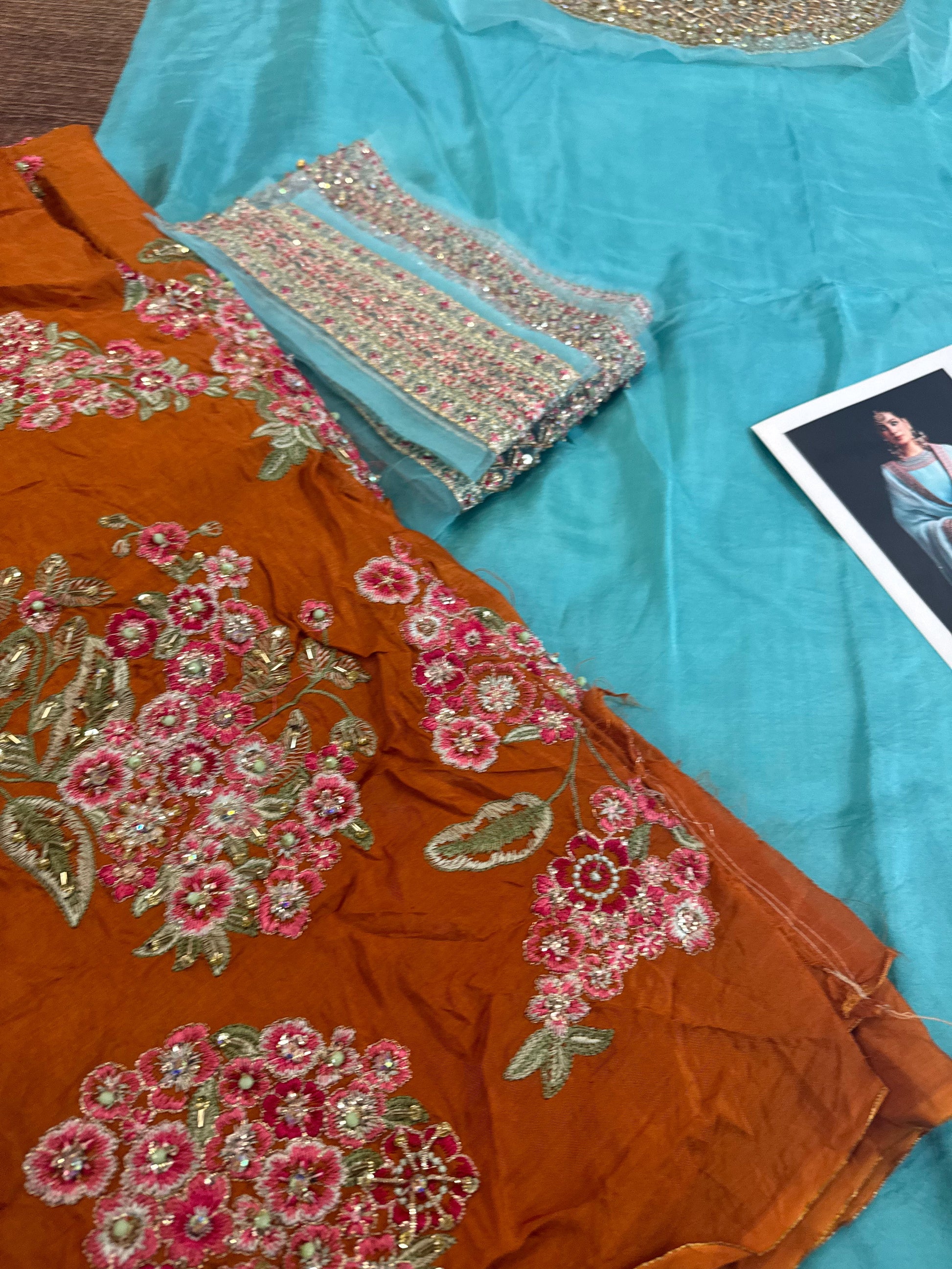 This striking ensemble is the Hussain Rehar Wedding Edition HR Sky Rust chiffon bridal suit, a beautiful creation from the renowned designer, Hussain Rehar. Falling under the chiffon bridal category, the outfit features an enchanting 'HR Sky' blue/green short kameez and dupatta, both delicately adorned with shimmering pink/red/rust borders and embellishments, contrasting dramatically with heavily embroidered, rich 'Rust' orange-gold gharara or wide-leg trousers, all combining for a luxurious and festive look, with a competitive approximate price of Rs. 21,500 PKR for an unstitched or replica version as suggested by related search results.