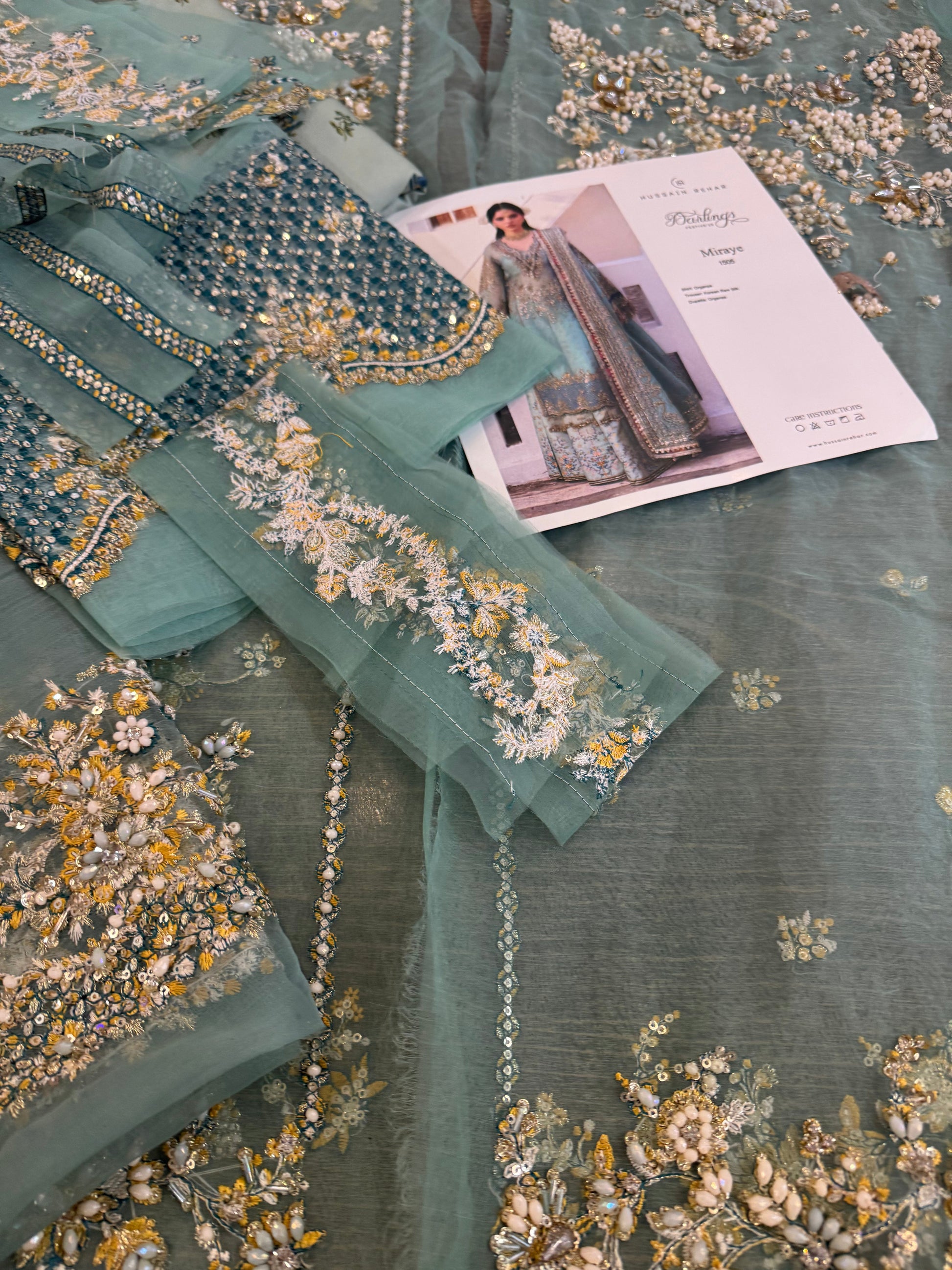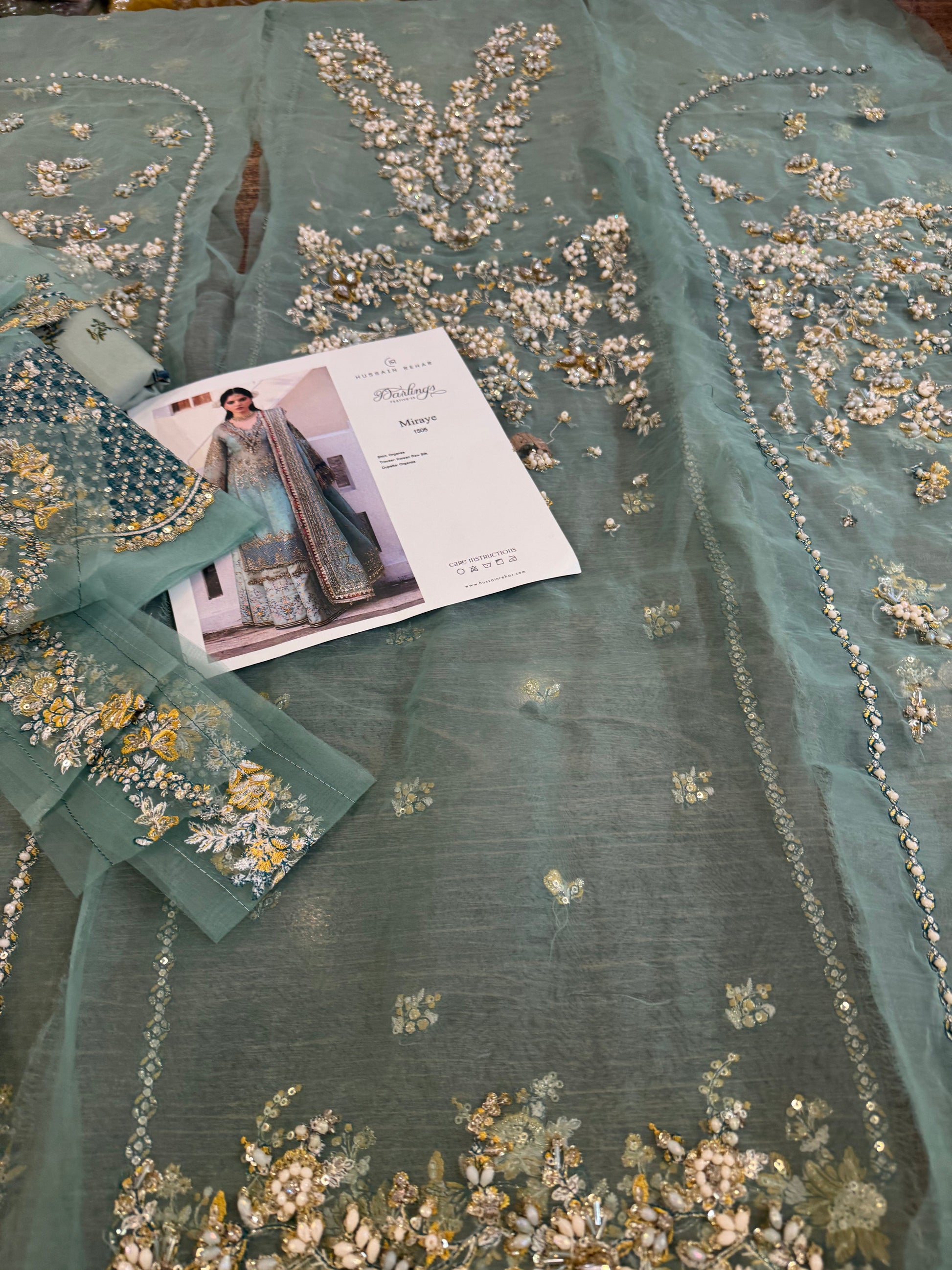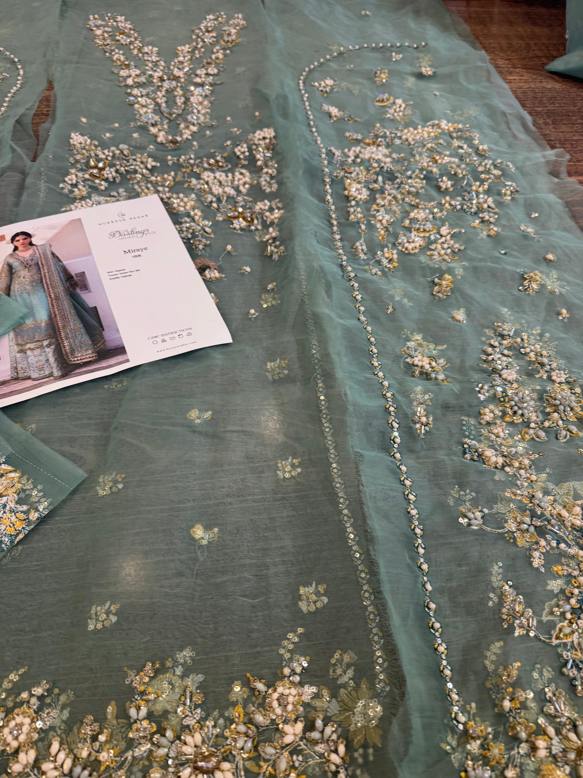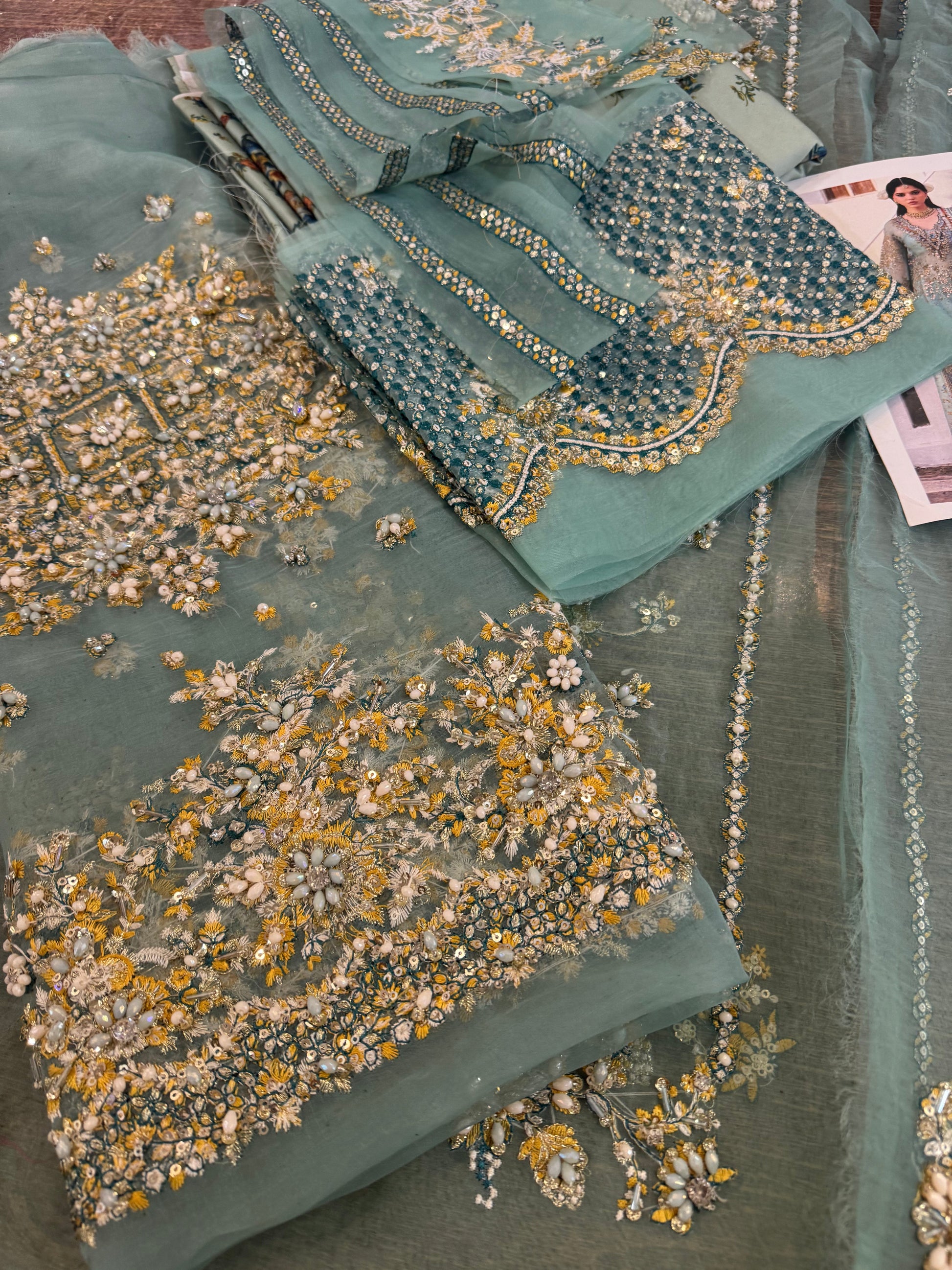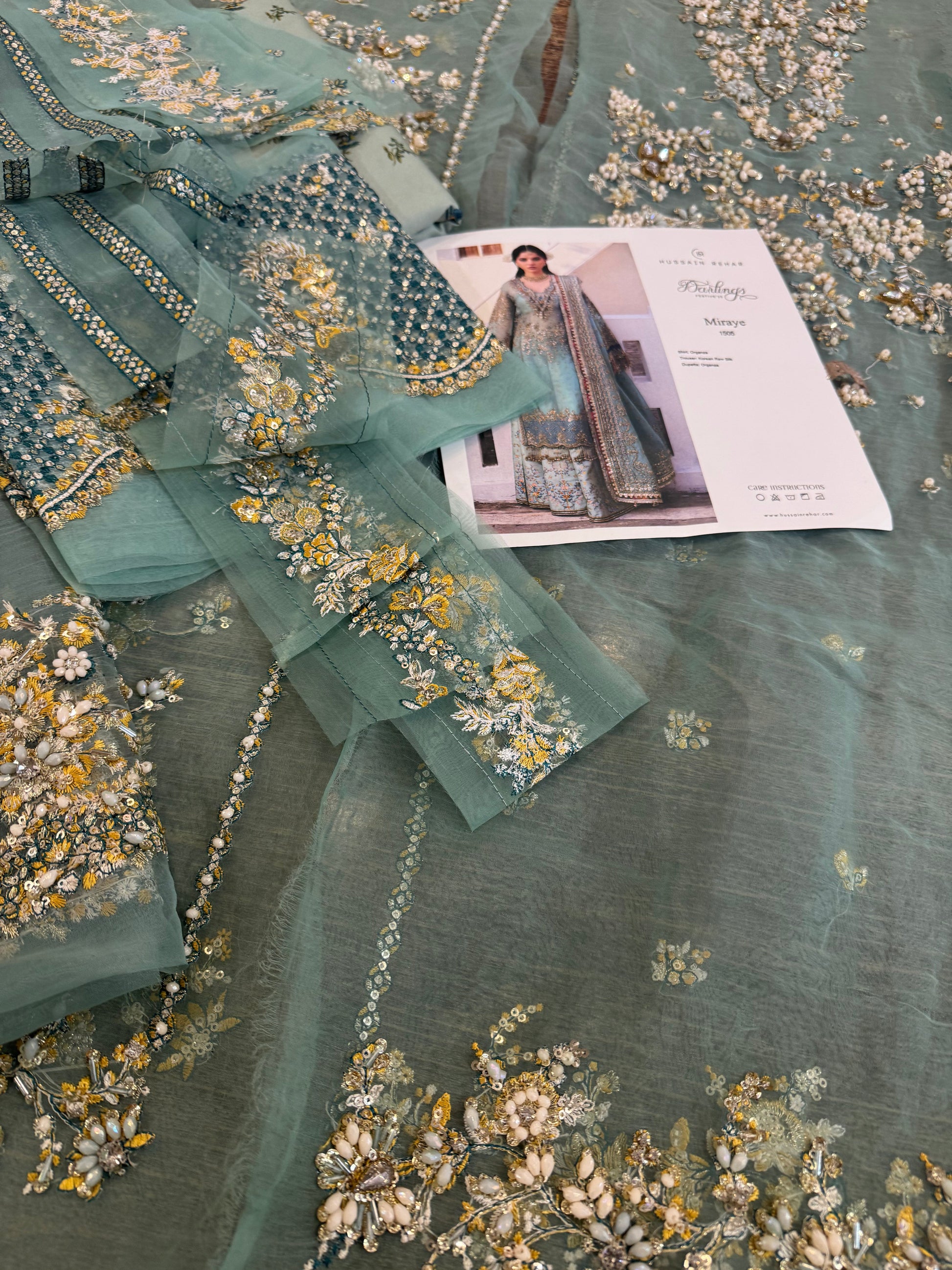 An intricate details on embroidered organza shirt adds a touch of elegance and glamour to the overall design. This shirt is paired with a digitally printed Korean raw-silk sharara. Lastly, the organza sequin-embroidered dupatta borders lend a graceful and modern touch. All these elements together truly make it a mesmerizing outfit that is sure to make you stand out.