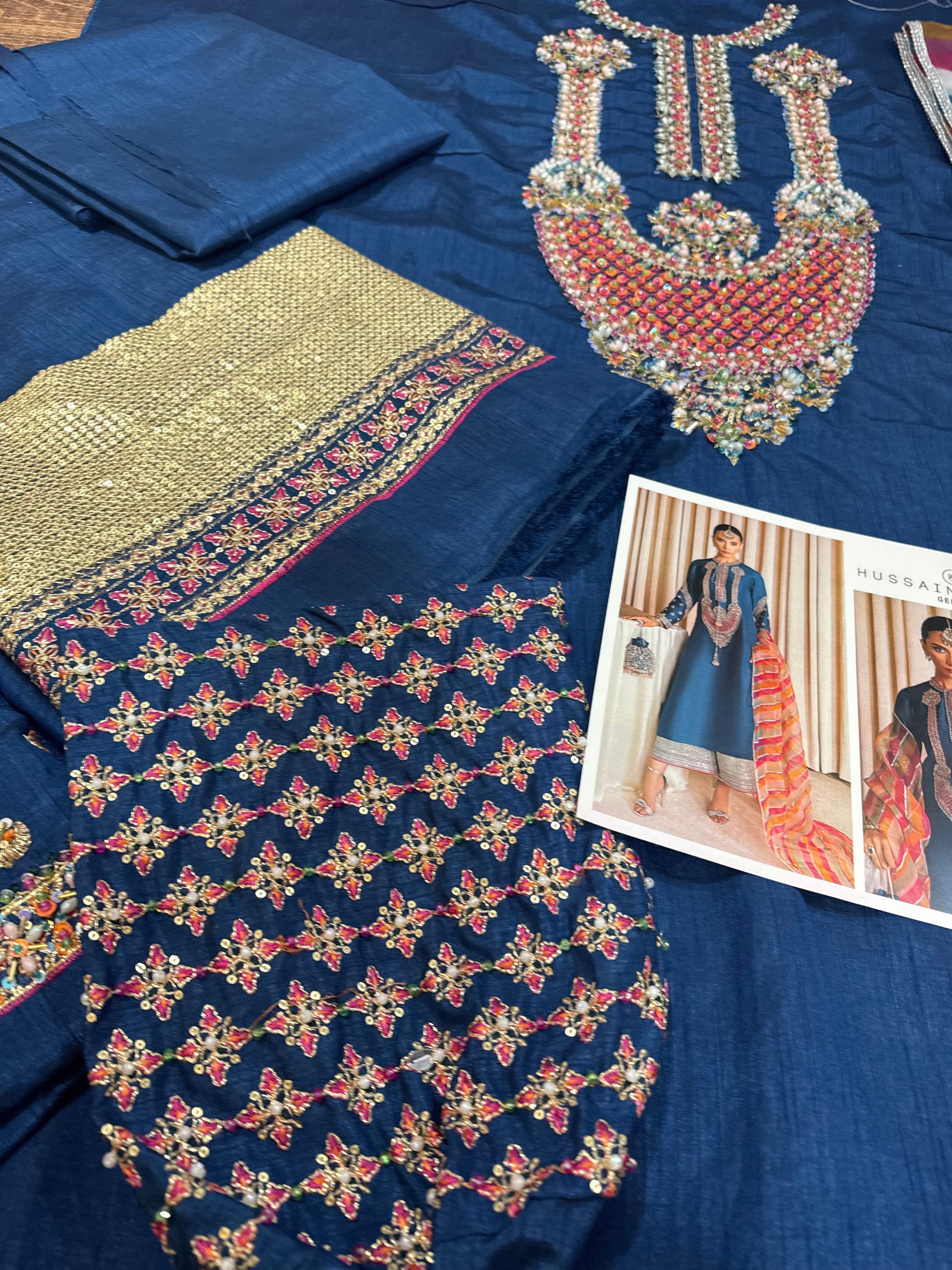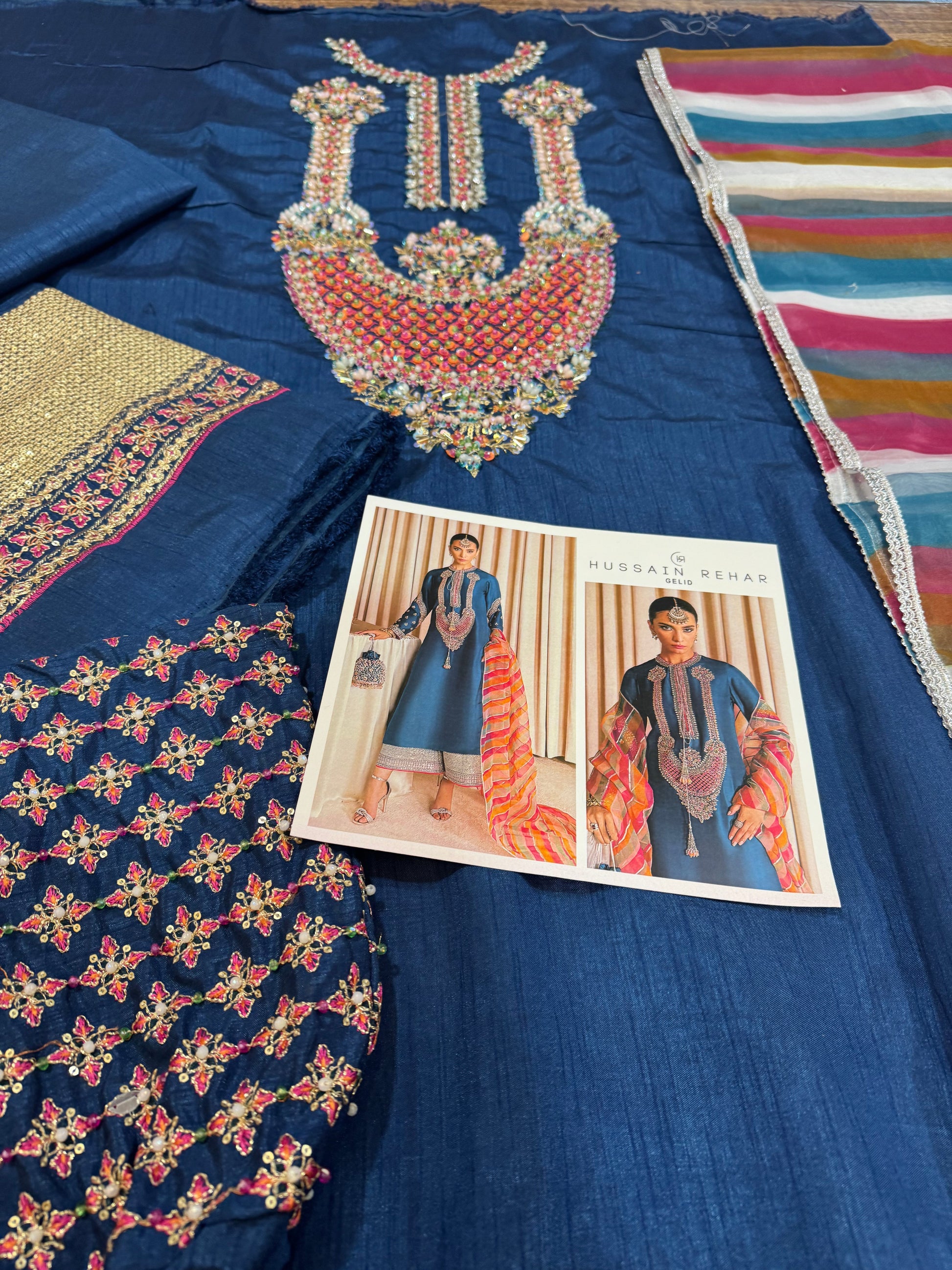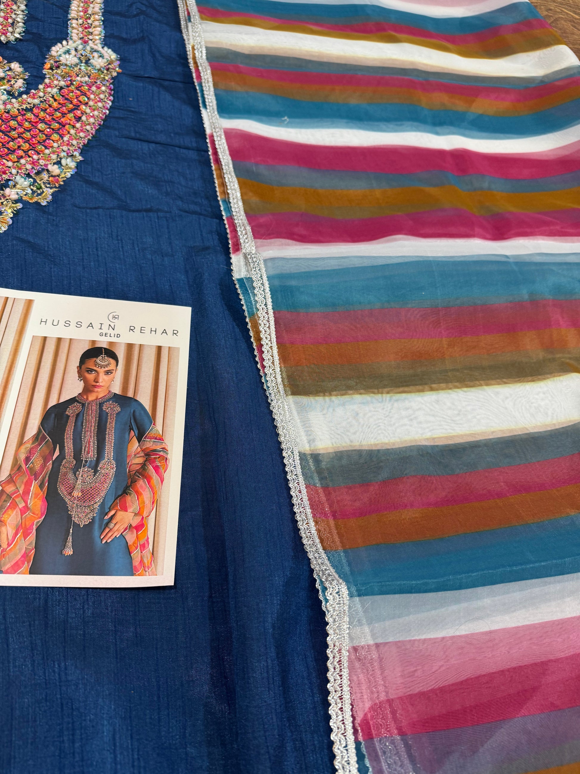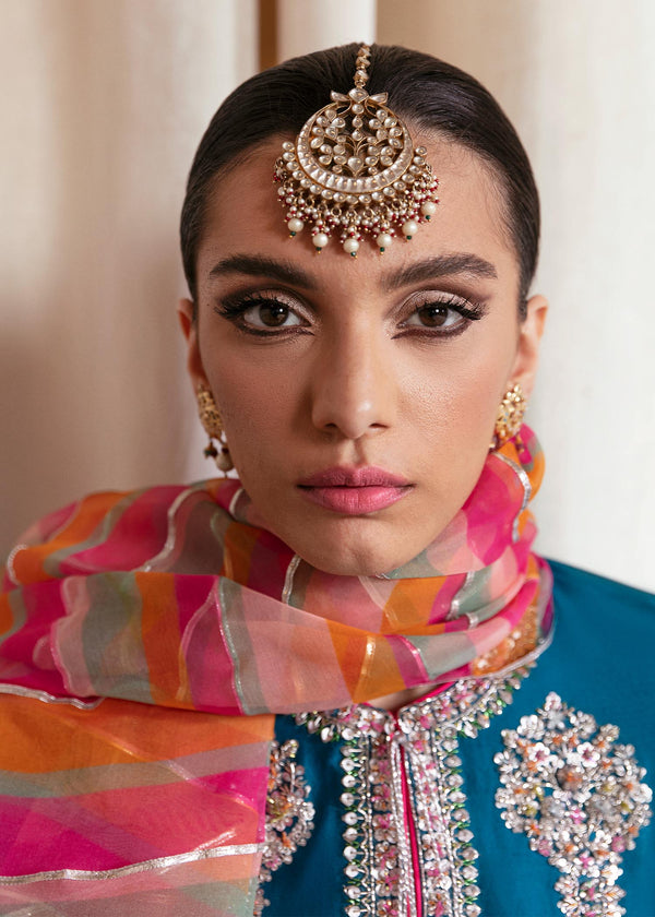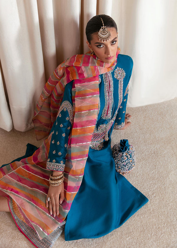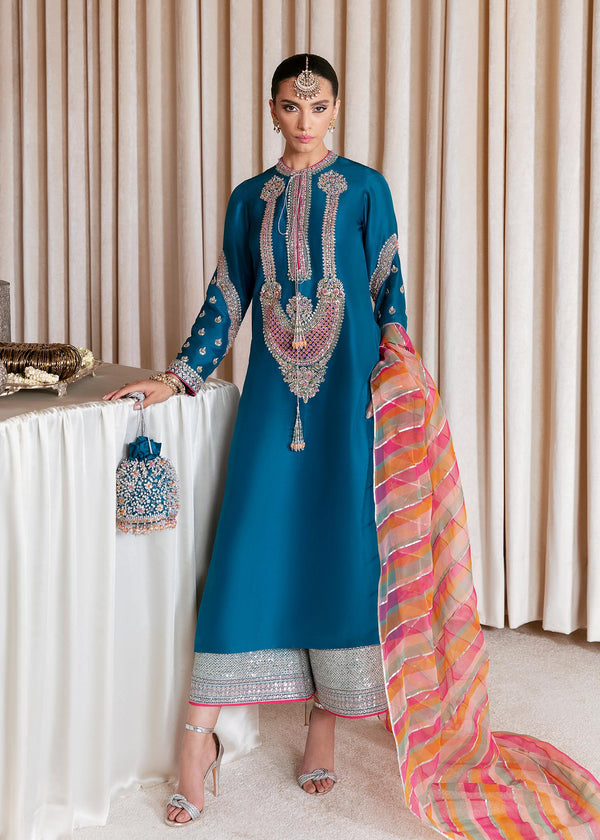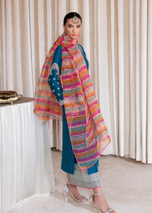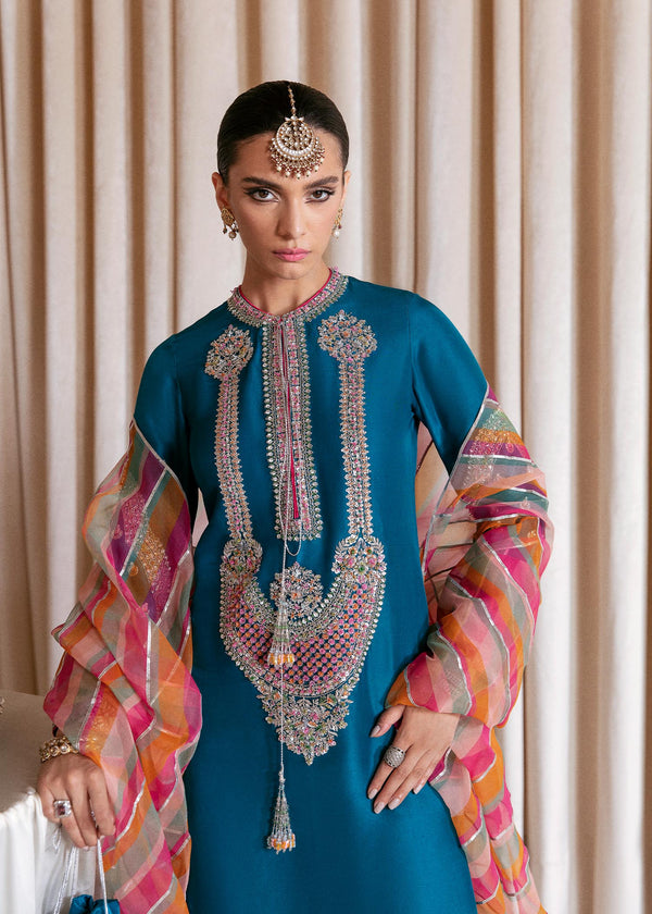 Description: A stunning teal blue raw silk long shirt with tassels and beautiful embellishments in the front of the shirt and on the sleeves. The embellishments include delicate work of nakshi, dabka, sitara and cutdana in the hues of pink, orange, dark green, olive green, silver and iceblue. It comes along with a culotte pant which has pockets on the sides and a fine border of sequins and thread in pink and orange. The outfit consists of a flowy chatta patti organza dupatta in multicolor and gotta finishing