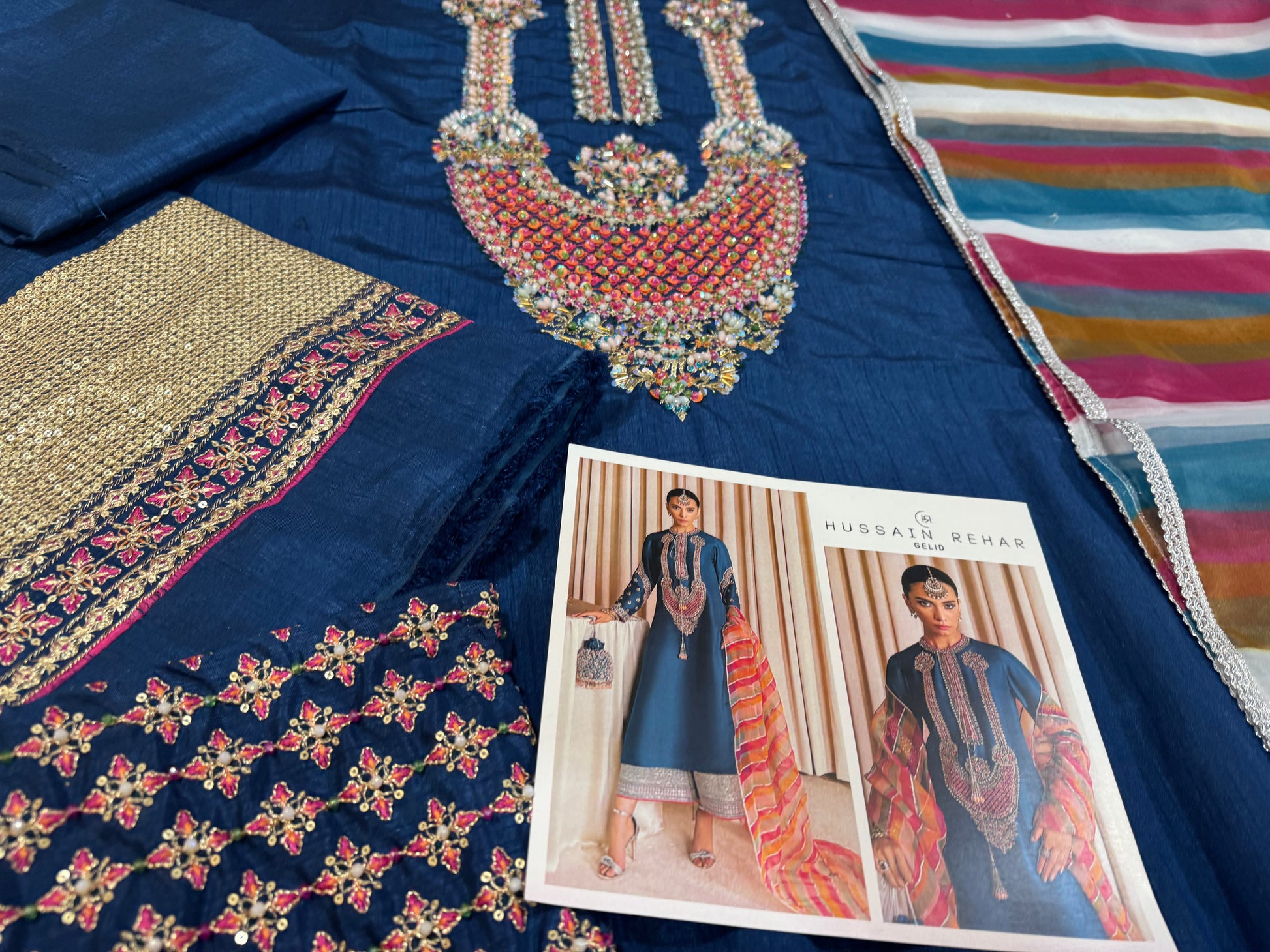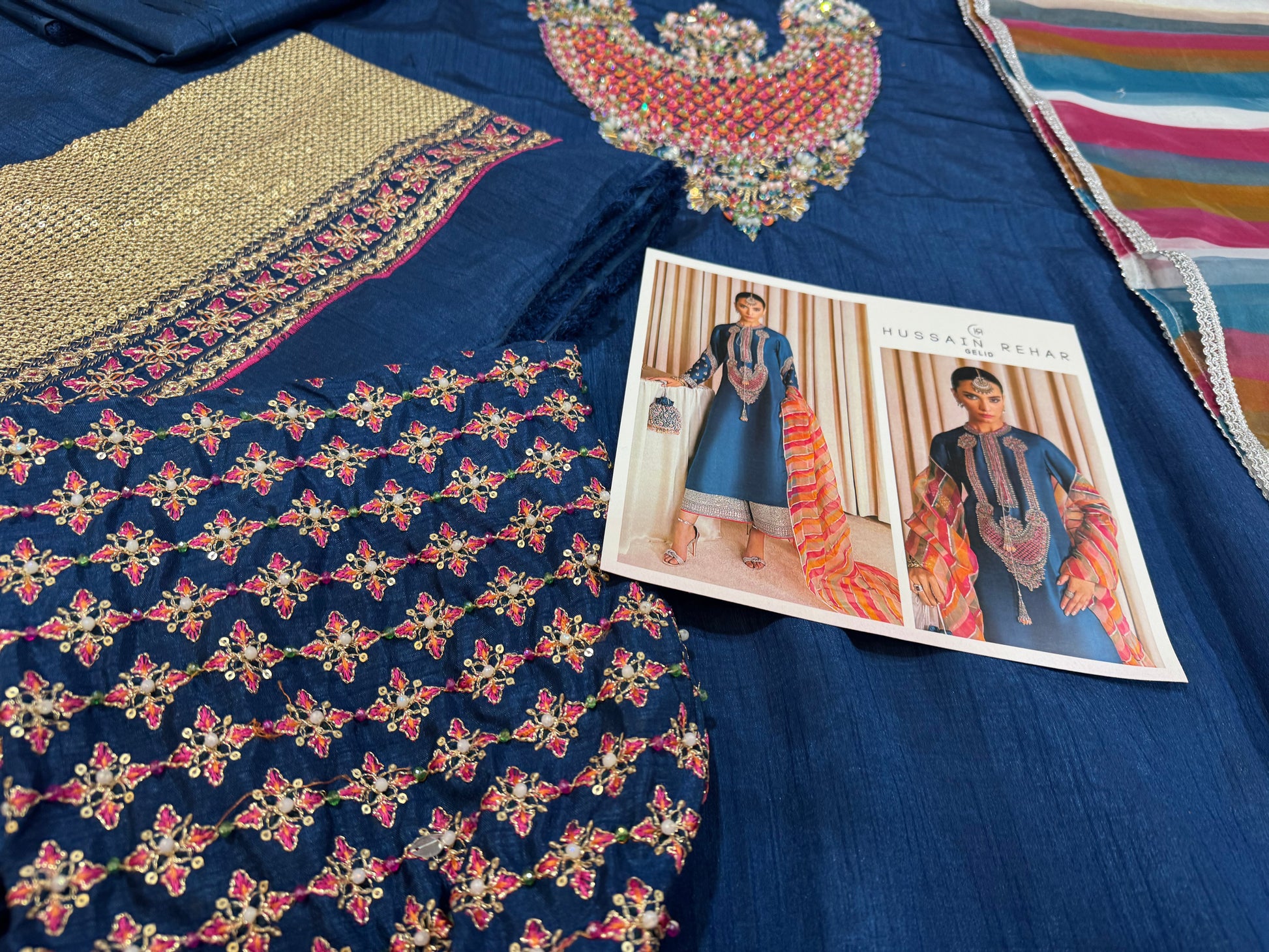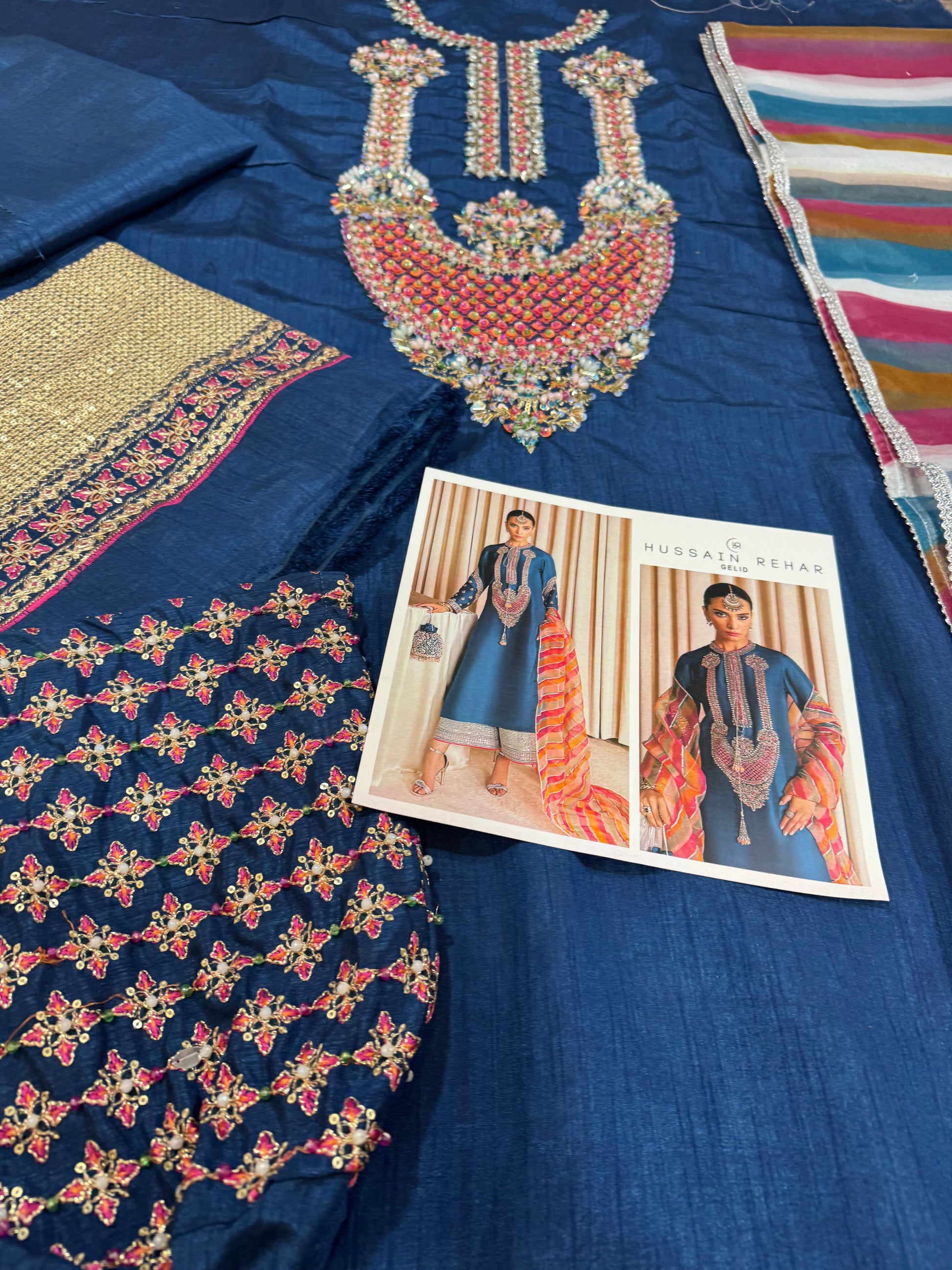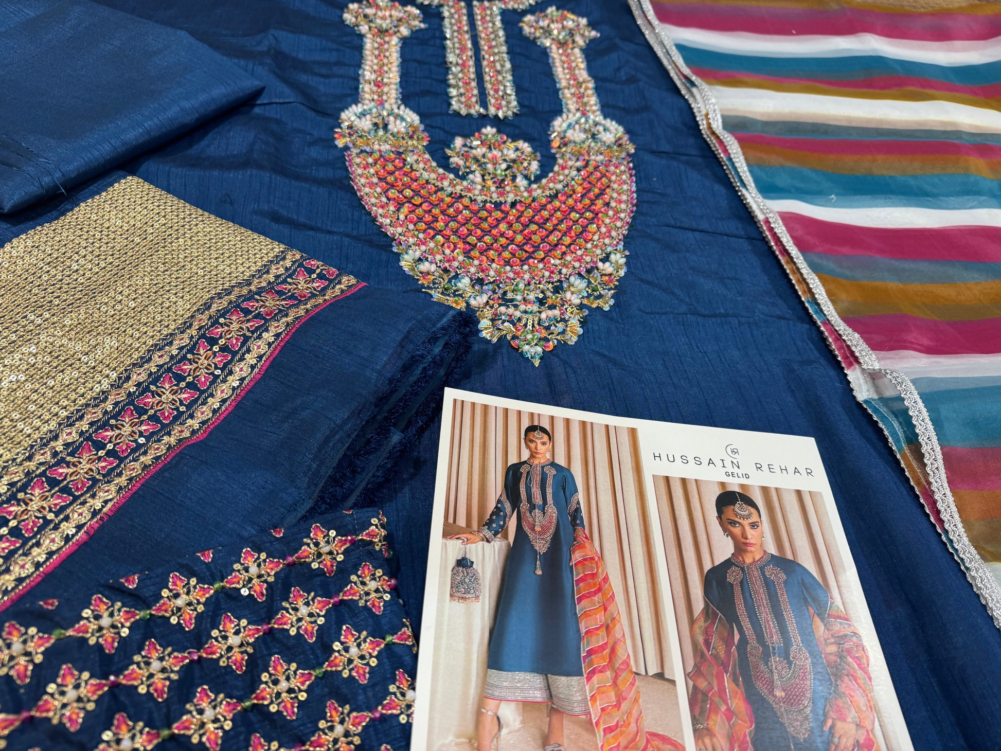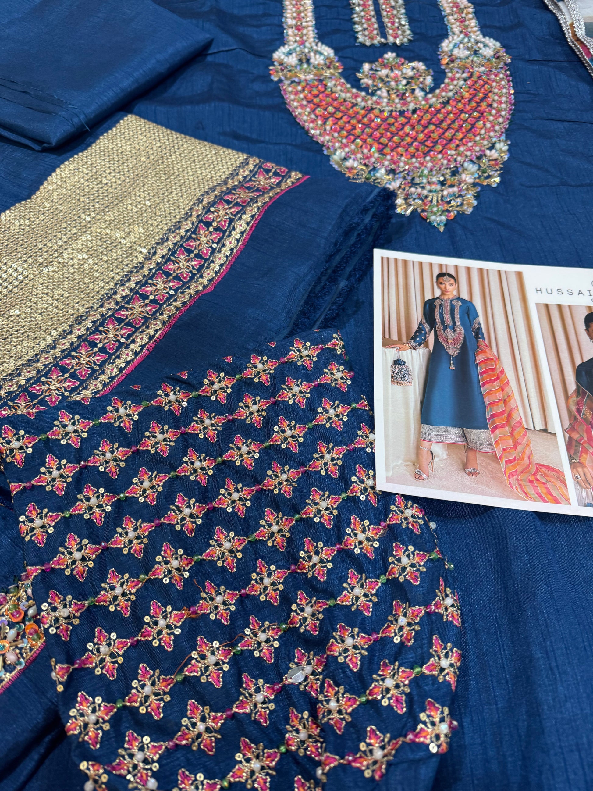 Description: A stunning teal blue raw silk long shirt with tassels and beautiful embellishments in the front of the shirt and on the sleeves. The embellishments include delicate work of nakshi, dabka, sitara and cutdana in the hues of pink, orange, dark green, olive green, silver and iceblue. It comes along with a culotte pant which has pockets on the sides and a fine border of sequins and thread in pink and orange. The outfit consists of a flowy chatta patti organza dupatta in multicolor and gotta finishing