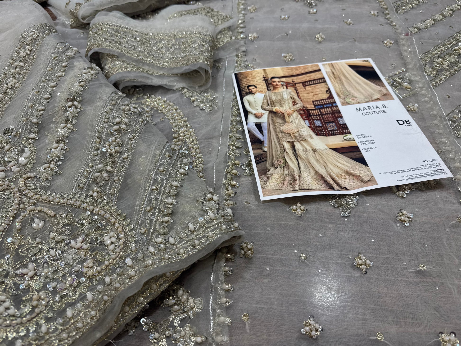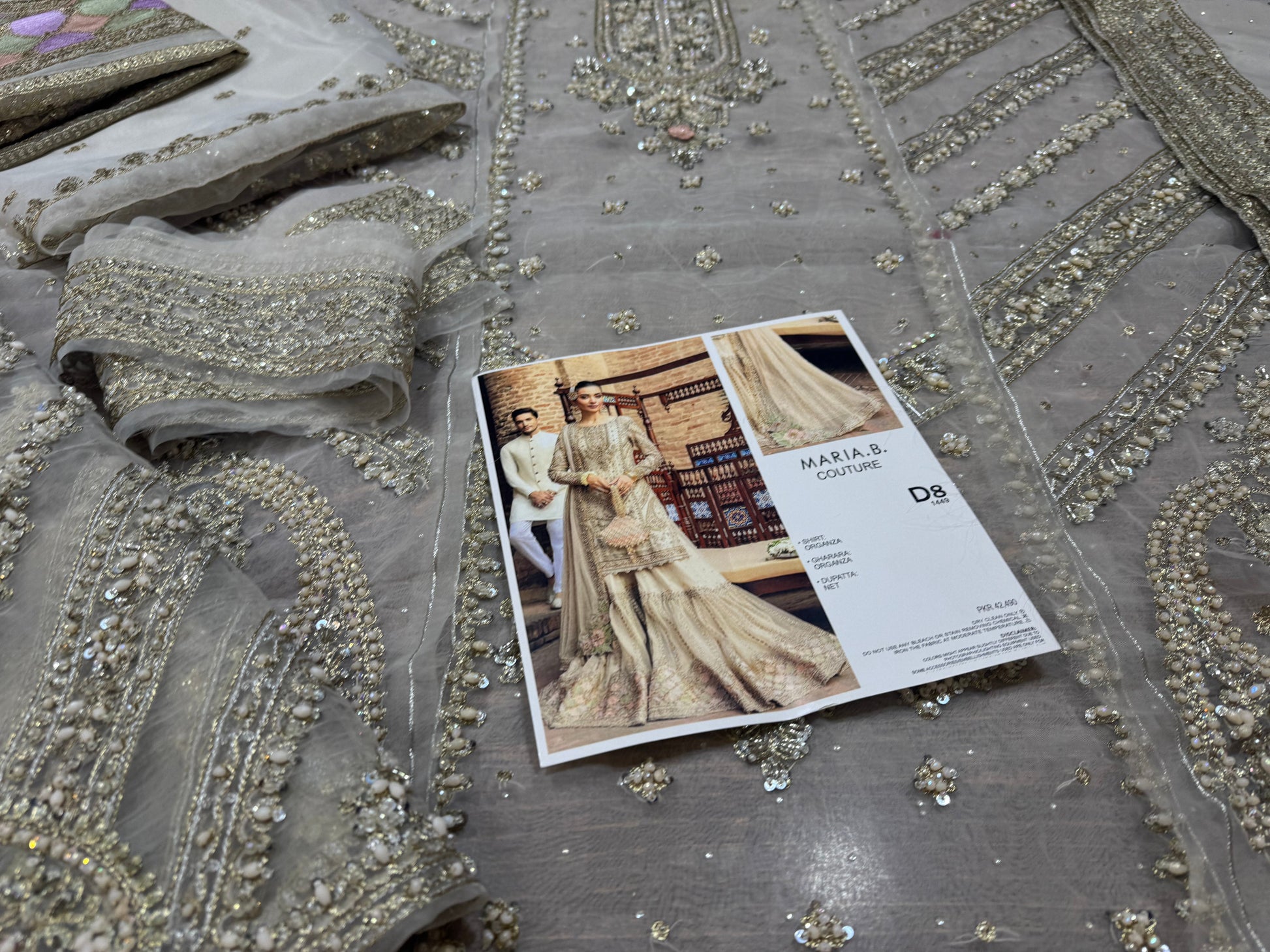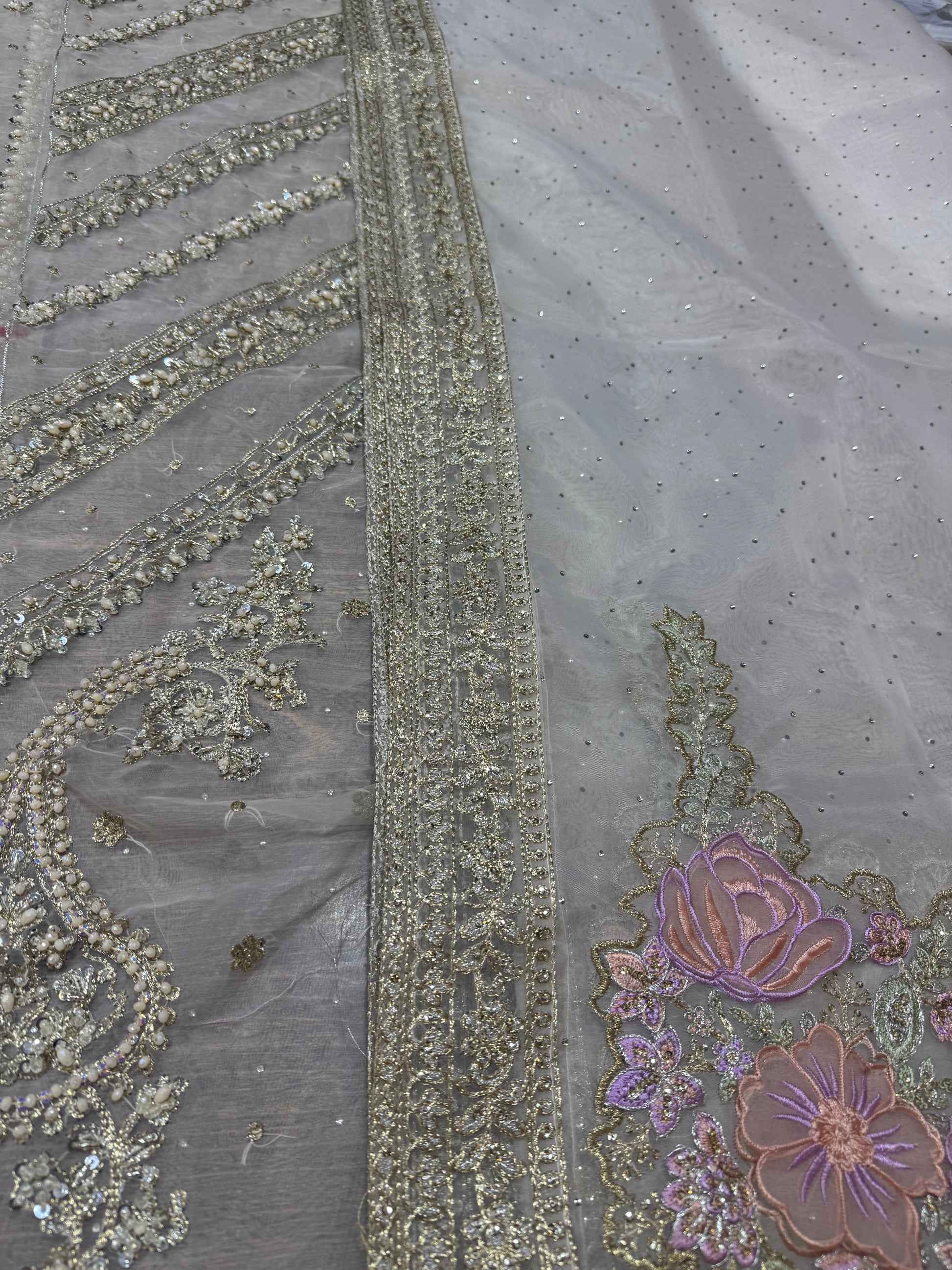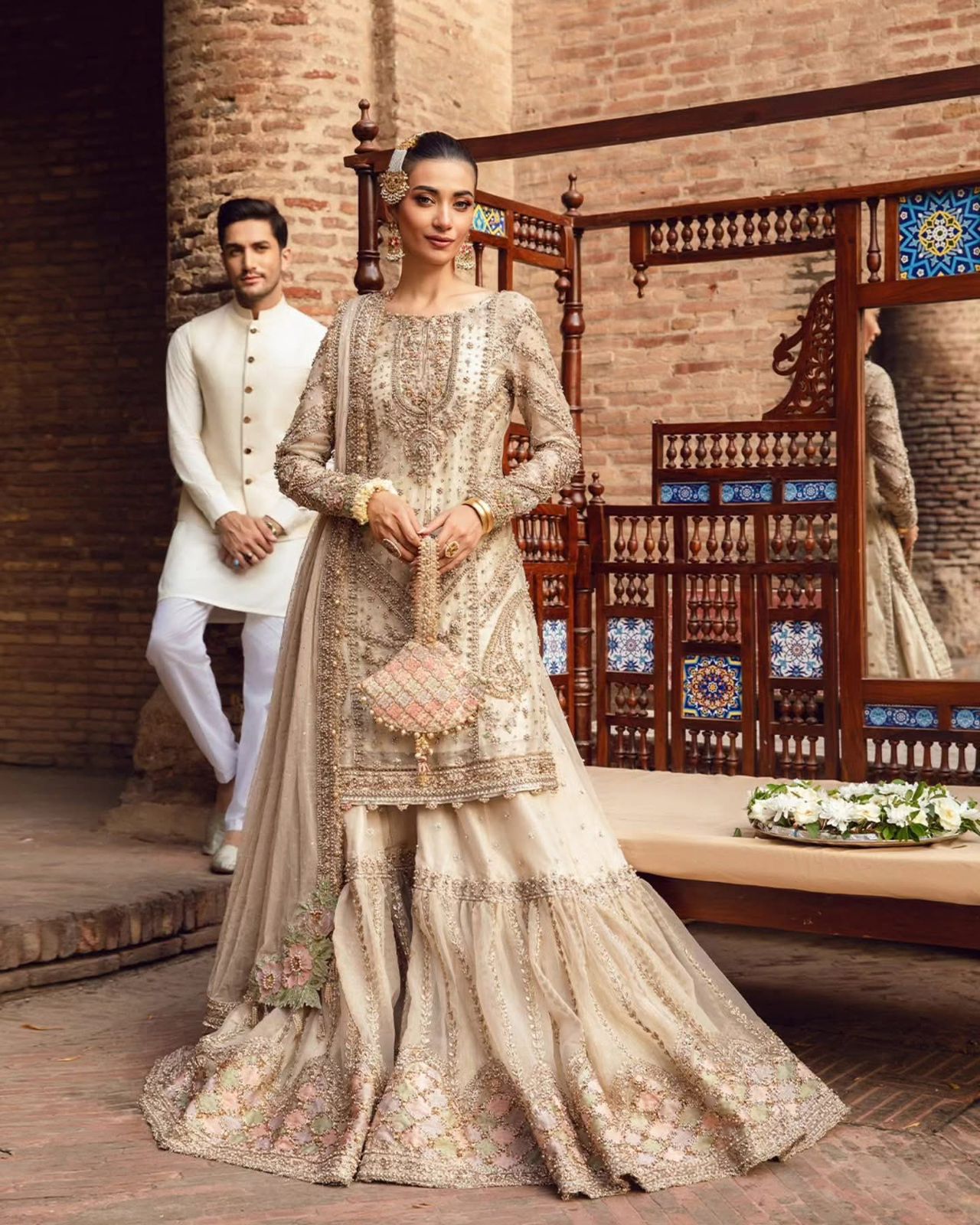 Embrace the timeless allure of 'Ishtar', a glorious creation in a heavenly ivory palette. This gharara set features an enchanting array of traditional & paisley patterns, rendered with exquisite applique work, creating a striking composition with glistening kundan, zari & cutdana bead embroidery. Surrounded by an elegantly mukesh work & lavishly adorned with cascades of delicate pearls, stones, tassels & glistening sequins, this piece is a hallmark of sophistication. Accompanied by a sumptuous mukesh dupatta that whipers of luxury while making it a perfect choice for a luxurious engagement, nikah, shendi & shalima occasion.