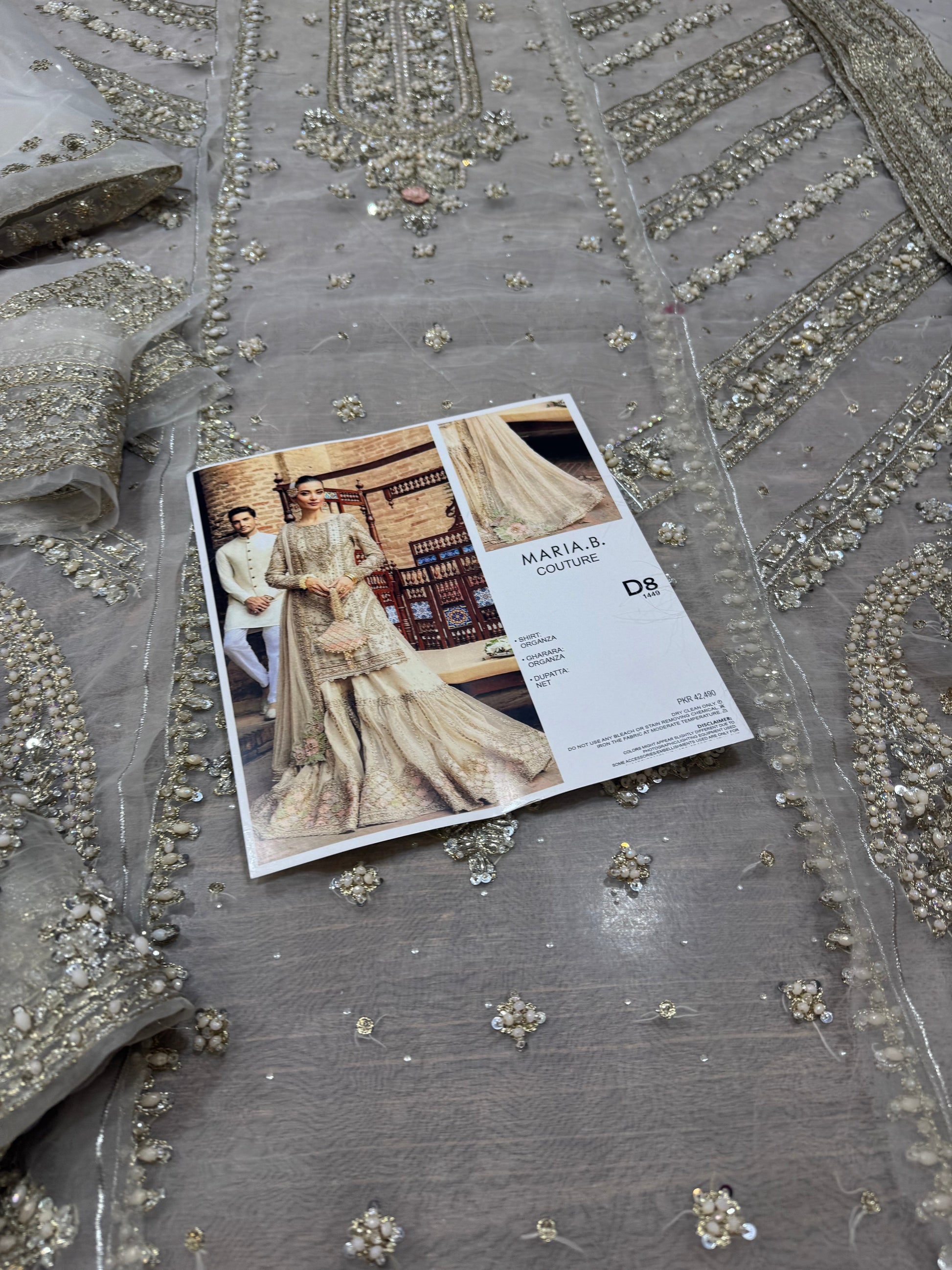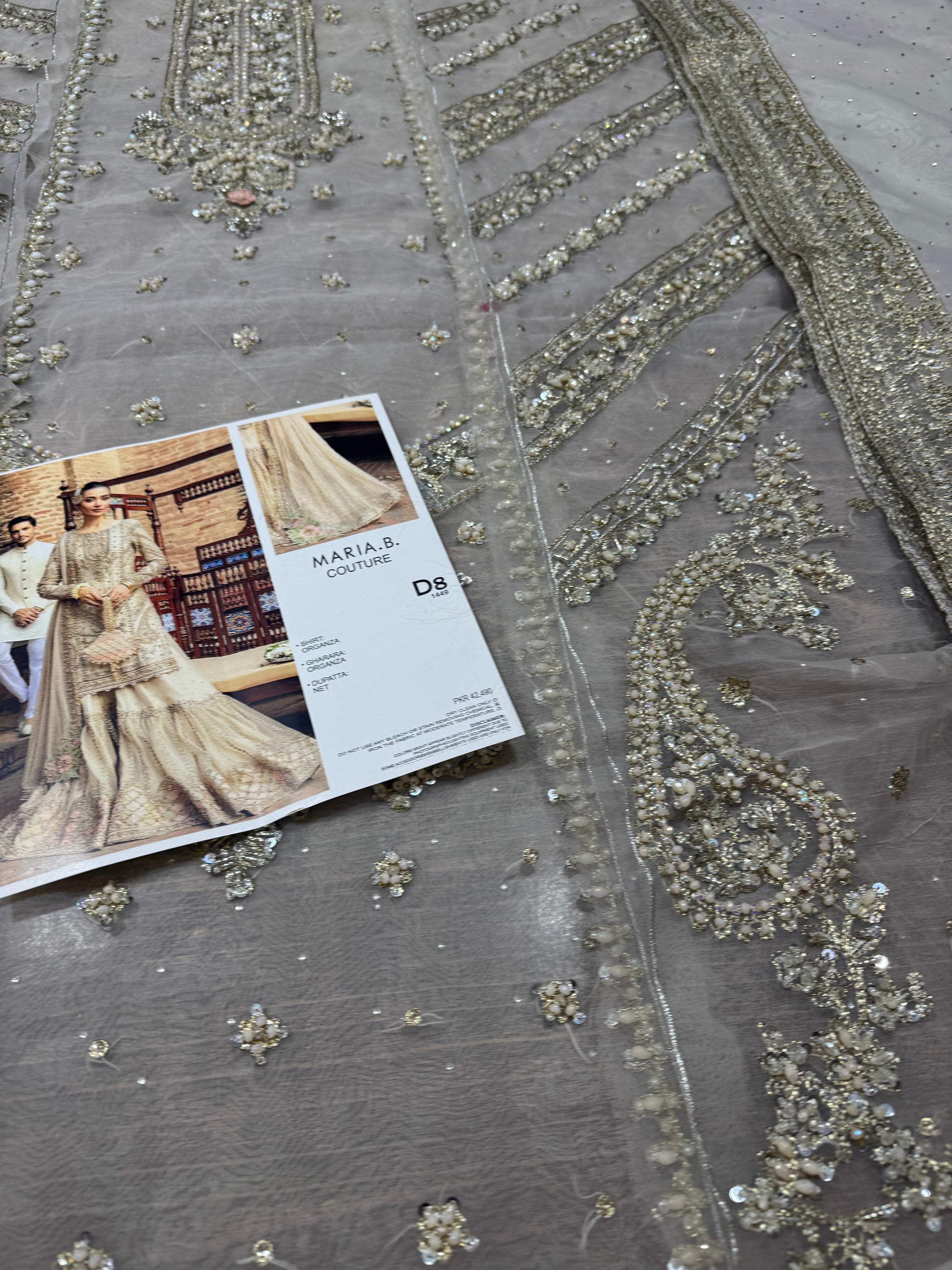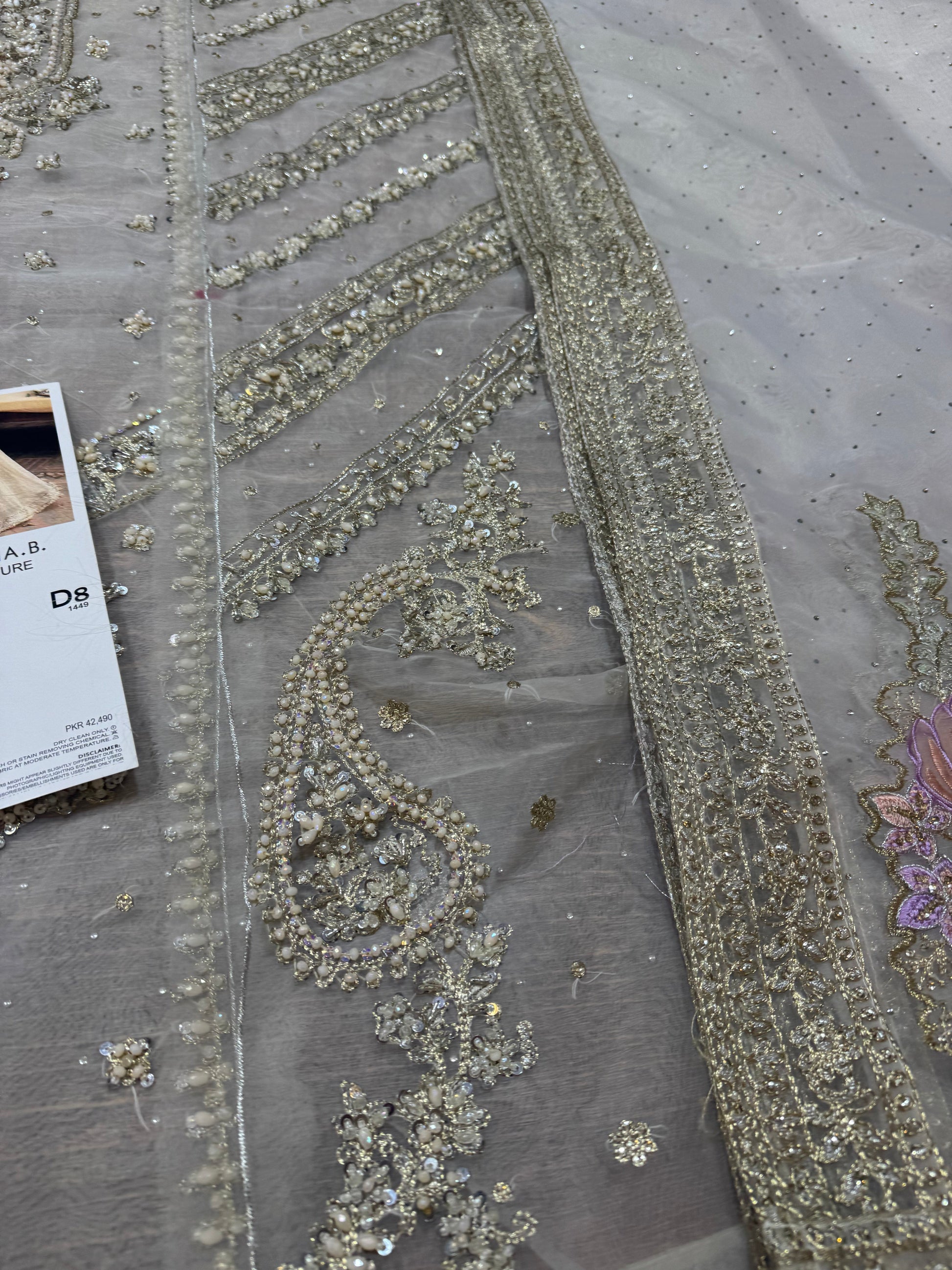 Embrace the timeless allure of 'Ishtar', a glorious creation in a heavenly ivory palette. This gharara set features an enchanting array of traditional & paisley patterns, rendered with exquisite applique work, creating a striking composition with glistening kundan, zari & cutdana bead embroidery. Surrounded by an elegantly mukesh work & lavishly adorned with cascades of delicate pearls, stones, tassels & glistening sequins, this piece is a hallmark of sophistication. Accompanied by a sumptuous mukesh dupatta that whipers of luxury while making it a perfect choice for a luxurious engagement, nikah, shendi & shalima occasion.