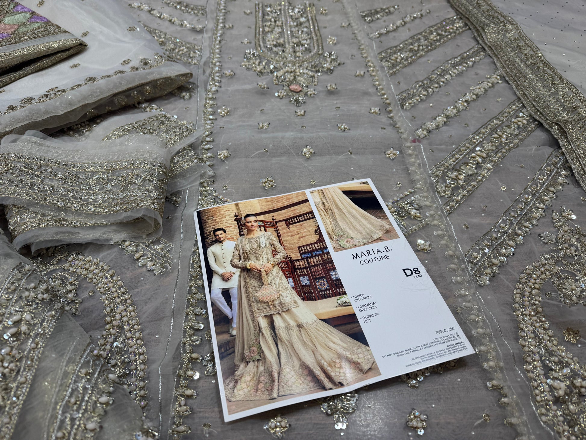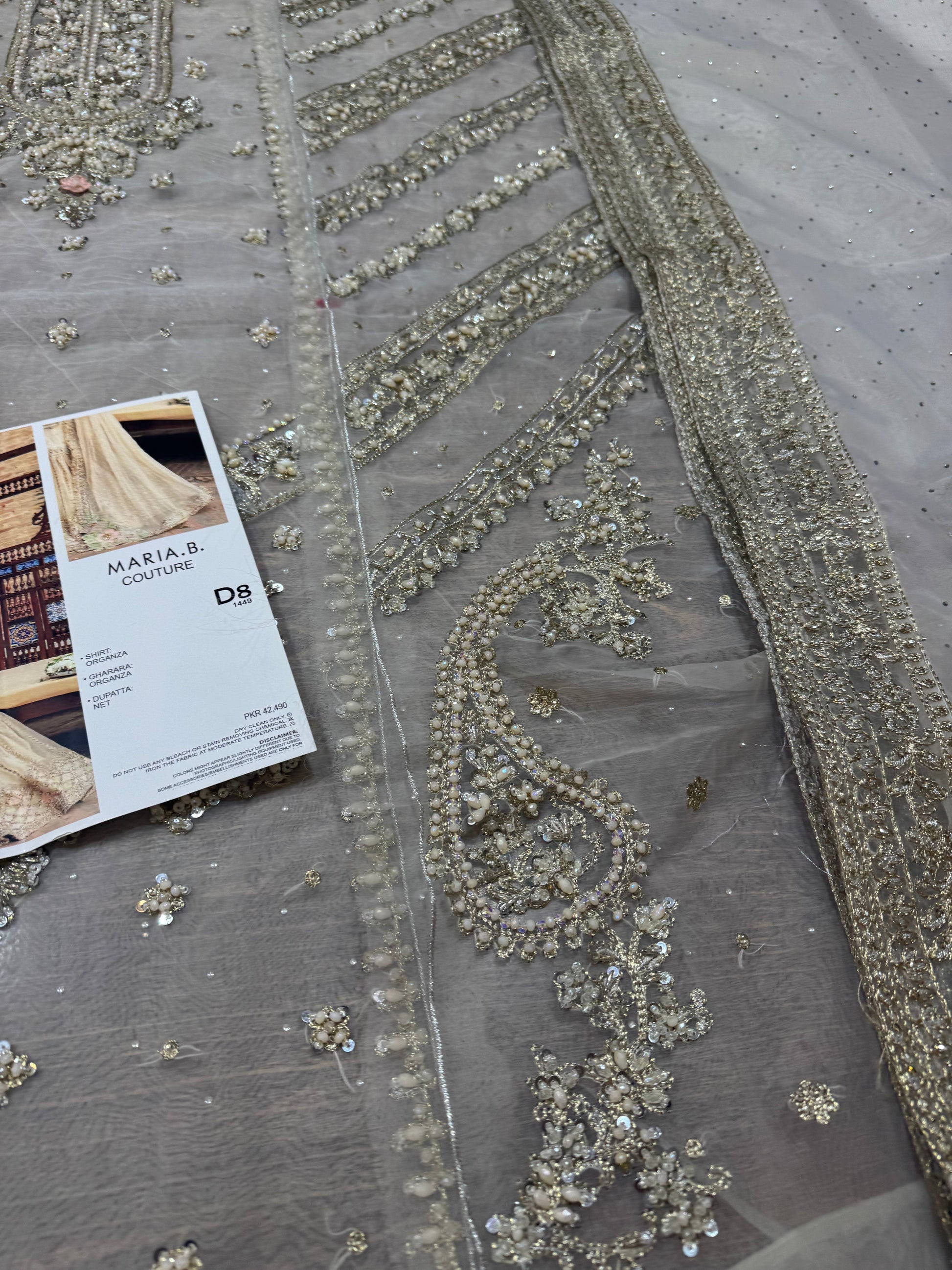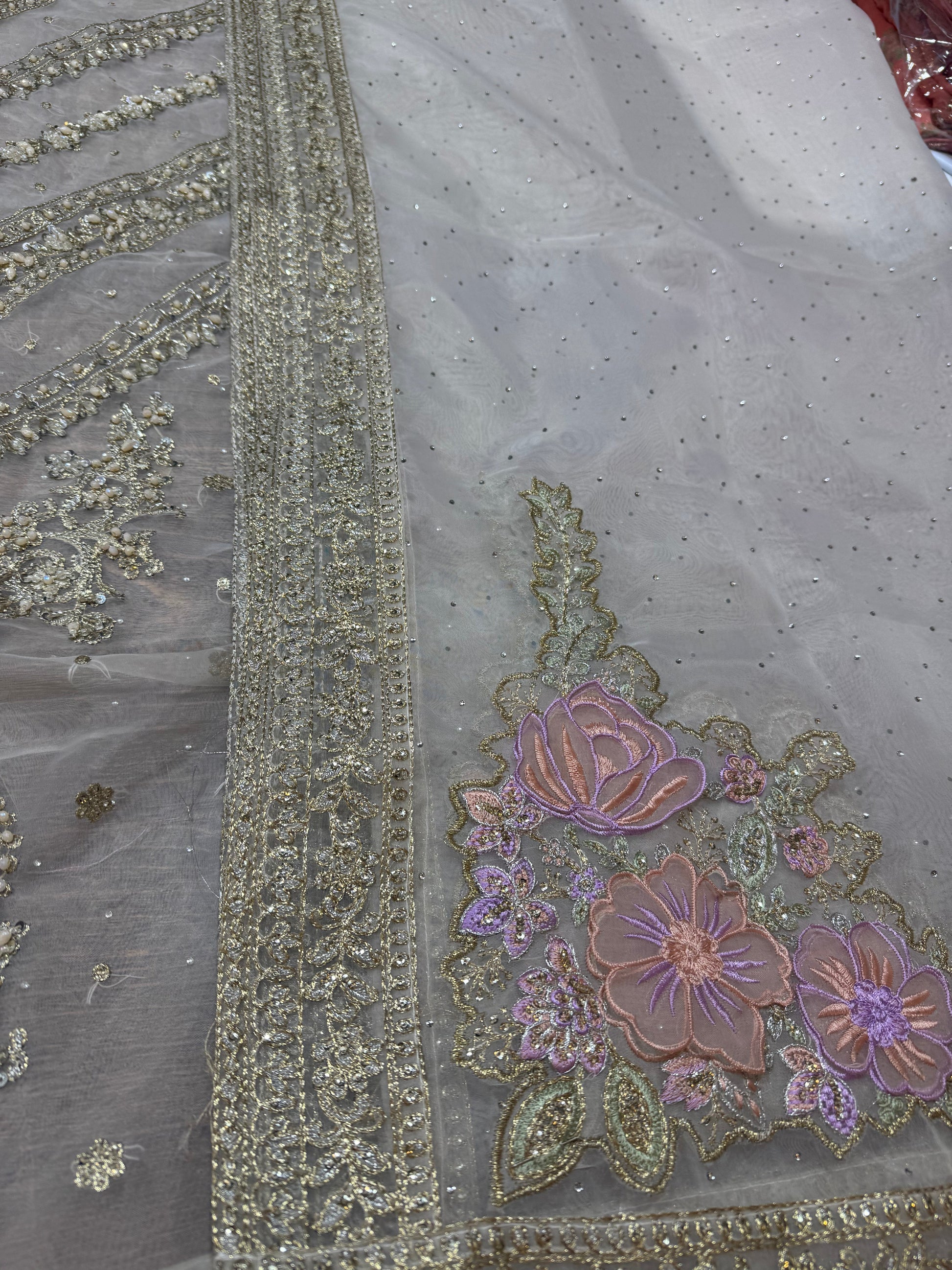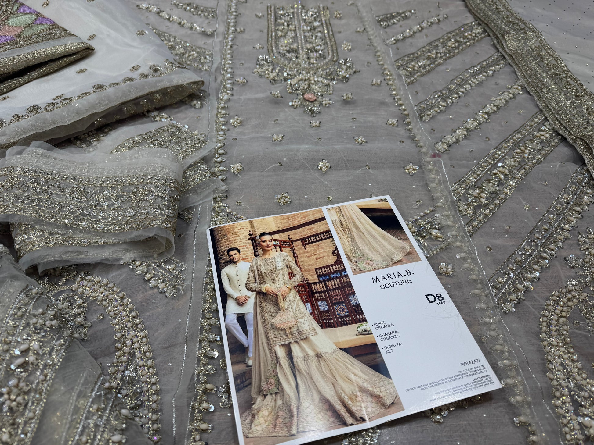 Embrace the timeless allure of 'Ishtar', a glorious creation in a heavenly ivory palette. This gharara set features an enchanting array of traditional & paisley patterns, rendered with exquisite applique work, creating a striking composition with glistening kundan, zari & cutdana bead embroidery. Surrounded by an elegantly mukesh work & lavishly adorned with cascades of delicate pearls, stones, tassels & glistening sequins, this piece is a hallmark of sophistication. Accompanied by a sumptuous mukesh dupatta that whipers of luxury while making it a perfect choice for a luxurious engagement, nikah, shendi & shalima occasion.