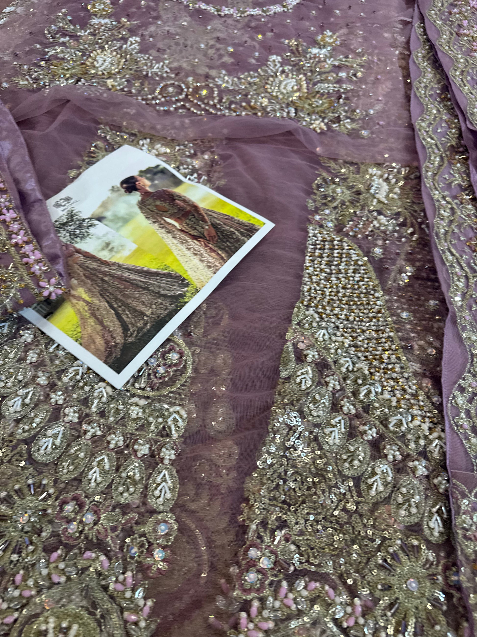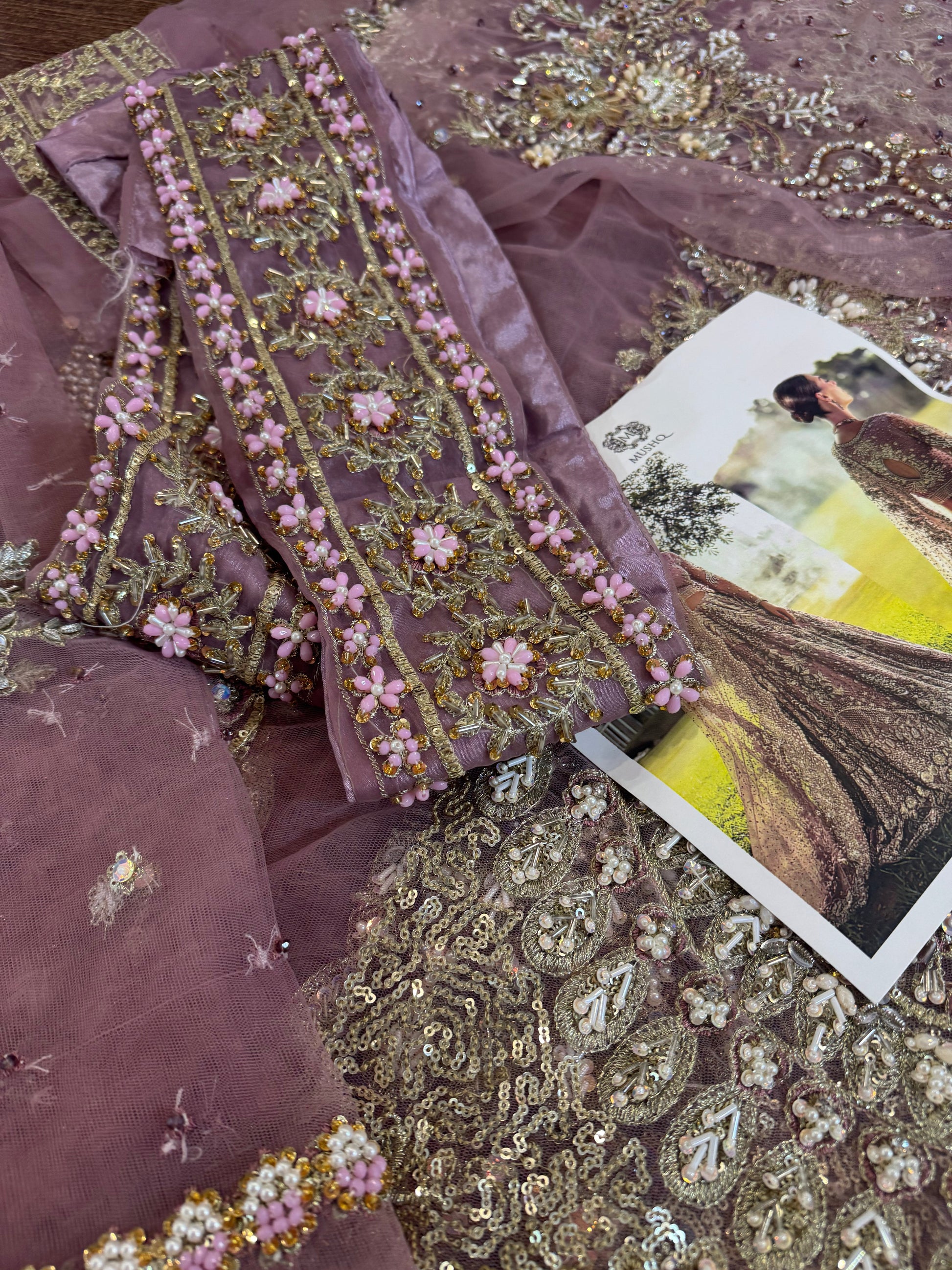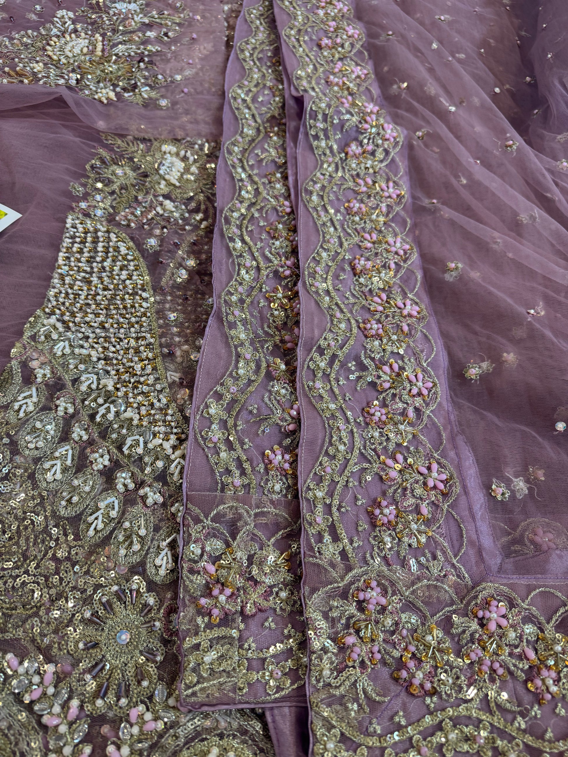 A stunning purple lehenga choli adorned with intricate dabka, naqshi, pearls, and Swarovski crystals, creating a radiant bridal look. The net lehenga features a delicate spray of thread and sequins, adding a soft shimmer to every step