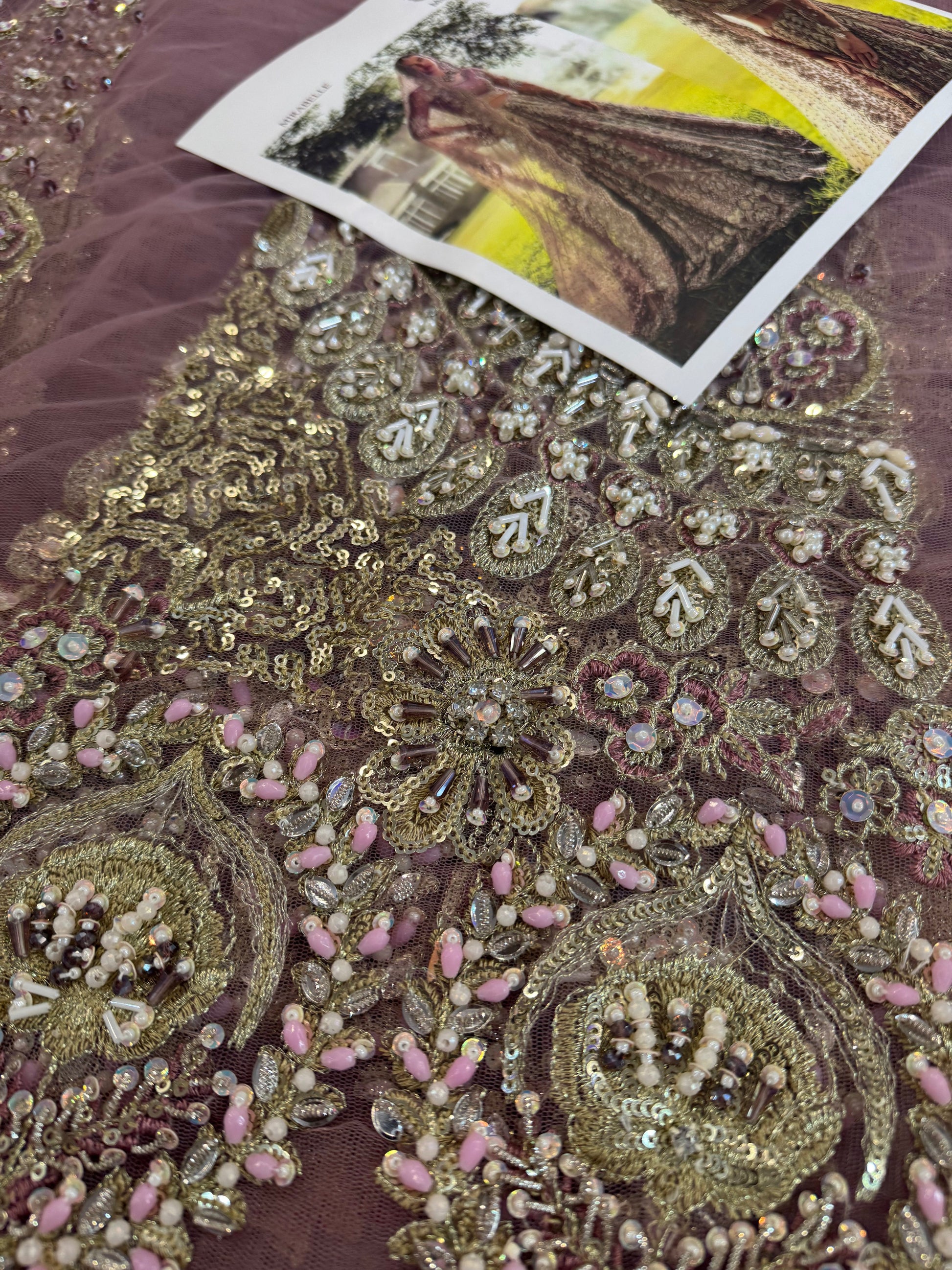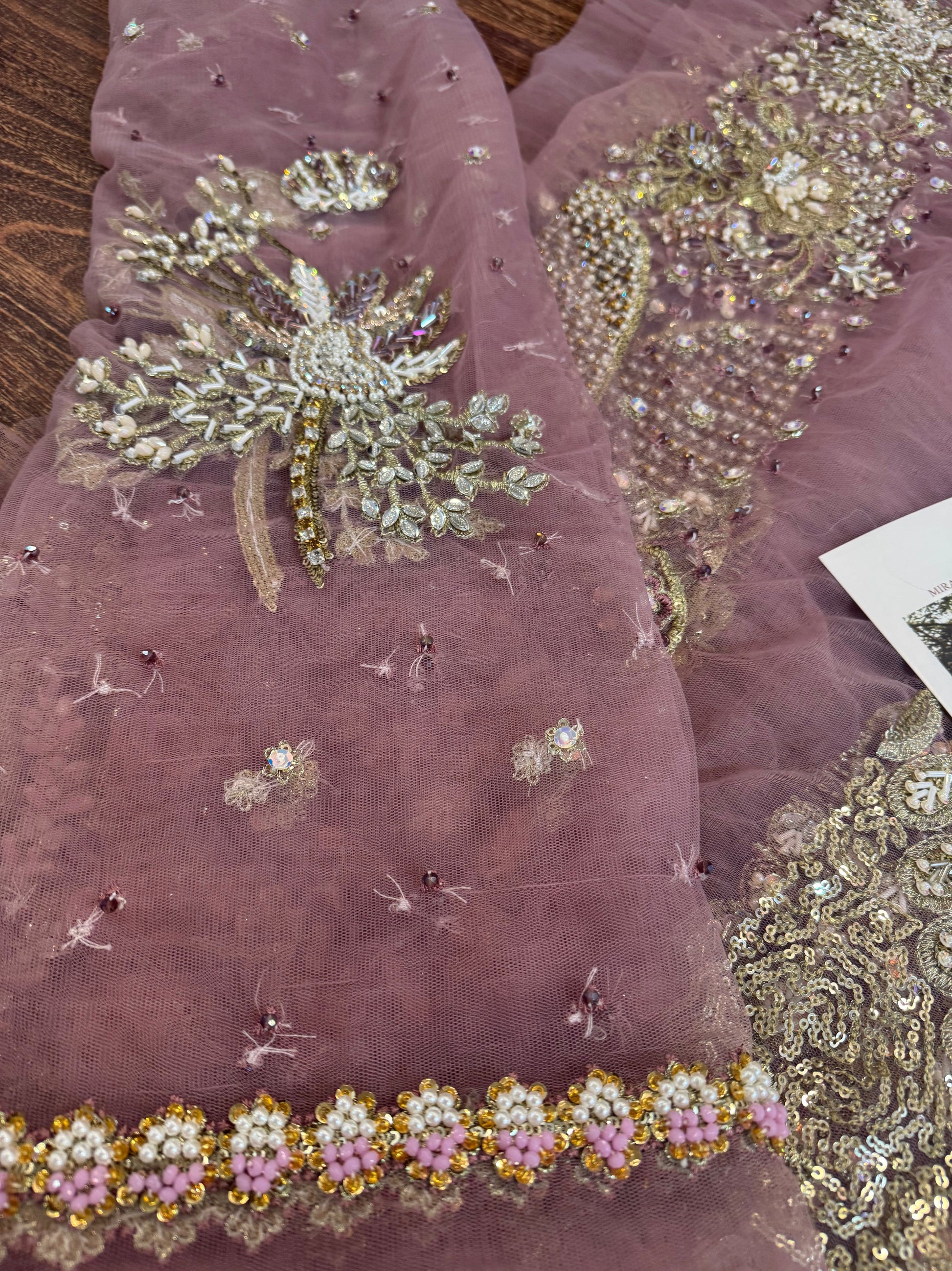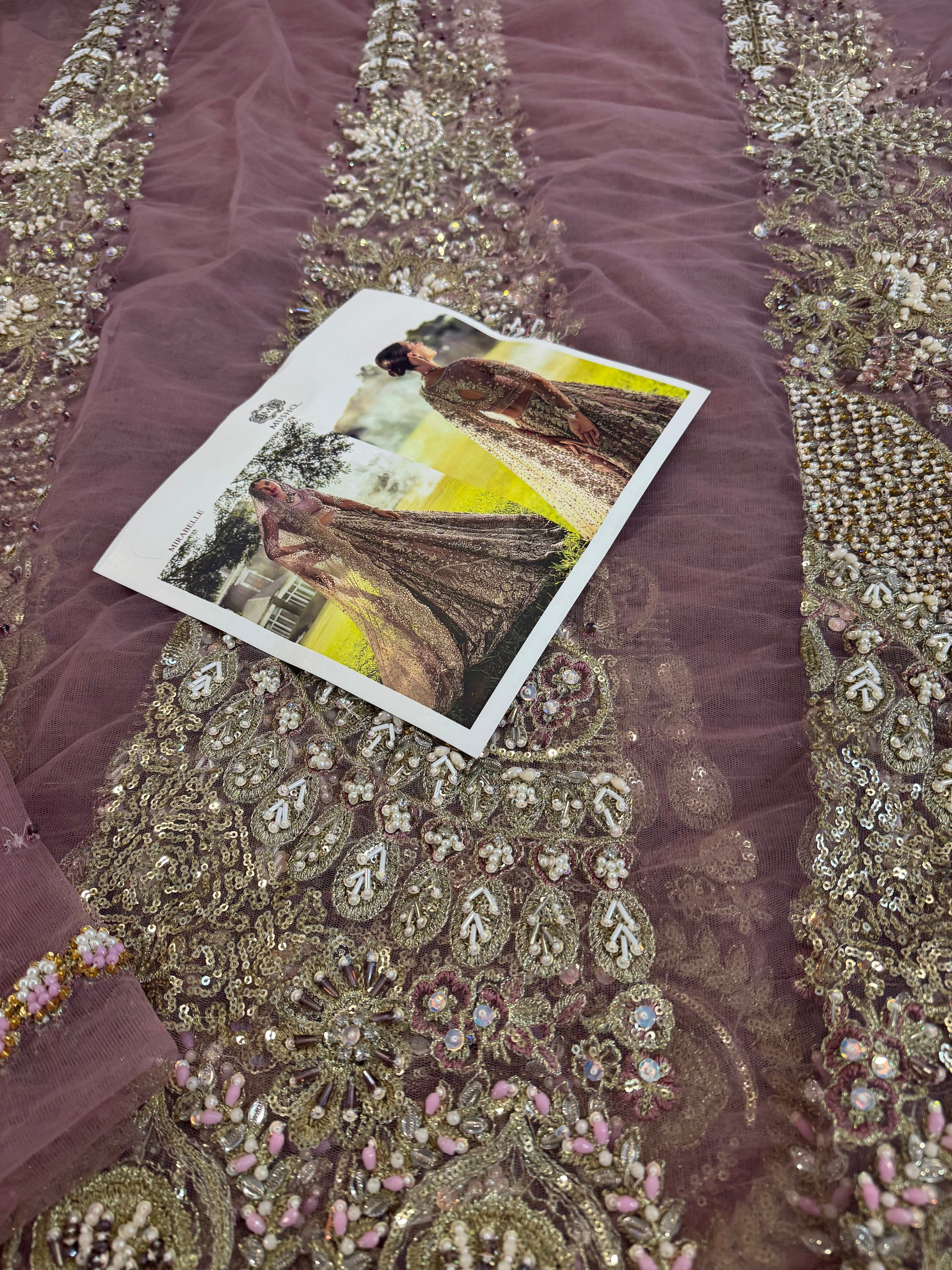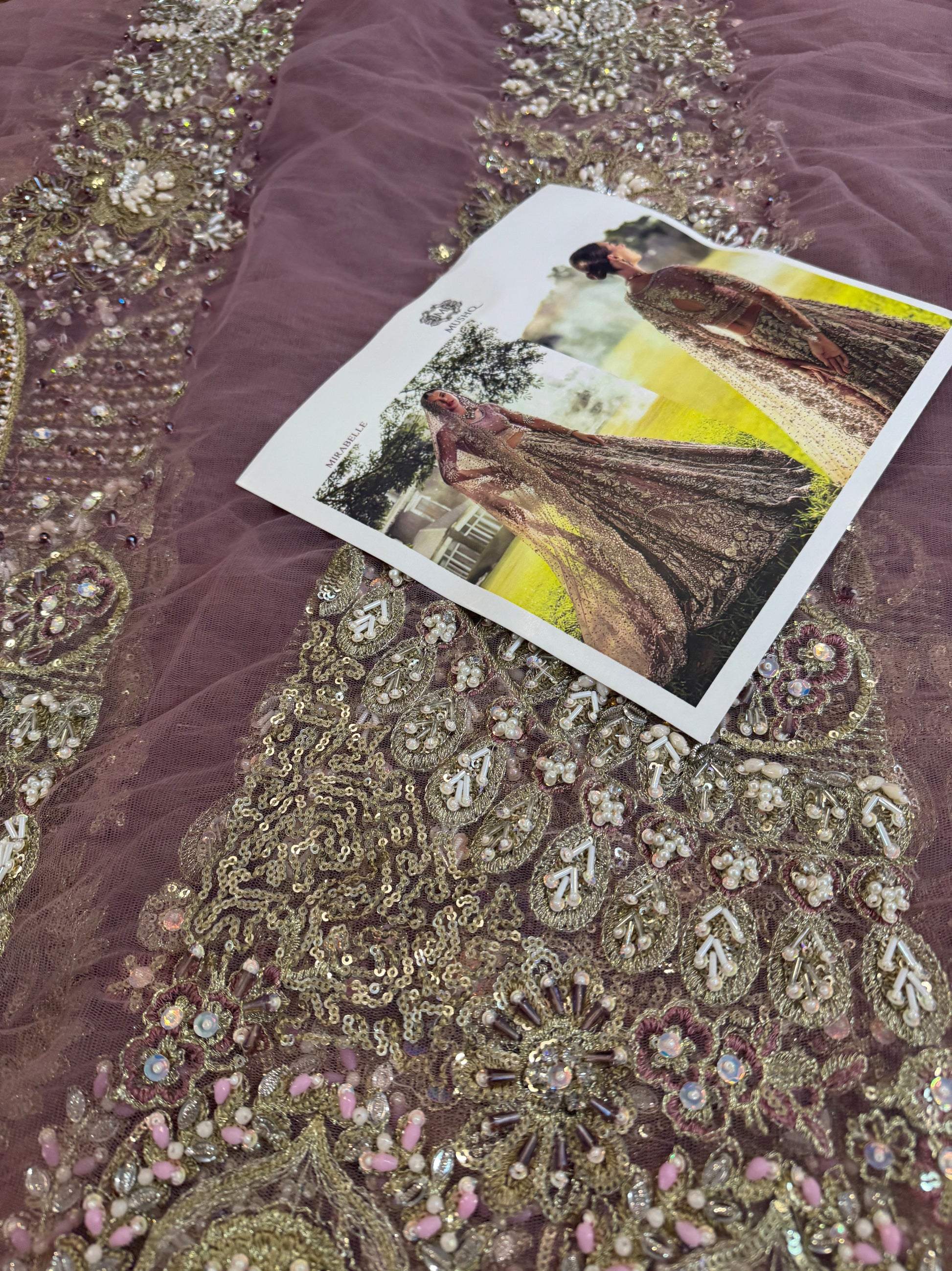 A stunning purple lehenga choli adorned with intricate dabka, naqshi, pearls, and Swarovski crystals, creating a radiant bridal look. The net lehenga features a delicate spray of thread and sequins, adding a soft shimmer to every step