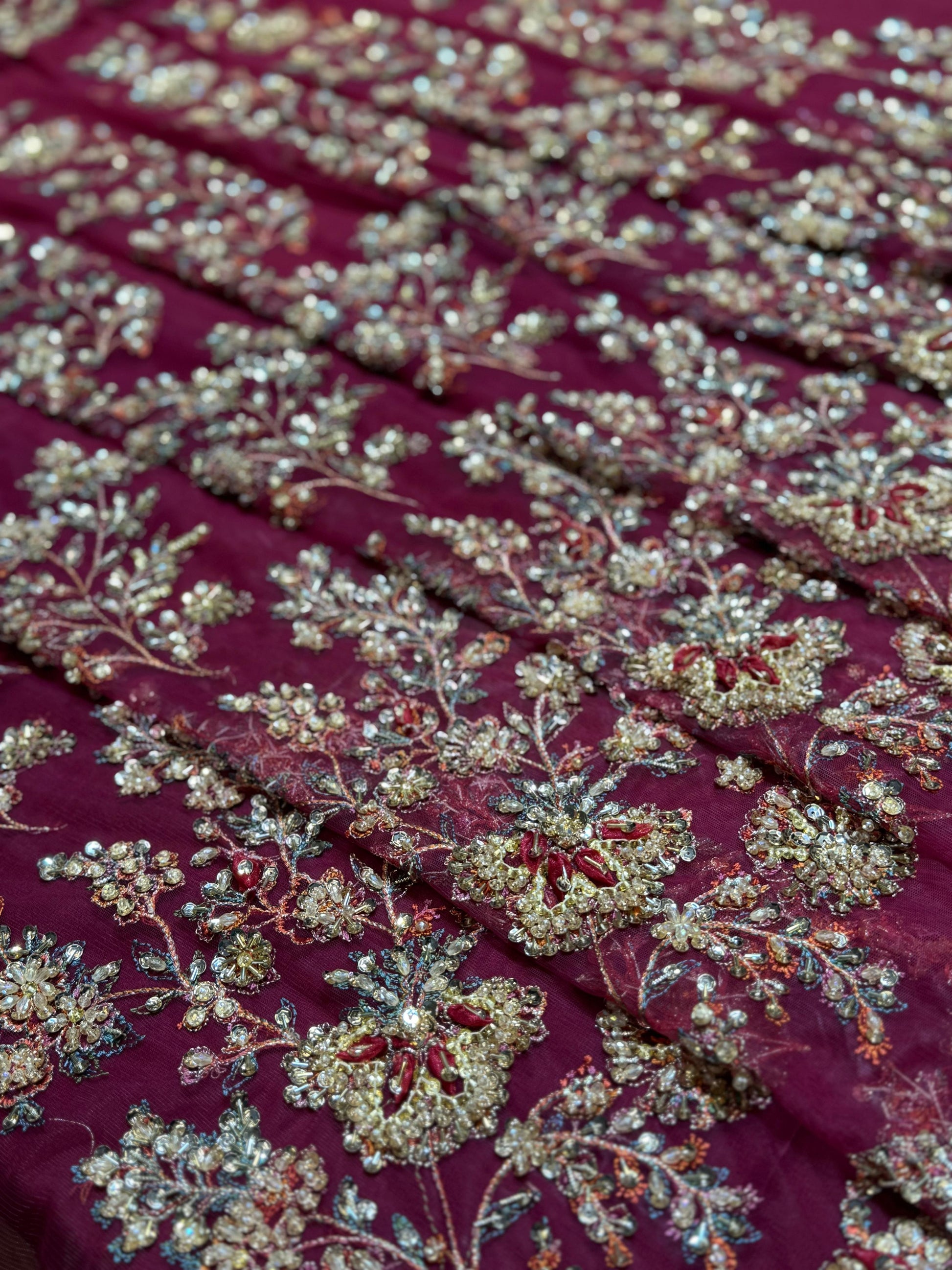 Make a bold statement with our exquisite rubby woo full-sleeve pishwaz, intricately hand-embellished with gotta tilla, cut dana, and other luxurious materials. Featuring a stunning deep neckline and opulent gold finishings, this piece radiates sophistication and allure. Paired with a lavish dupatta that showcases soft pink hues in its delicate hand embellishments, the heavy borders add an extra layer of intrigue that combines tradition and modern elegance.