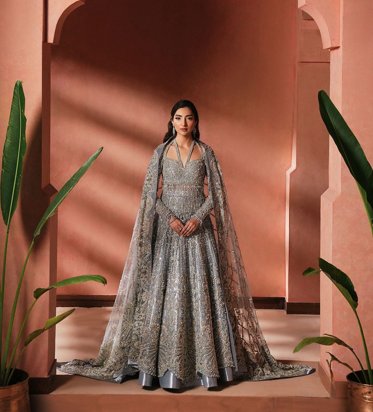 This Soraya Wedding Edition bridal dress is a stunning grey chiffon masterpiece, designed for a modern yet traditional look. The ensemble features intricate embroidery and luxurious embellishments, with a flowing full-length gown and a dramatic, sheer cape-like overlay. The detailed handwork and graceful silhouette make it a perfect choice for a bridal ceremony or grand formal event. The dress, identified as a "Soraya grey" style, is priced at 38500.