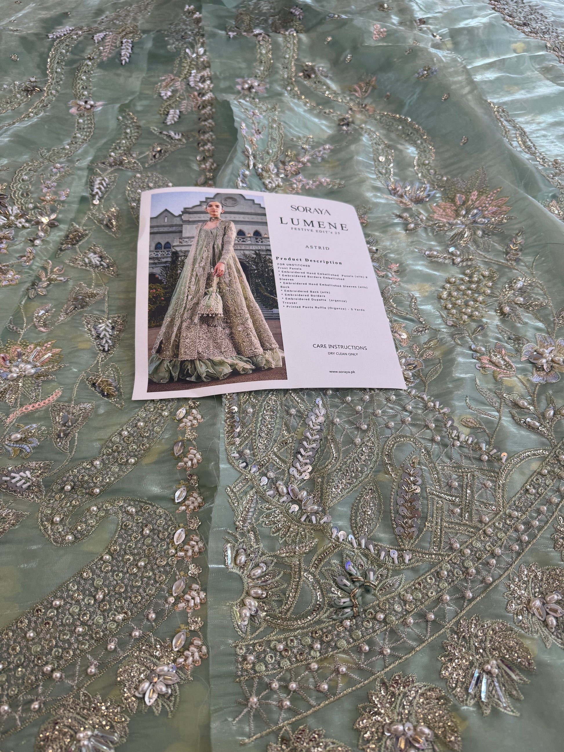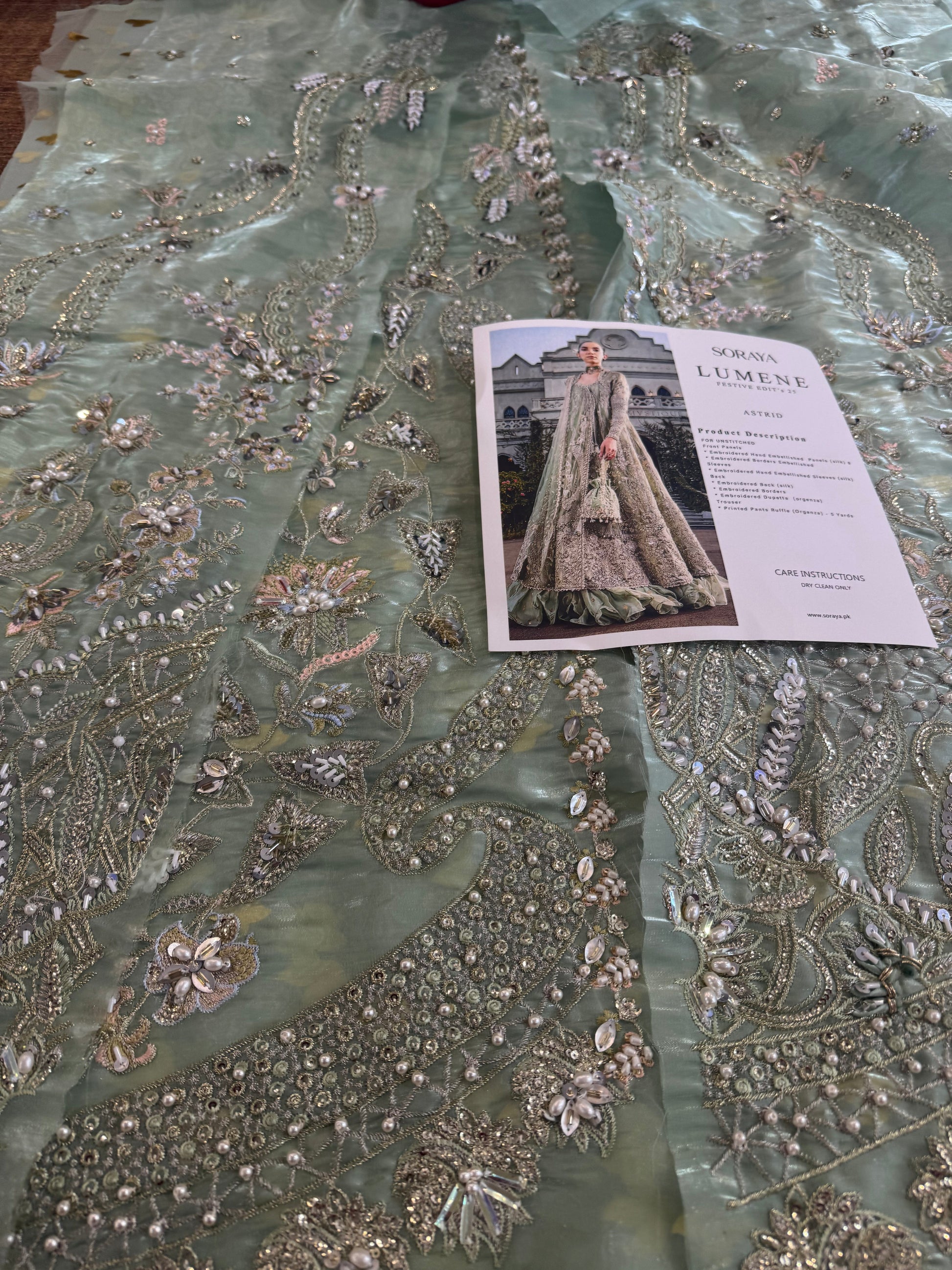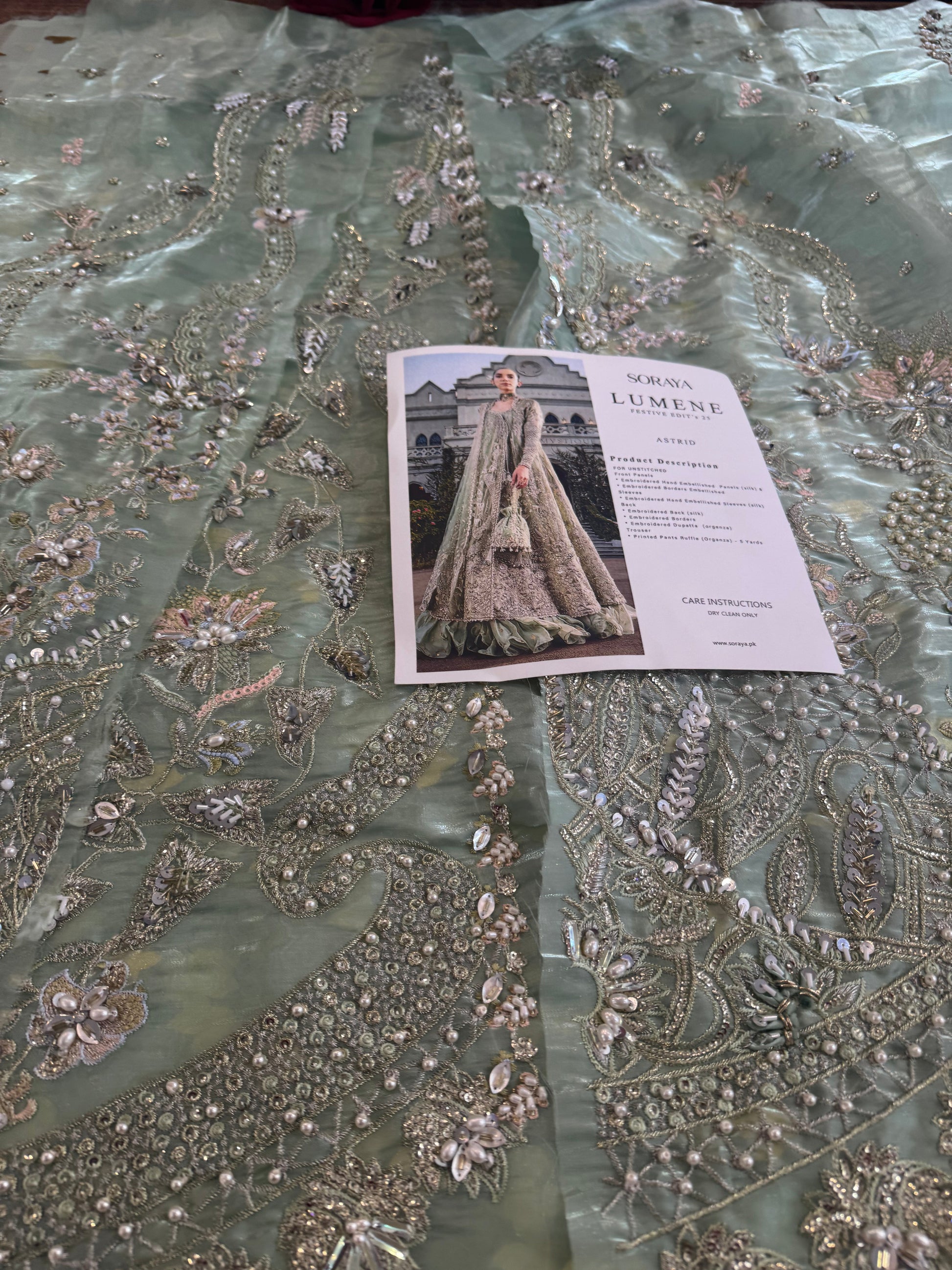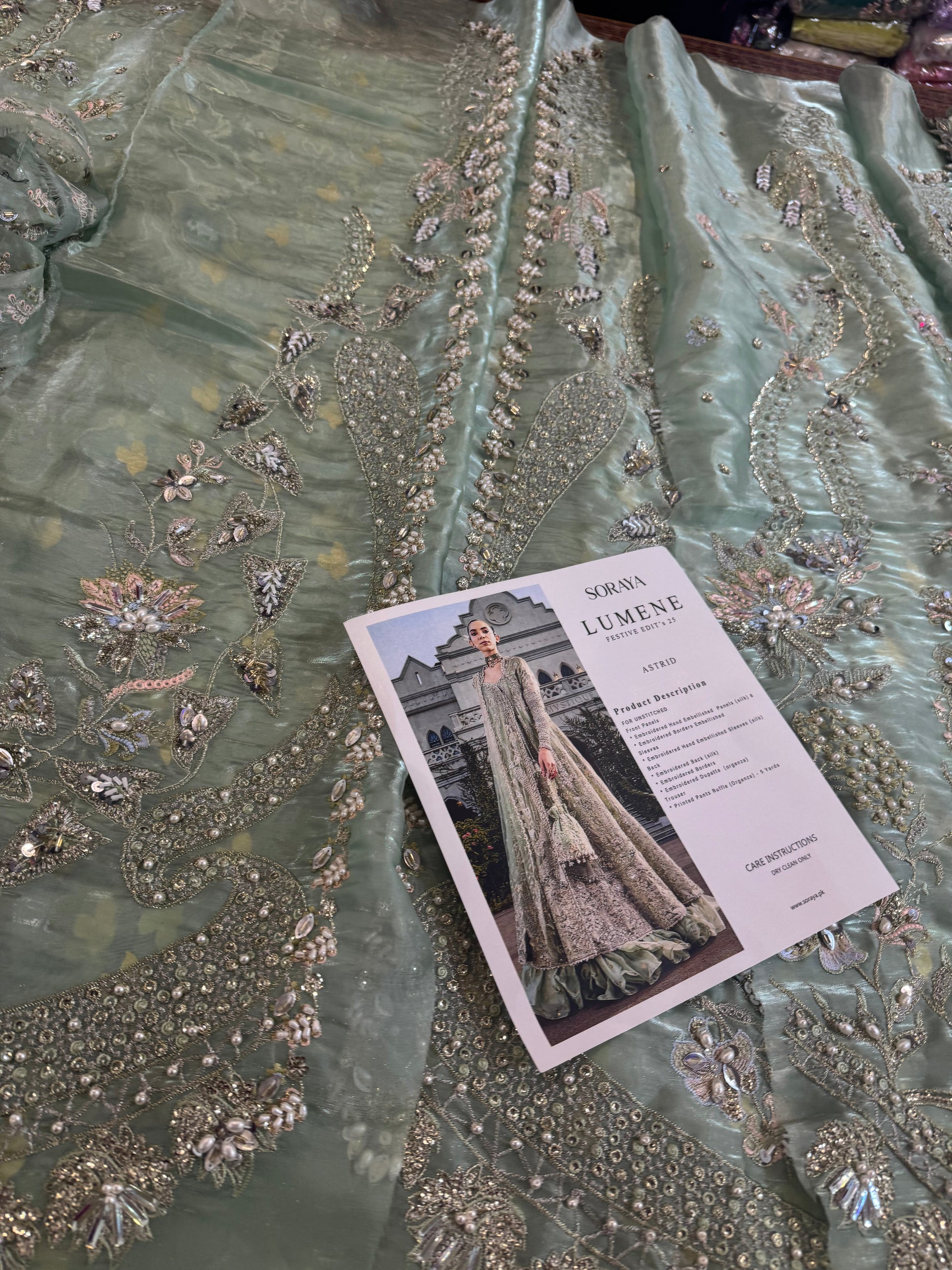 The Soraya Wedding Edition presents a stunning chiffon bridal ensemble that exudes elegance and intricate craftsmanship. This bespoke bridal dress, a part of the "Soraya Lume" collection, features a flowing silhouette in a delicate shade of mint green. The garment is richly adorned with exquisite silver and white embroidery, showcasing detailed floral and geometric patterns across the full-length jacket, inner dress, and coordinated potli bag. The look is completed with a matching choker, and the tiered skirt adds a beautiful, voluminous movement.