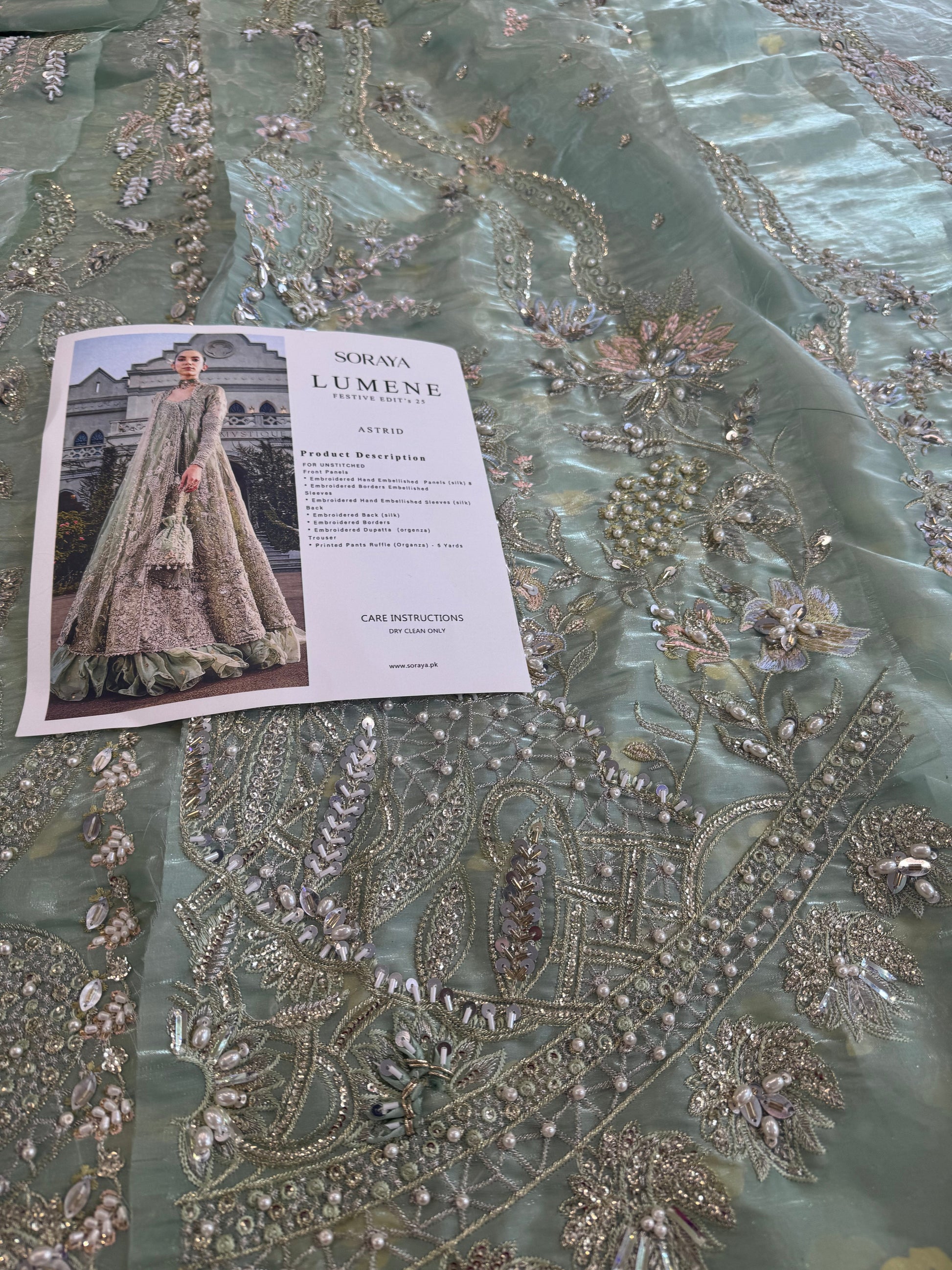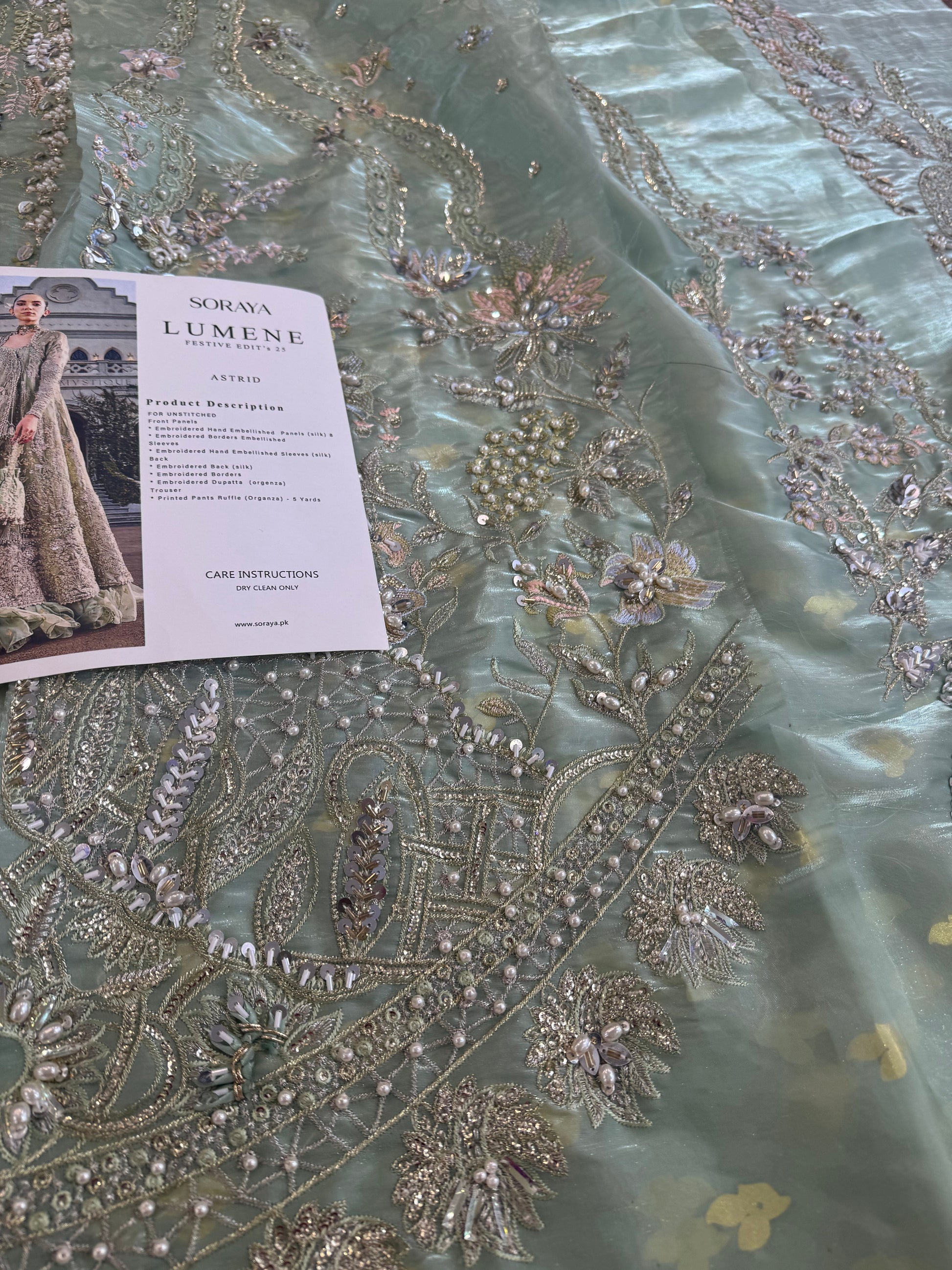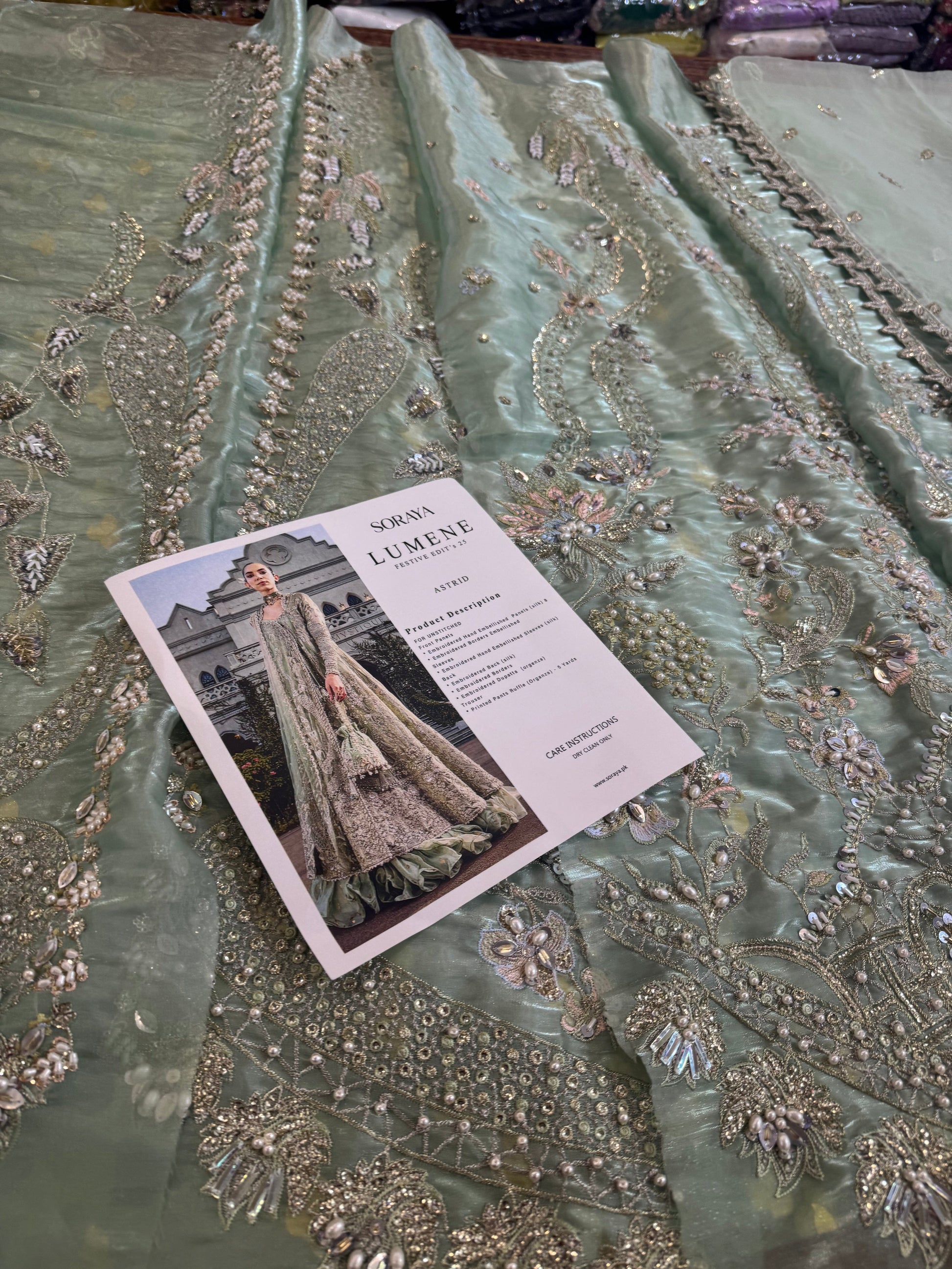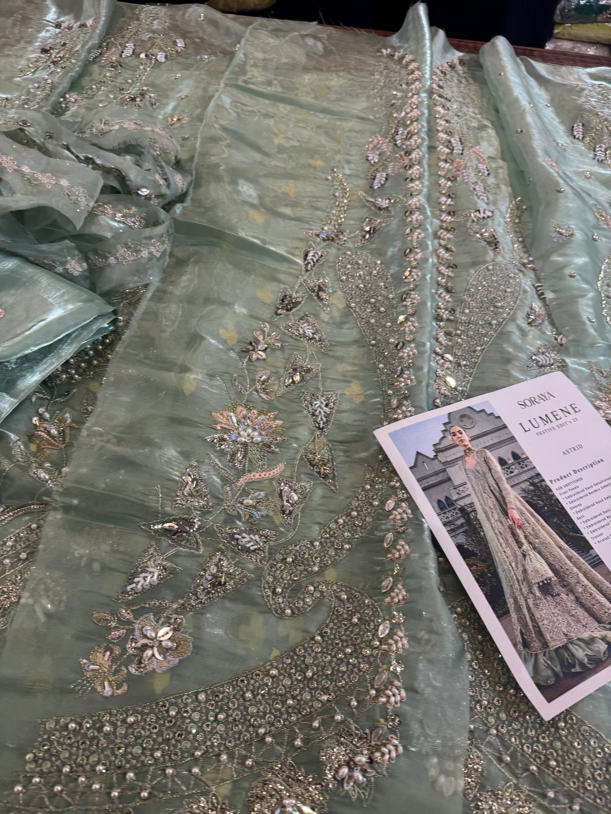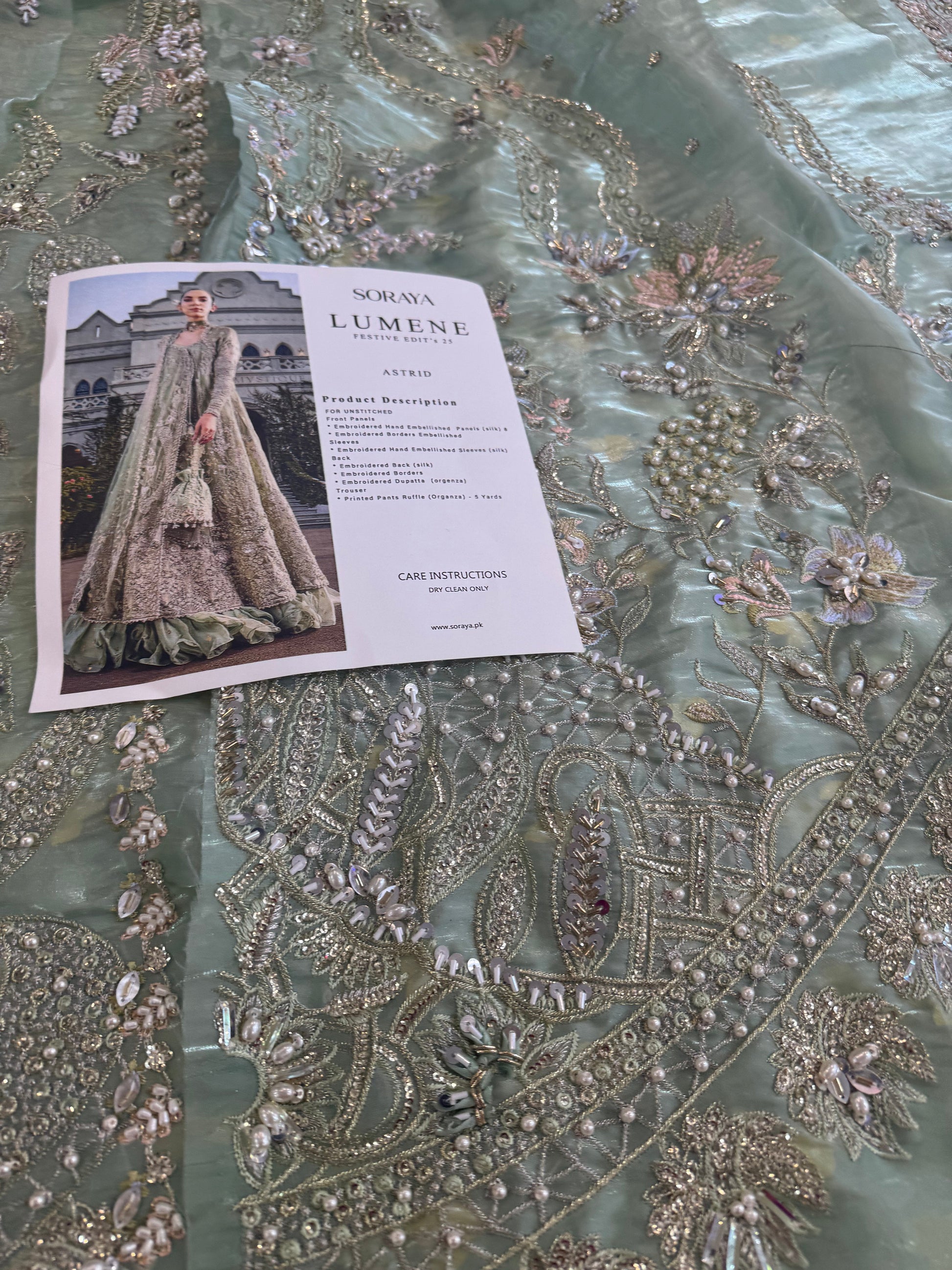 The Soraya Wedding Edition presents a stunning chiffon bridal ensemble that exudes elegance and intricate craftsmanship. This bespoke bridal dress, a part of the "Soraya Lume" collection, features a flowing silhouette in a delicate shade of mint green. The garment is richly adorned with exquisite silver and white embroidery, showcasing detailed floral and geometric patterns across the full-length jacket, inner dress, and coordinated potli bag. The look is completed with a matching choker, and the tiered skirt adds a beautiful, voluminous movement.