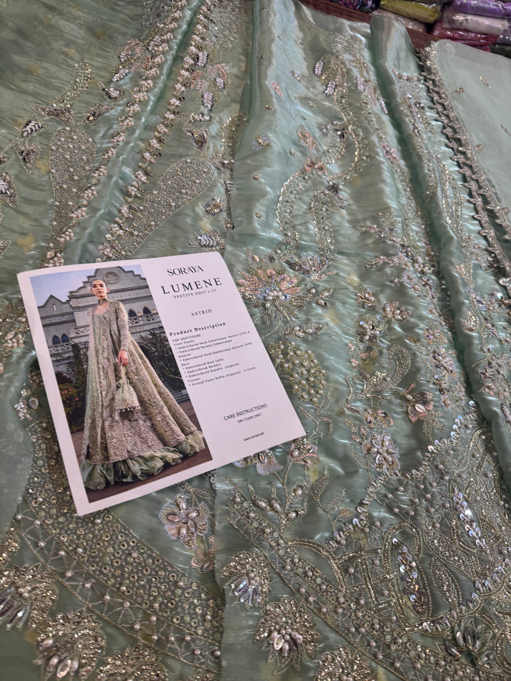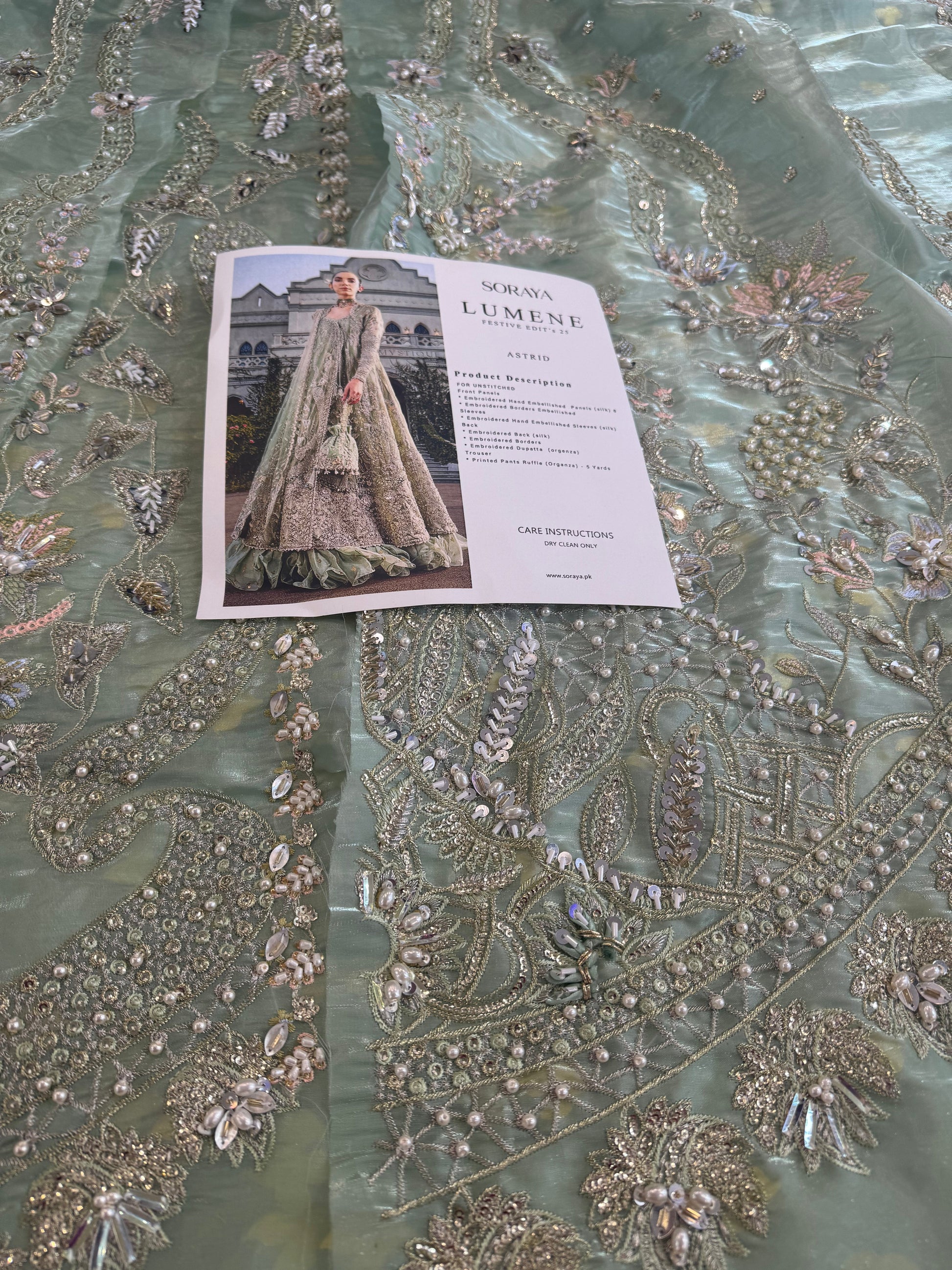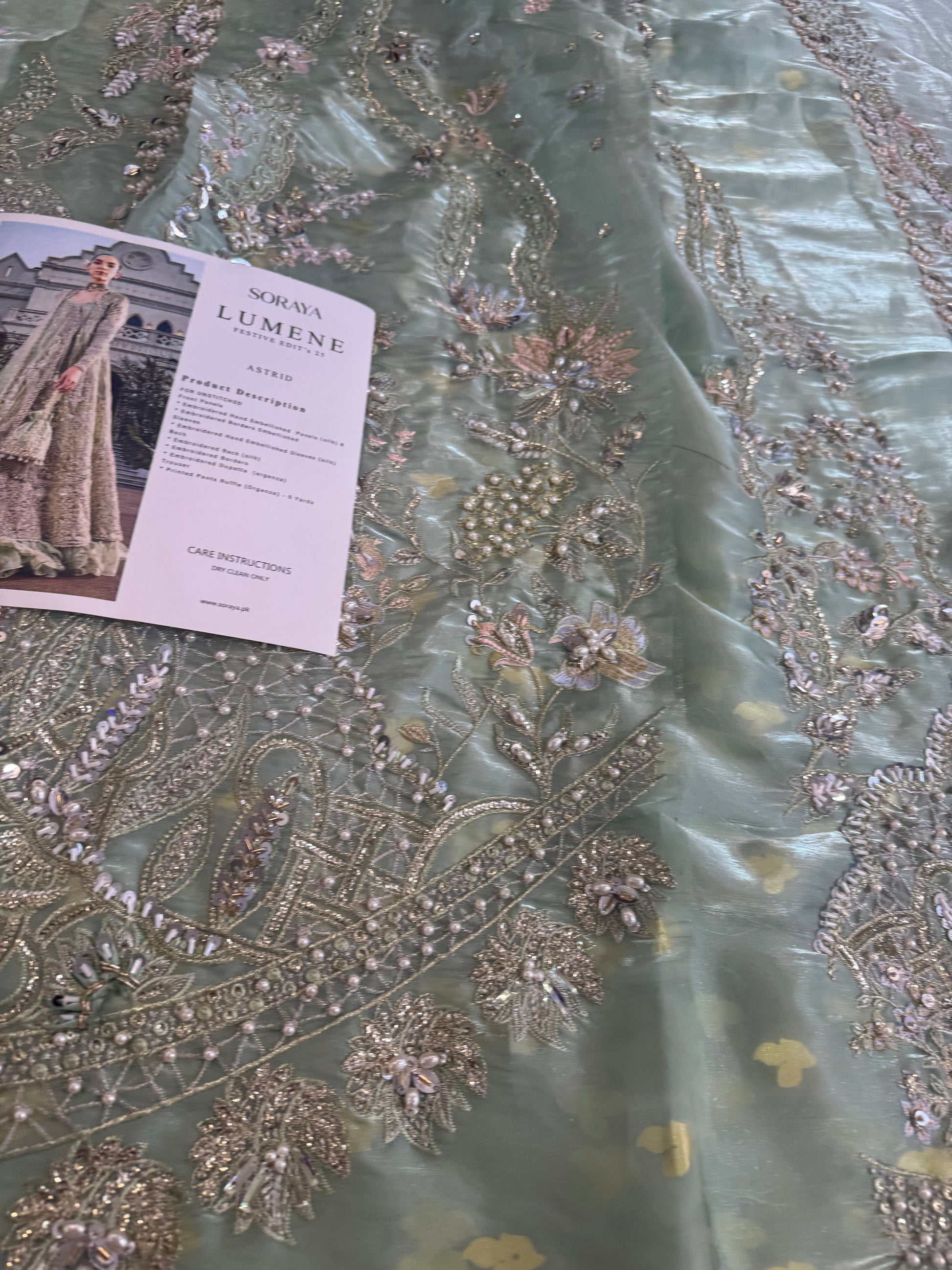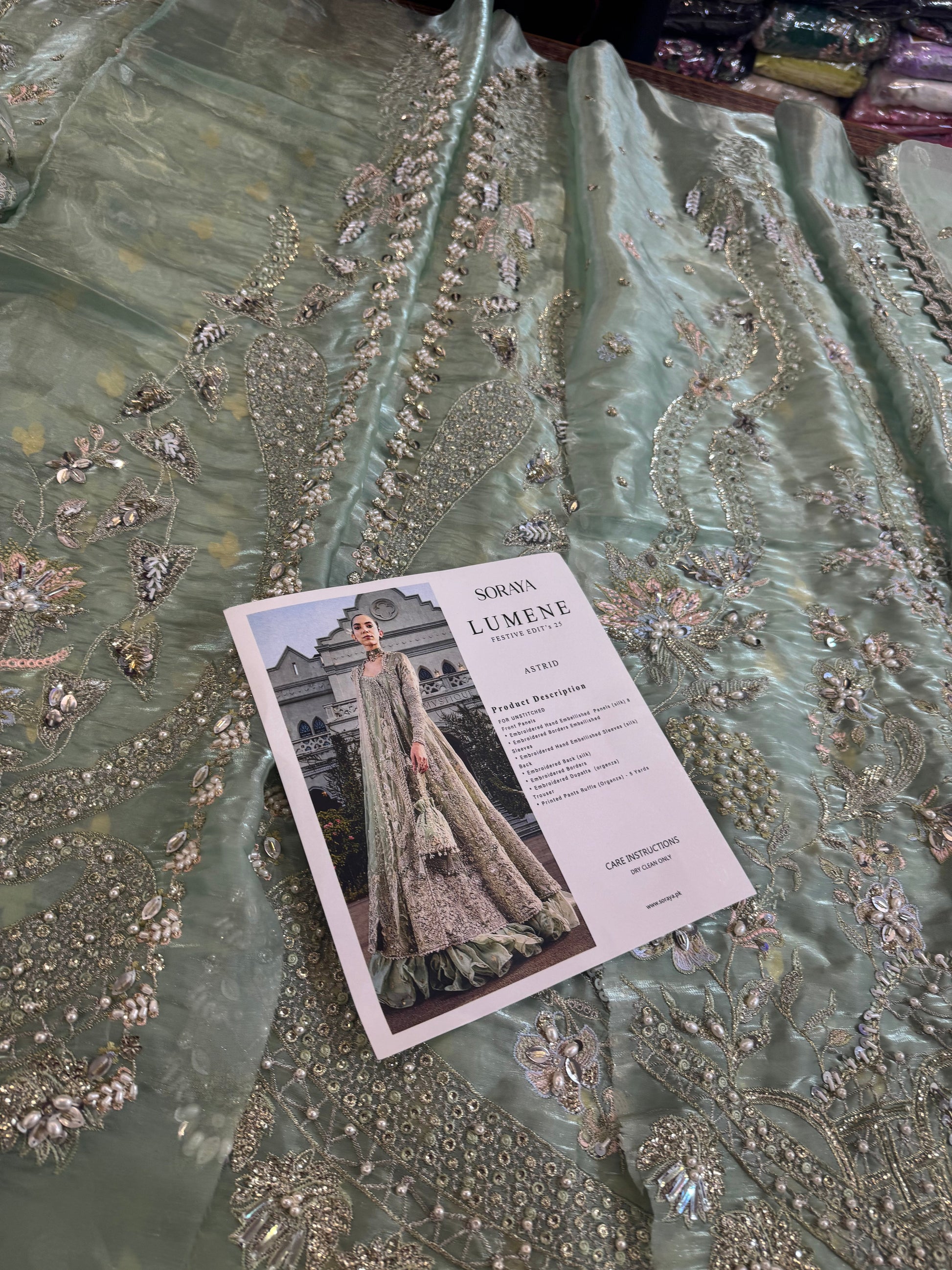 The Soraya Wedding Edition presents a stunning chiffon bridal ensemble that exudes elegance and intricate craftsmanship. This bespoke bridal dress, a part of the "Soraya Lume" collection, features a flowing silhouette in a delicate shade of mint green. The garment is richly adorned with exquisite silver and white embroidery, showcasing detailed floral and geometric patterns across the full-length jacket, inner dress, and coordinated potli bag. The look is completed with a matching choker, and the tiered skirt adds a beautiful, voluminous movement.