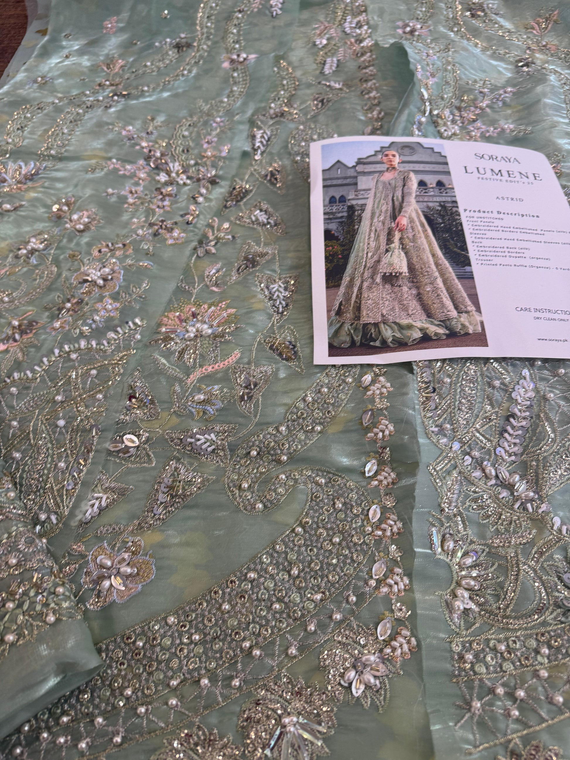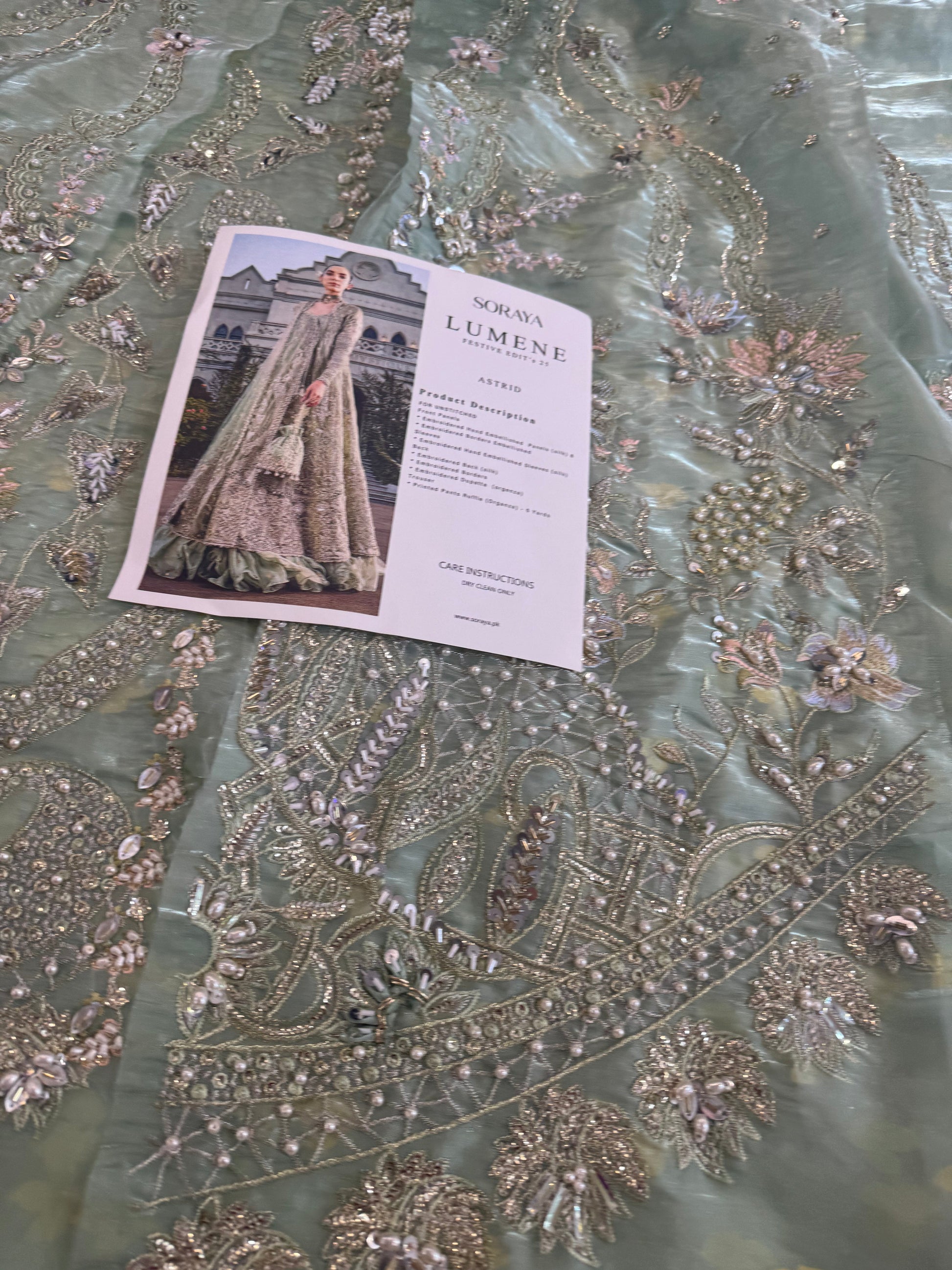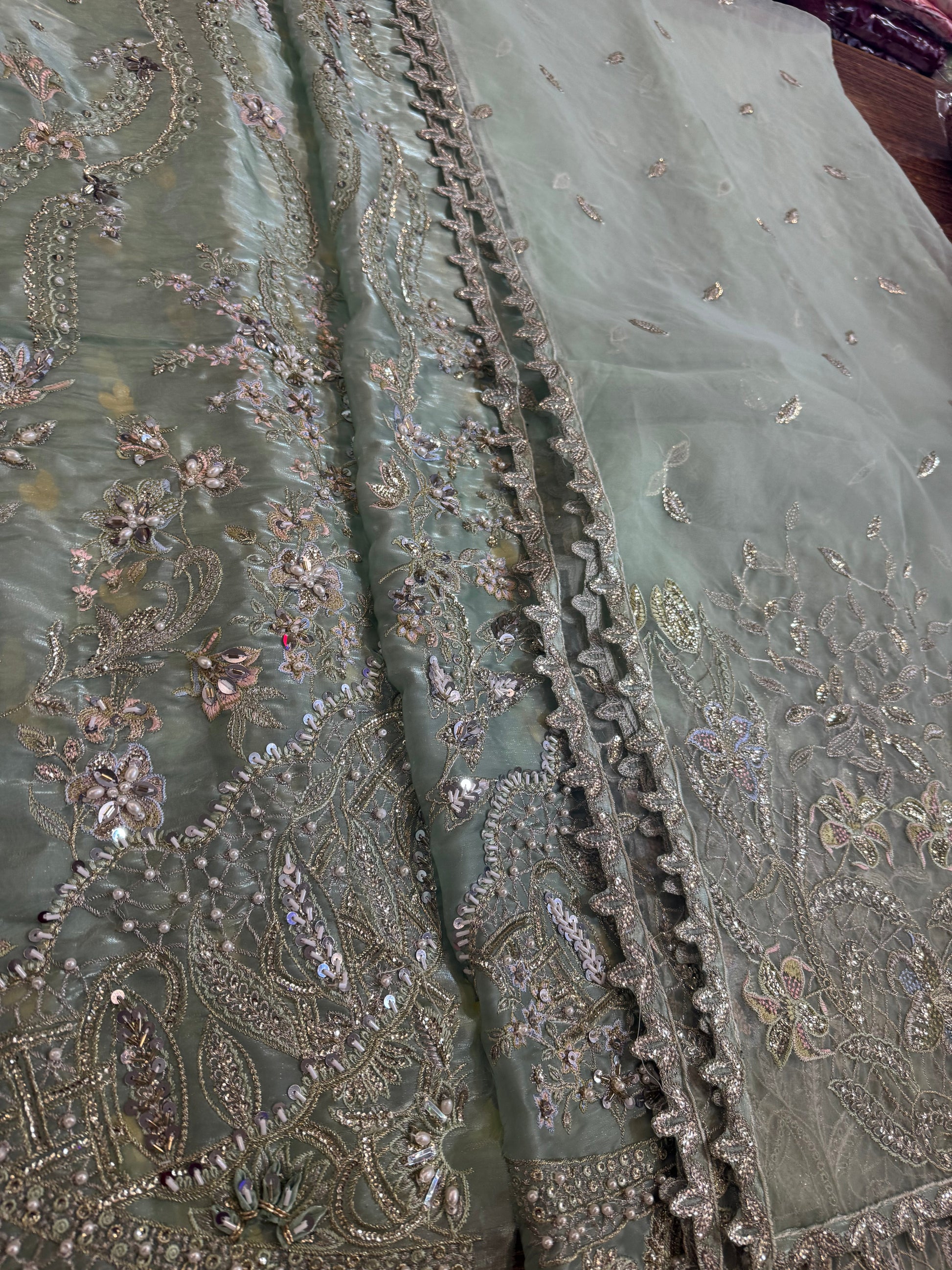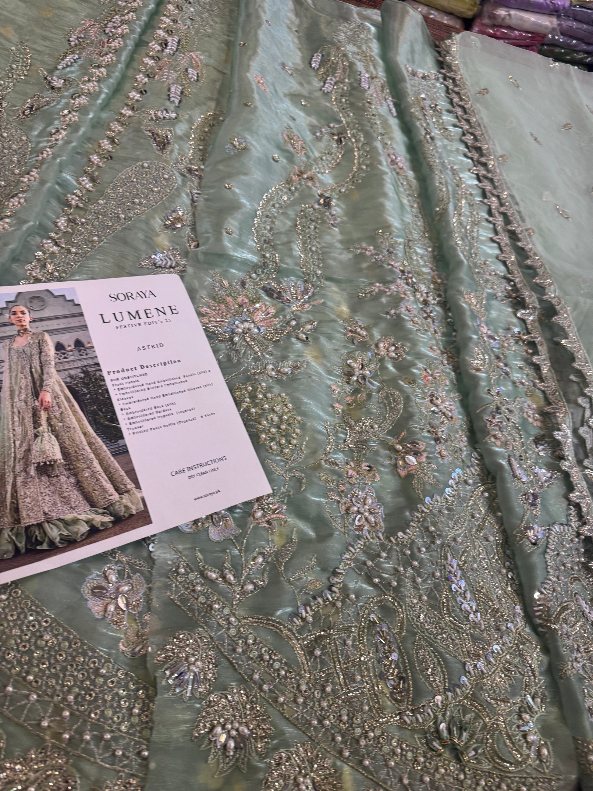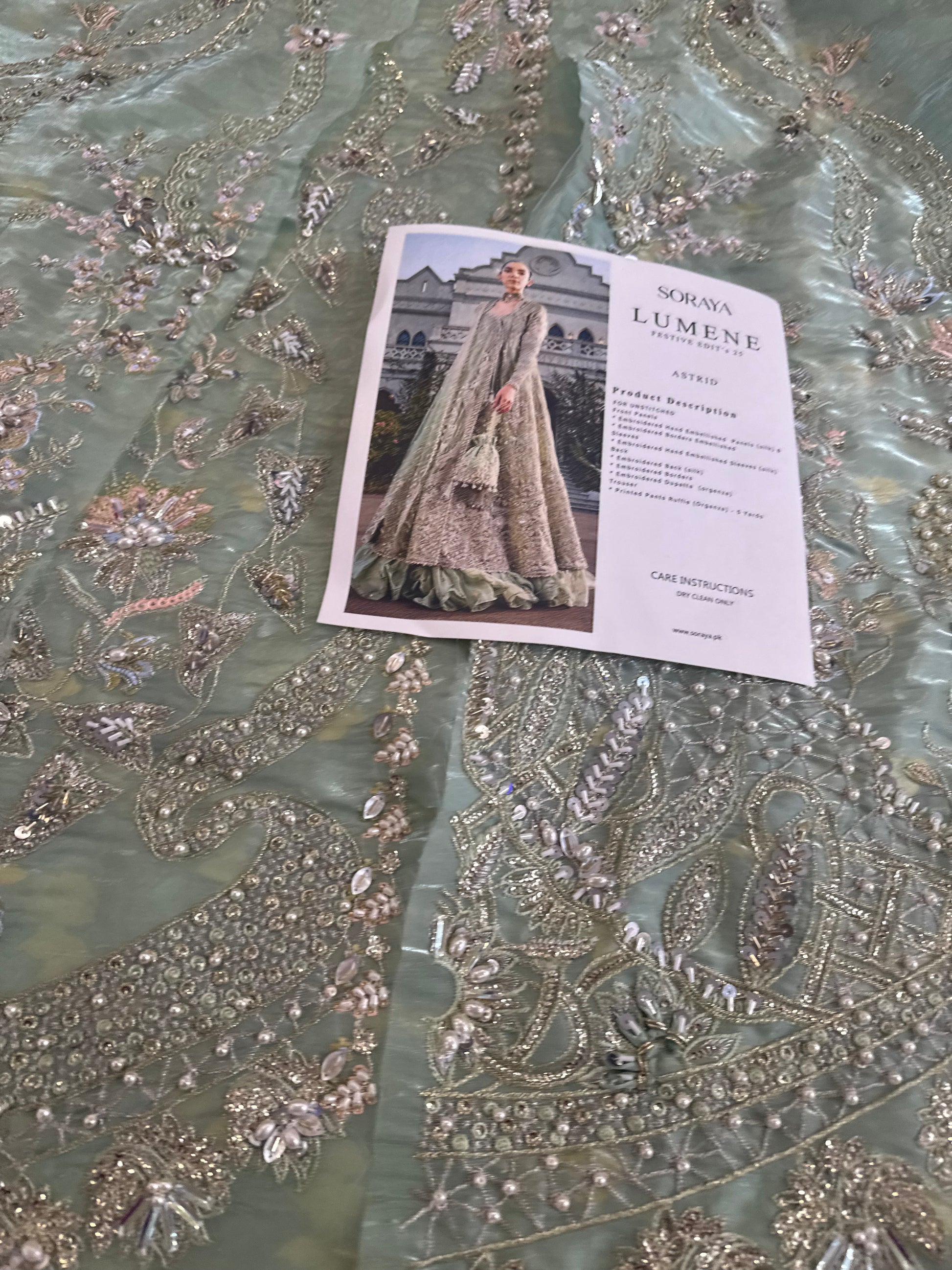 The Soraya Wedding Edition presents a stunning chiffon bridal ensemble that exudes elegance and intricate craftsmanship. This bespoke bridal dress, a part of the "Soraya Lume" collection, features a flowing silhouette in a delicate shade of mint green. The garment is richly adorned with exquisite silver and white embroidery, showcasing detailed floral and geometric patterns across the full-length jacket, inner dress, and coordinated potli bag. The look is completed with a matching choker, and the tiered skirt adds a beautiful, voluminous movement.
