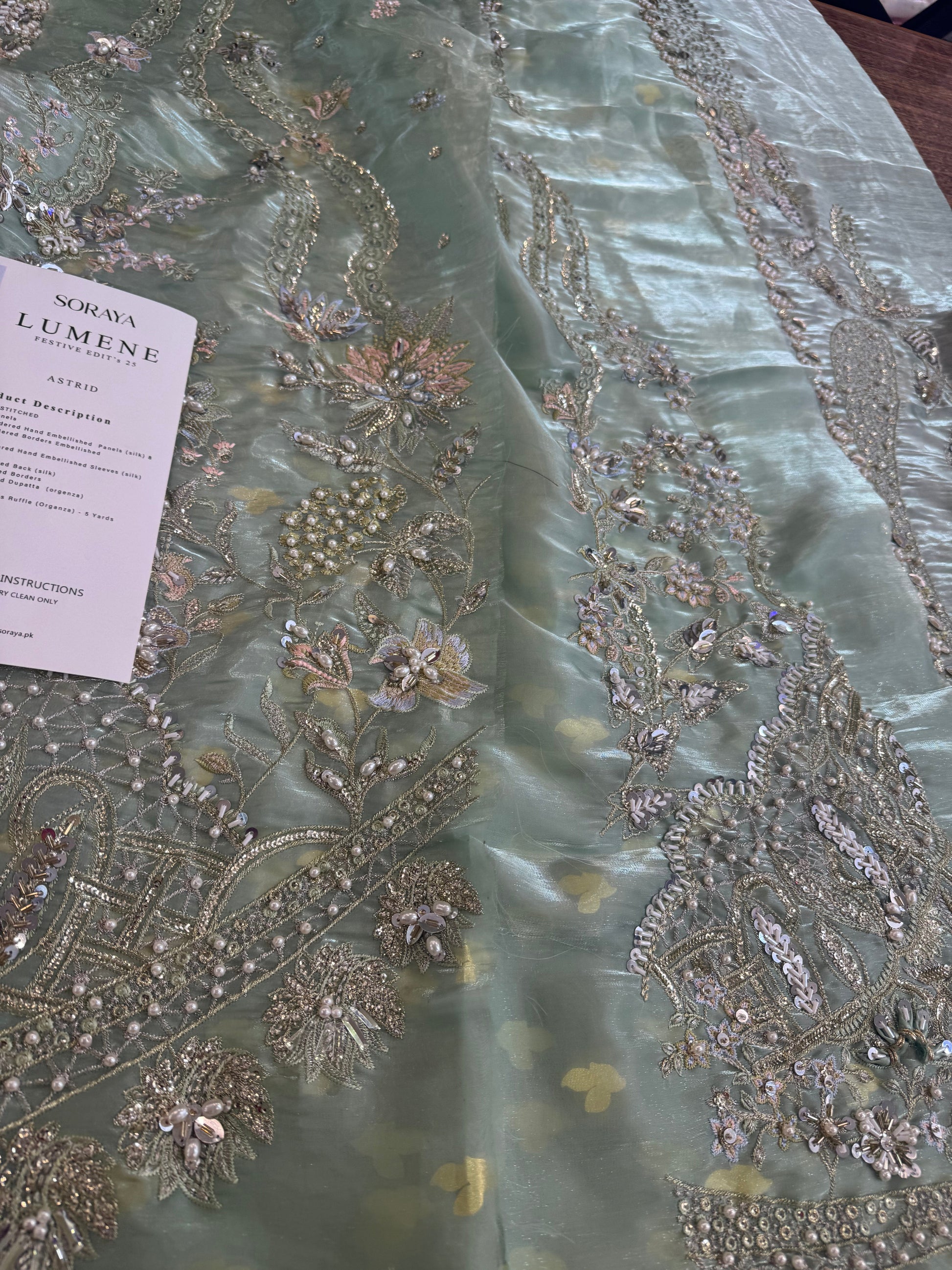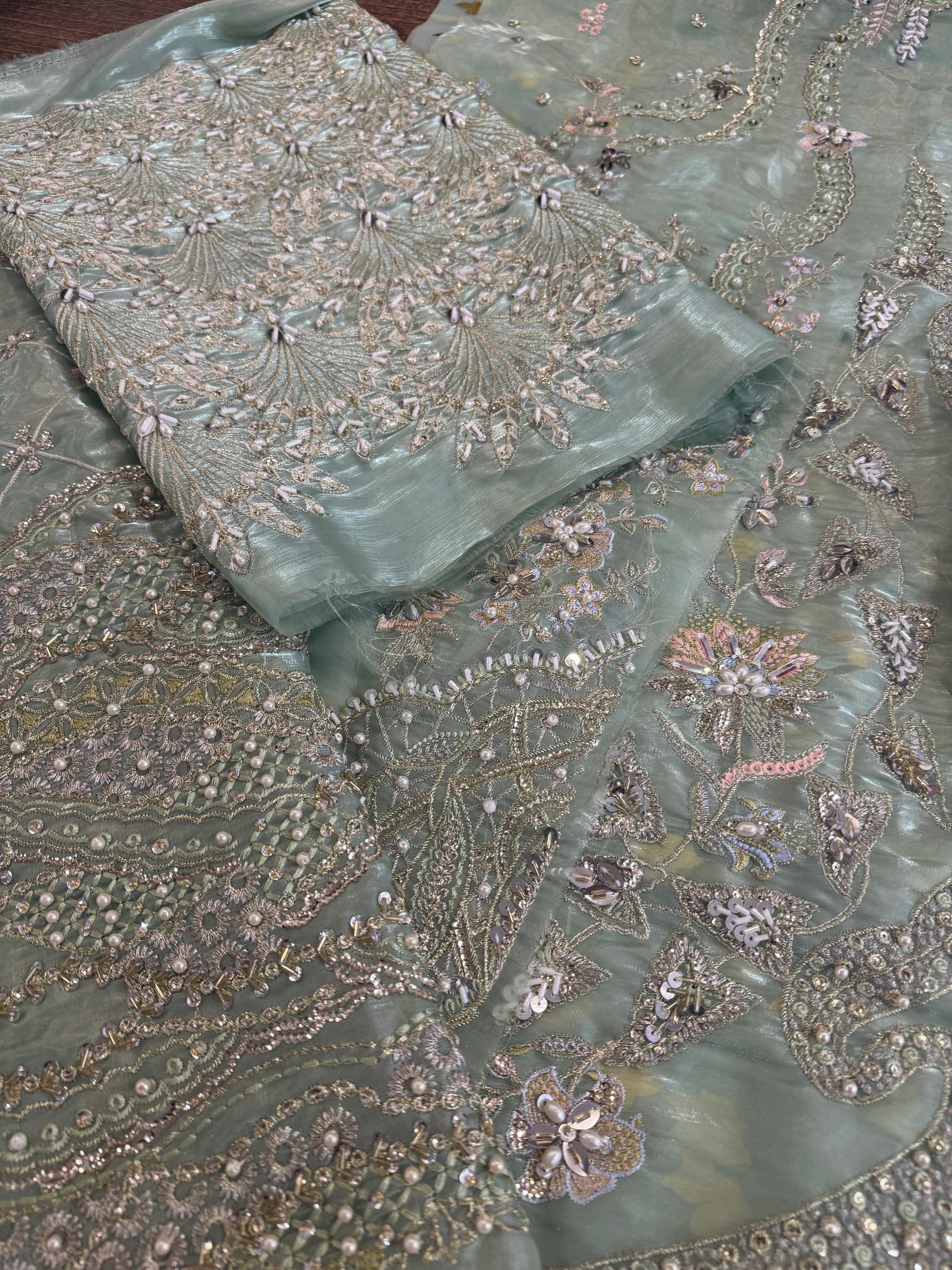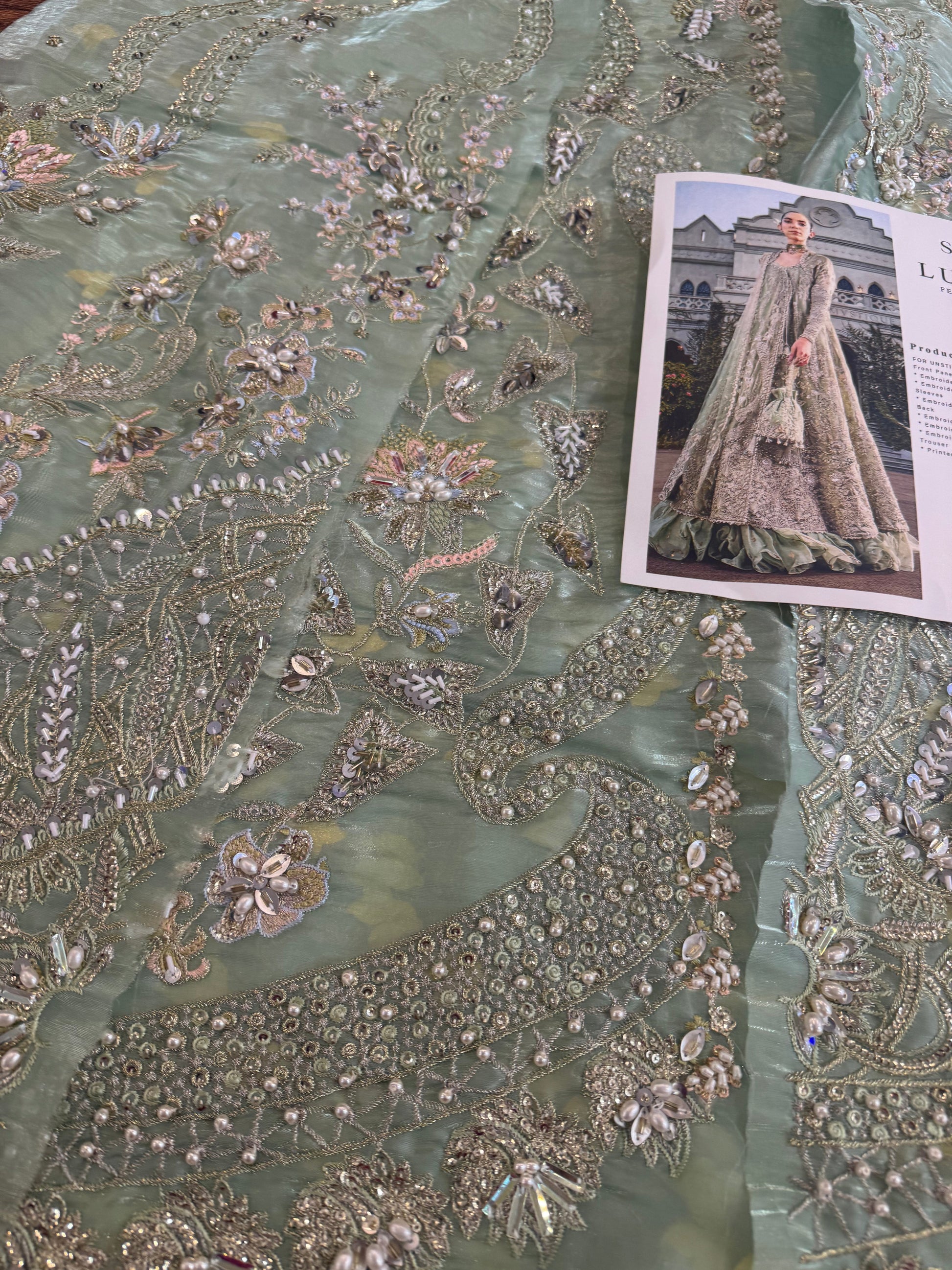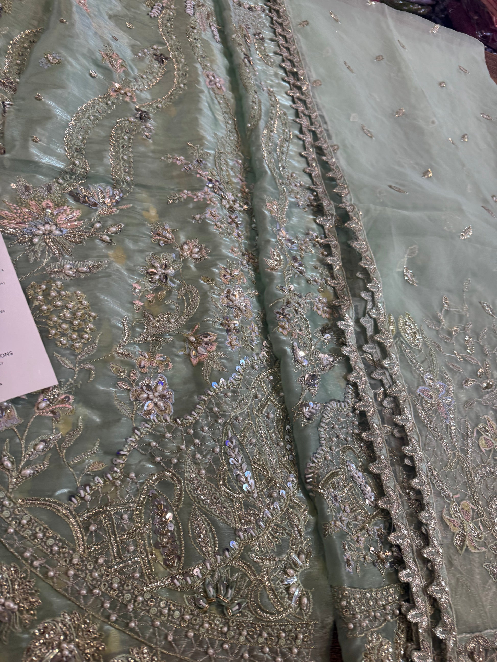 The Soraya Wedding Edition presents a stunning chiffon bridal ensemble that exudes elegance and intricate craftsmanship. This bespoke bridal dress, a part of the "Soraya Lume" collection, features a flowing silhouette in a delicate shade of mint green. The garment is richly adorned with exquisite silver and white embroidery, showcasing detailed floral and geometric patterns across the full-length jacket, inner dress, and coordinated potli bag. The look is completed with a matching choker, and the tiered skirt adds a beautiful, voluminous movement.