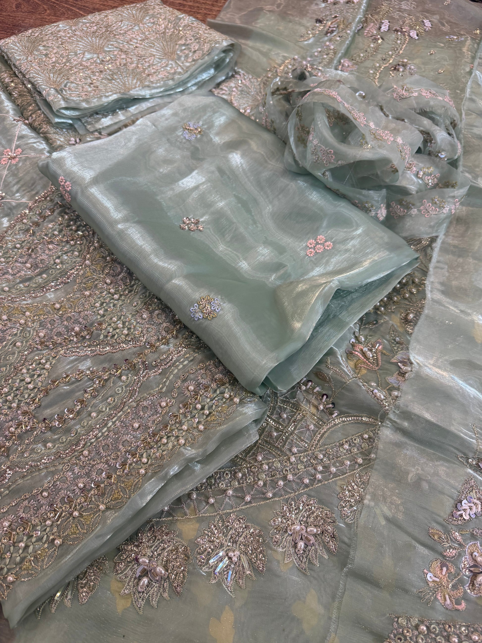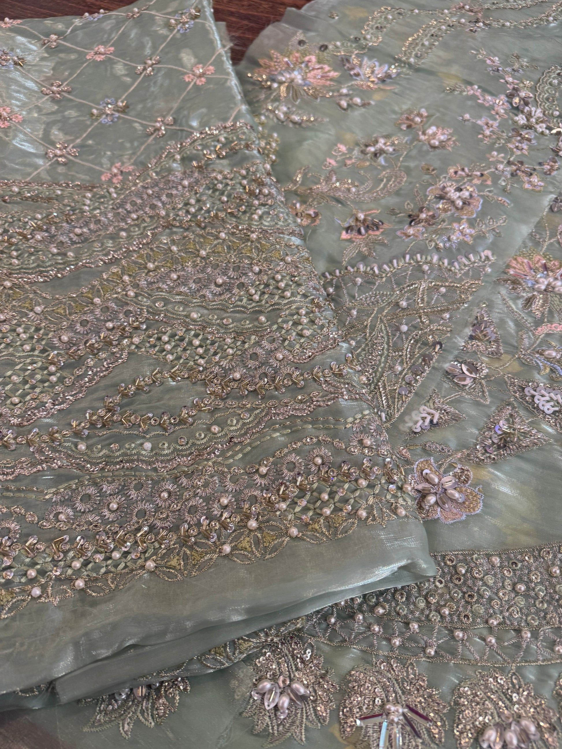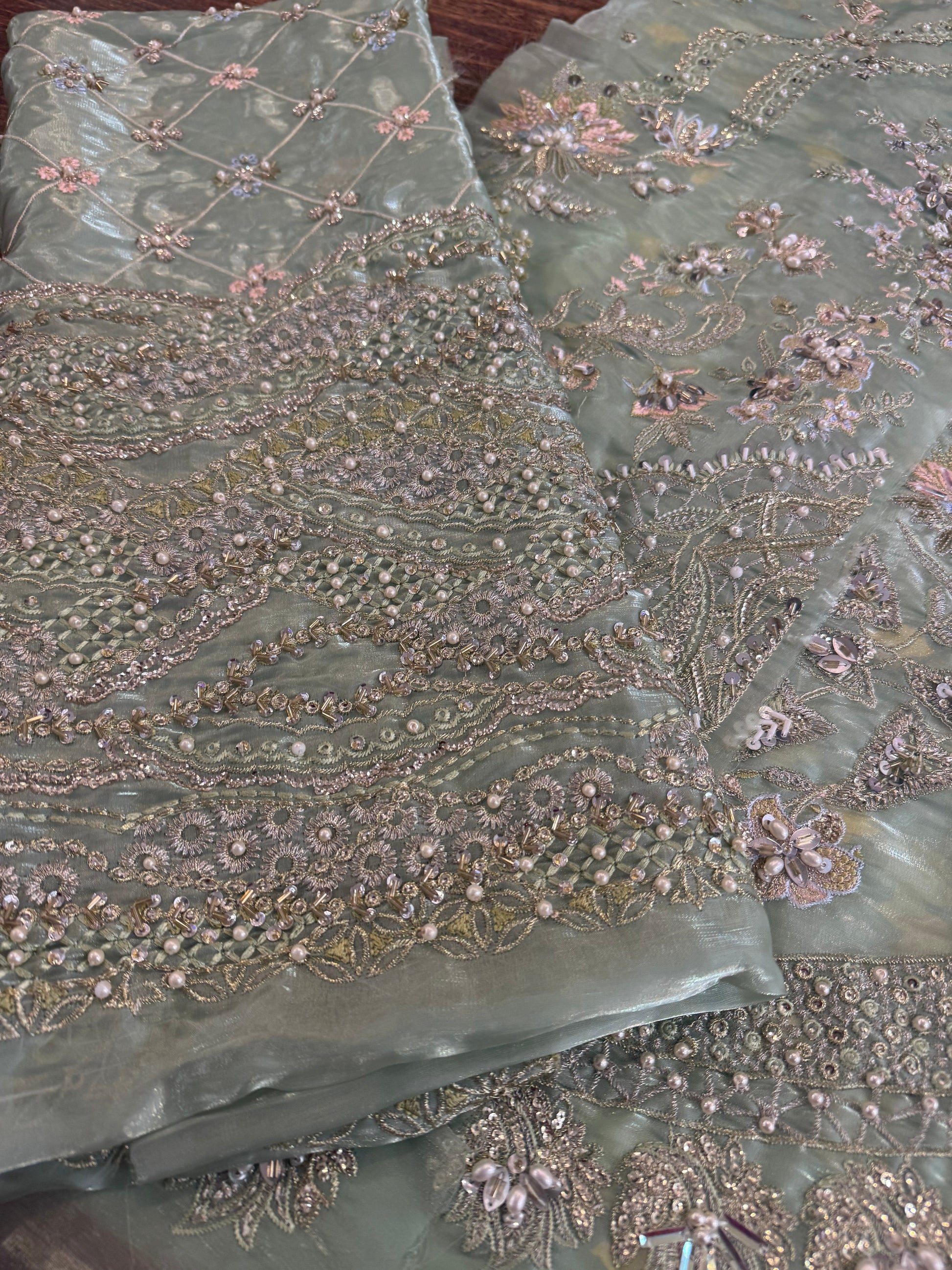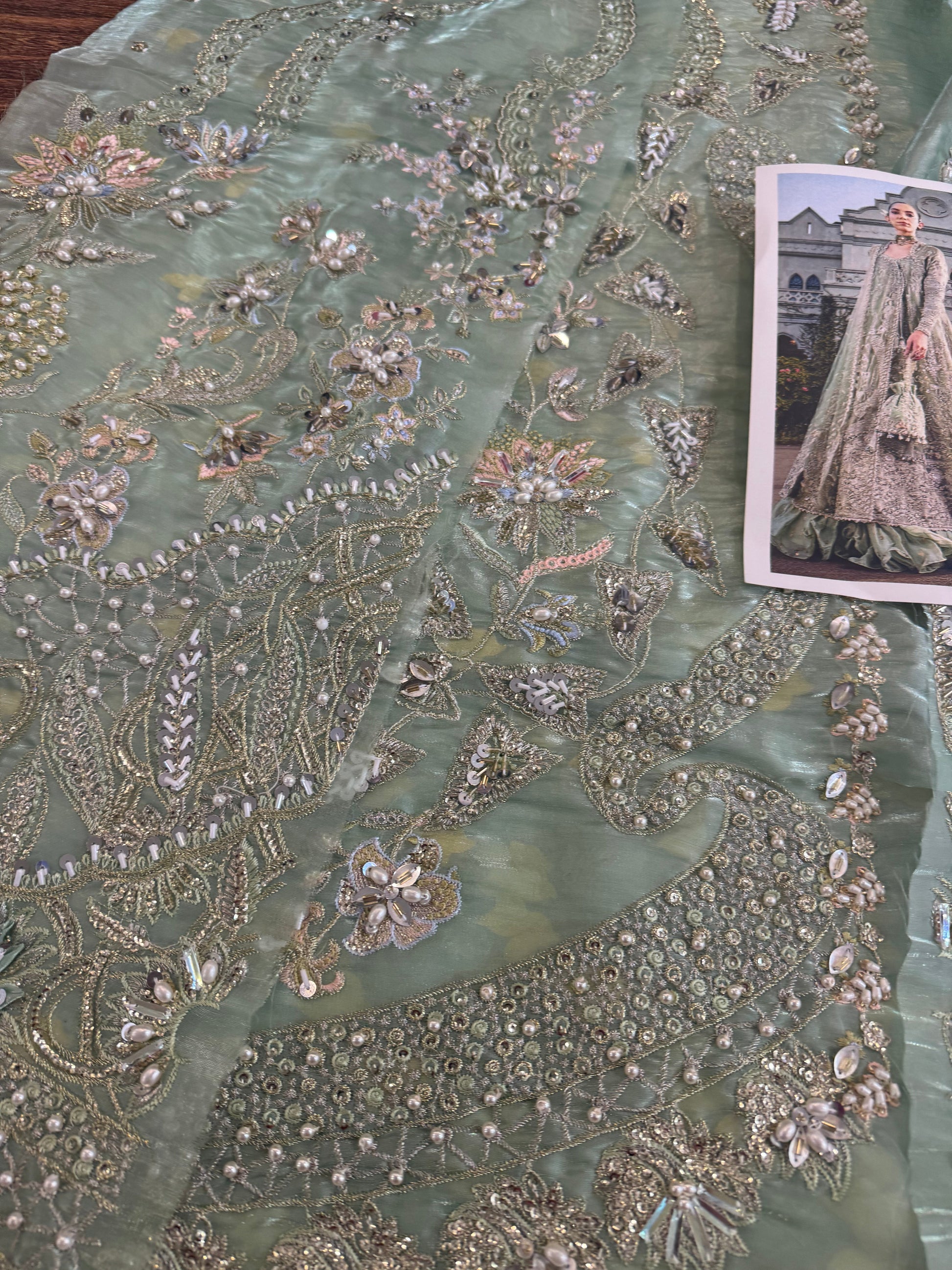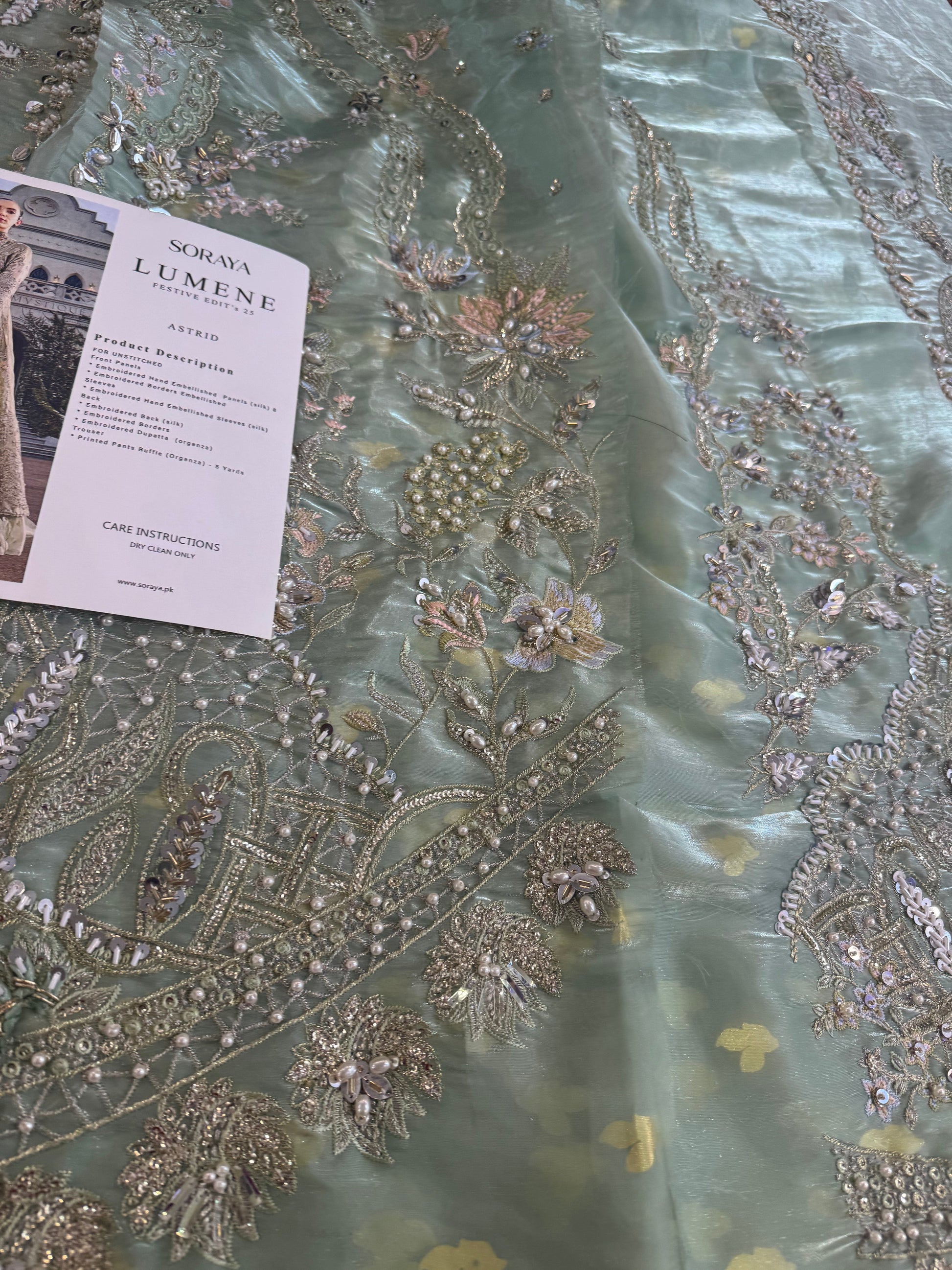 The Soraya Wedding Edition presents a stunning chiffon bridal ensemble that exudes elegance and intricate craftsmanship. This bespoke bridal dress, a part of the "Soraya Lume" collection, features a flowing silhouette in a delicate shade of mint green. The garment is richly adorned with exquisite silver and white embroidery, showcasing detailed floral and geometric patterns across the full-length jacket, inner dress, and coordinated potli bag. The look is completed with a matching choker, and the tiered skirt adds a beautiful, voluminous movement.