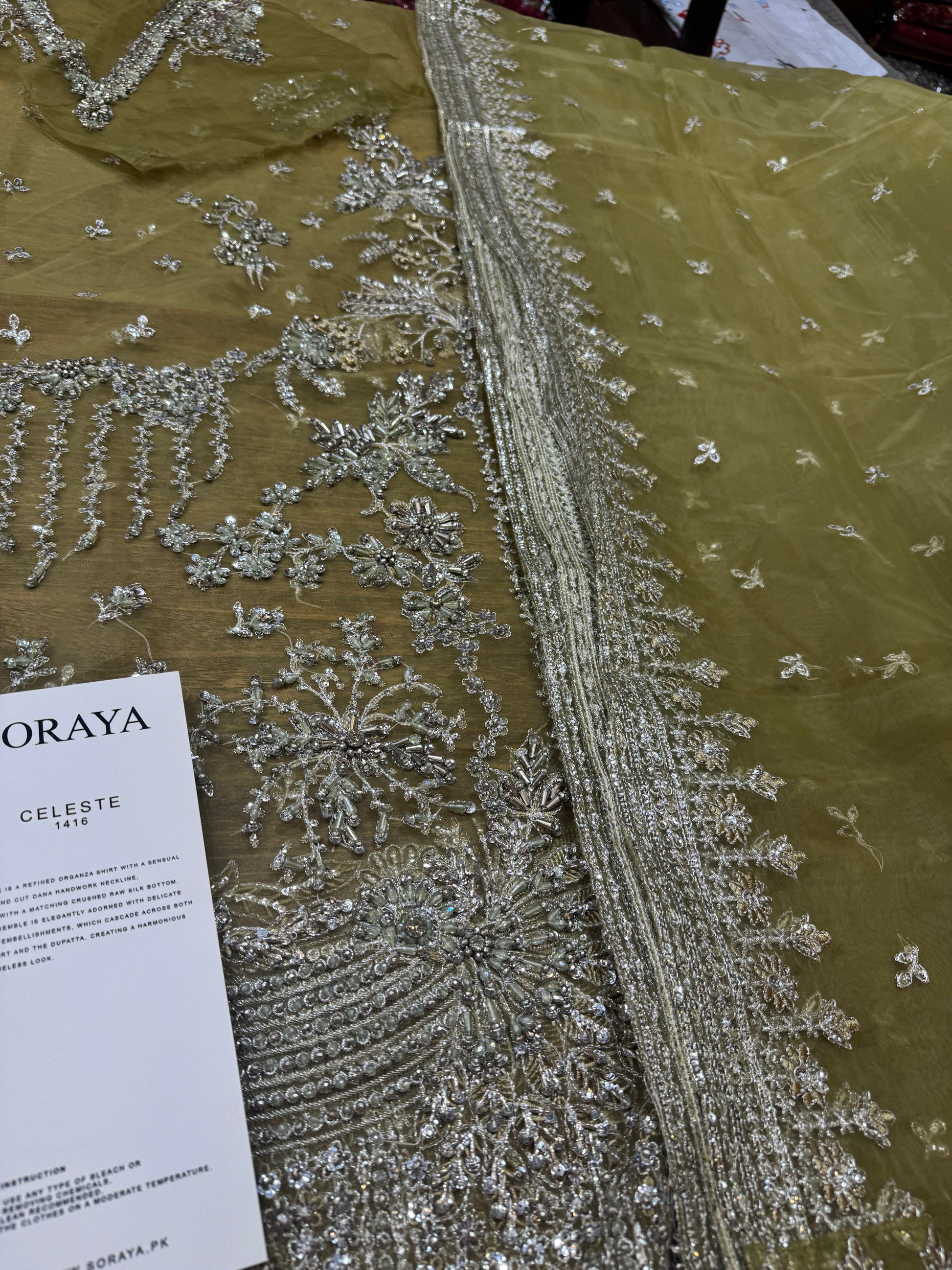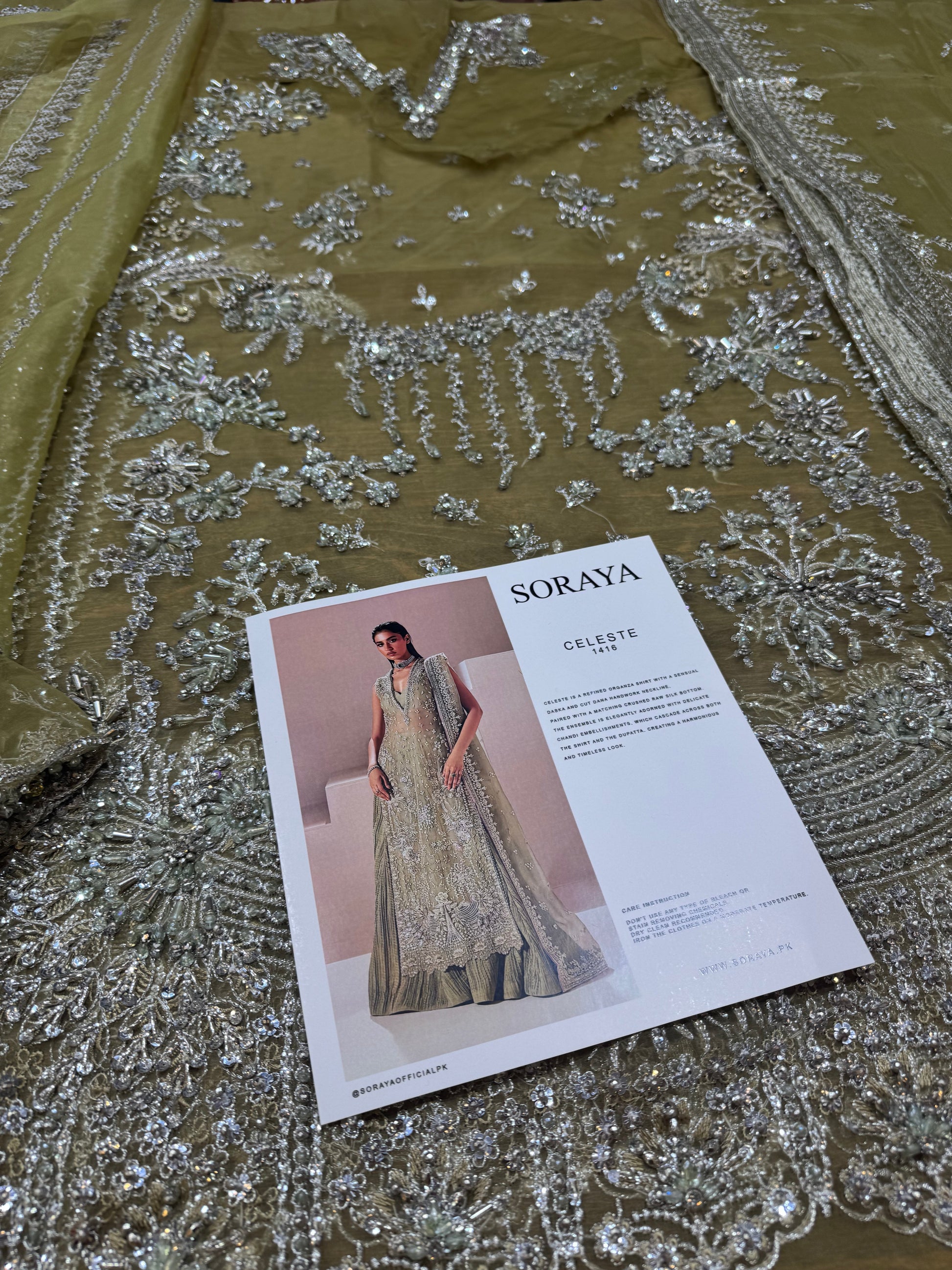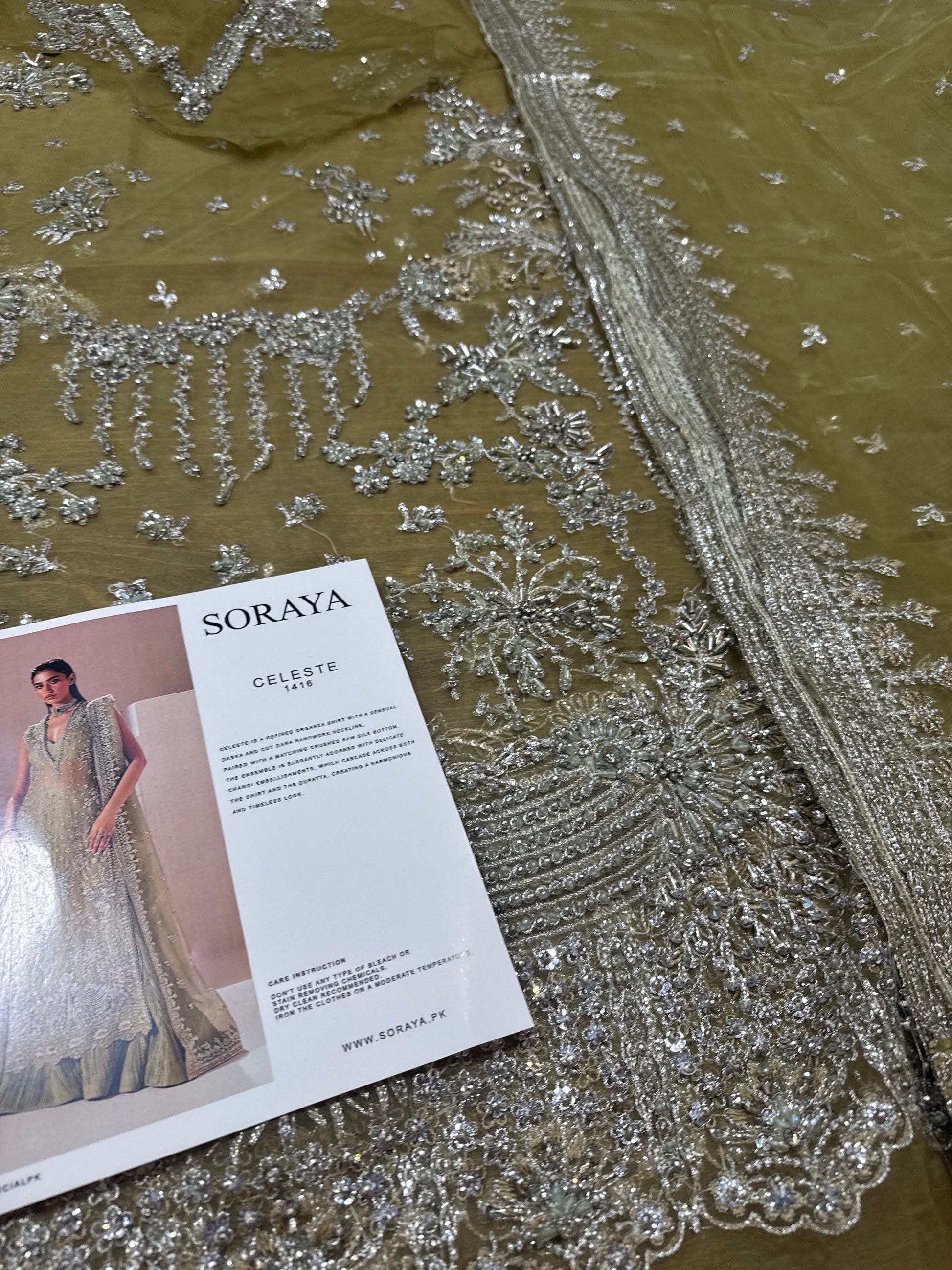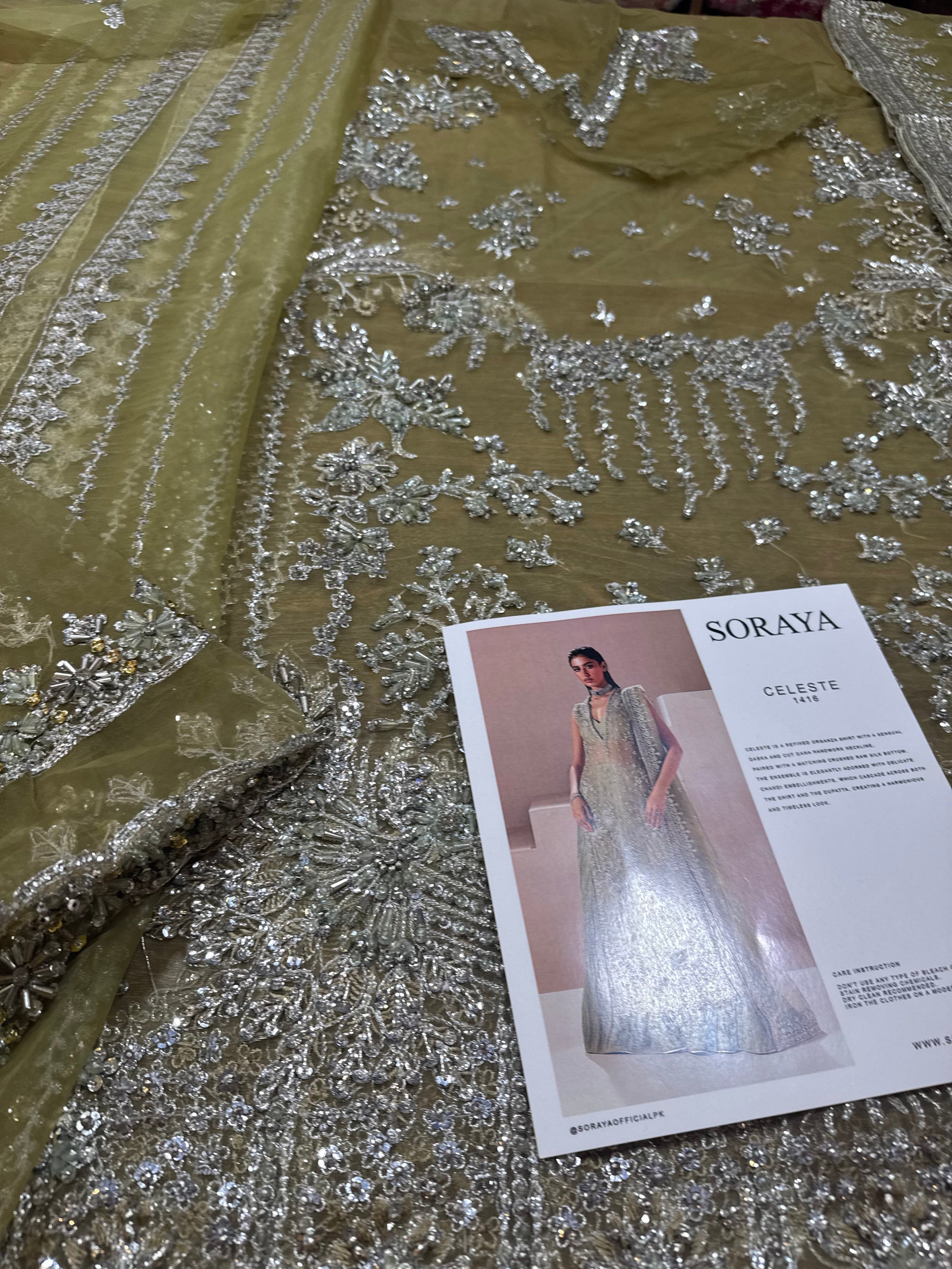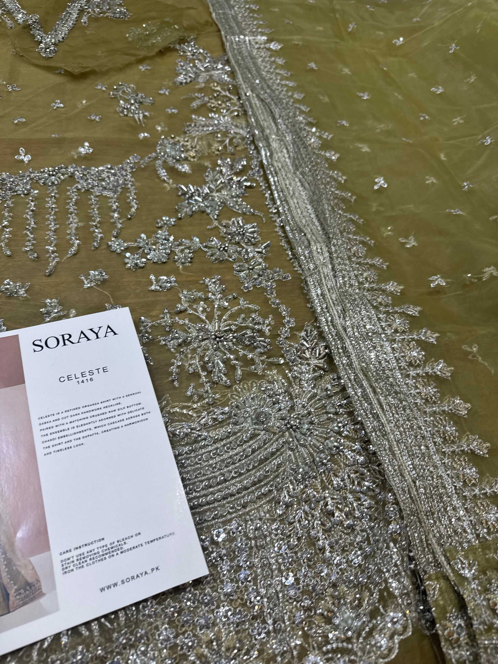 Celeste is a refined organza shirt with a sensual dabka and cut dana handwork neckline, paired with a matching crushed raw silk bottom. The ensemble is elegantly adorned with delicate chandi embellishments, which cascade across both the shirt and the dupatta, creating a harmonious and timeless look.