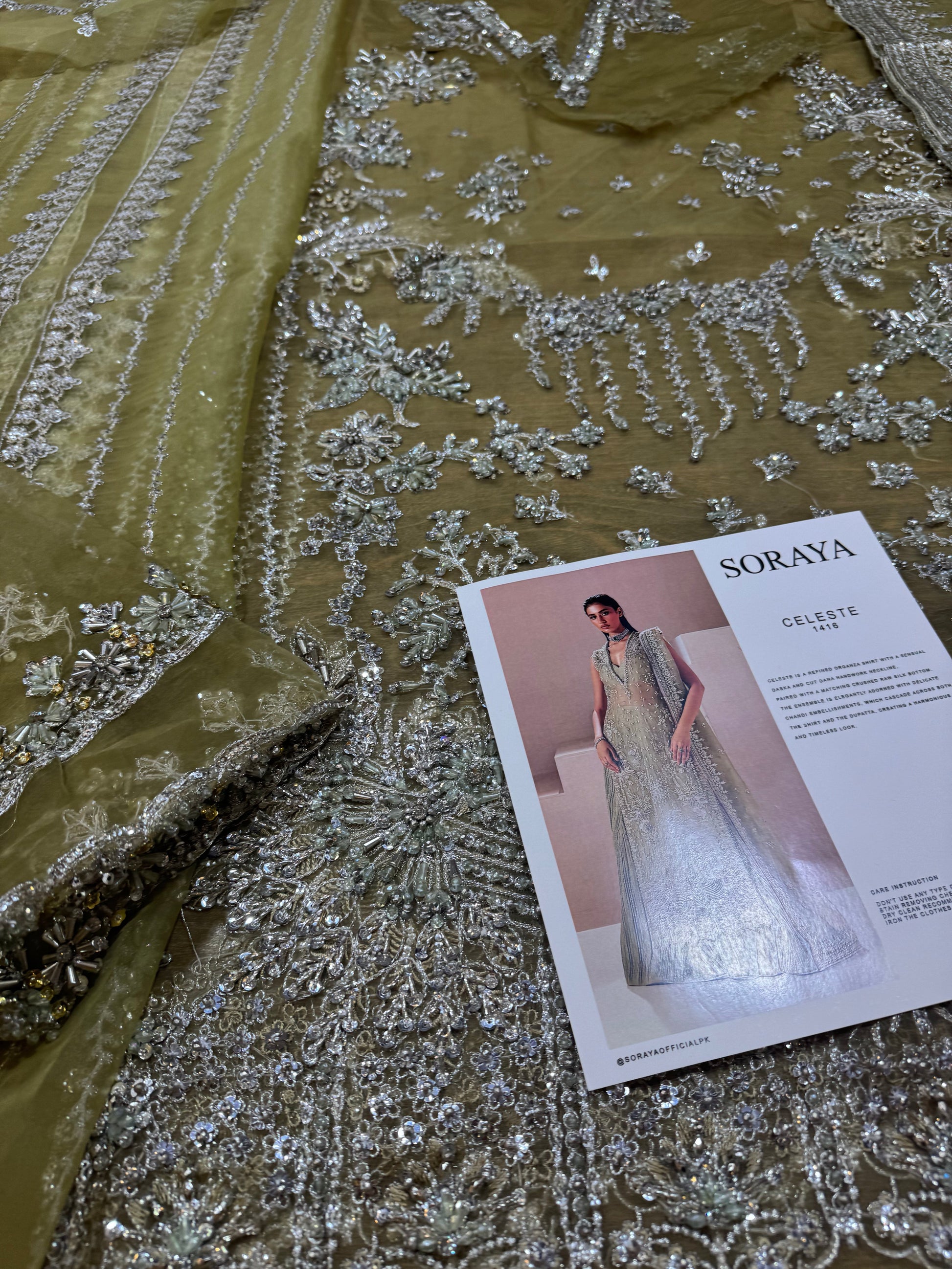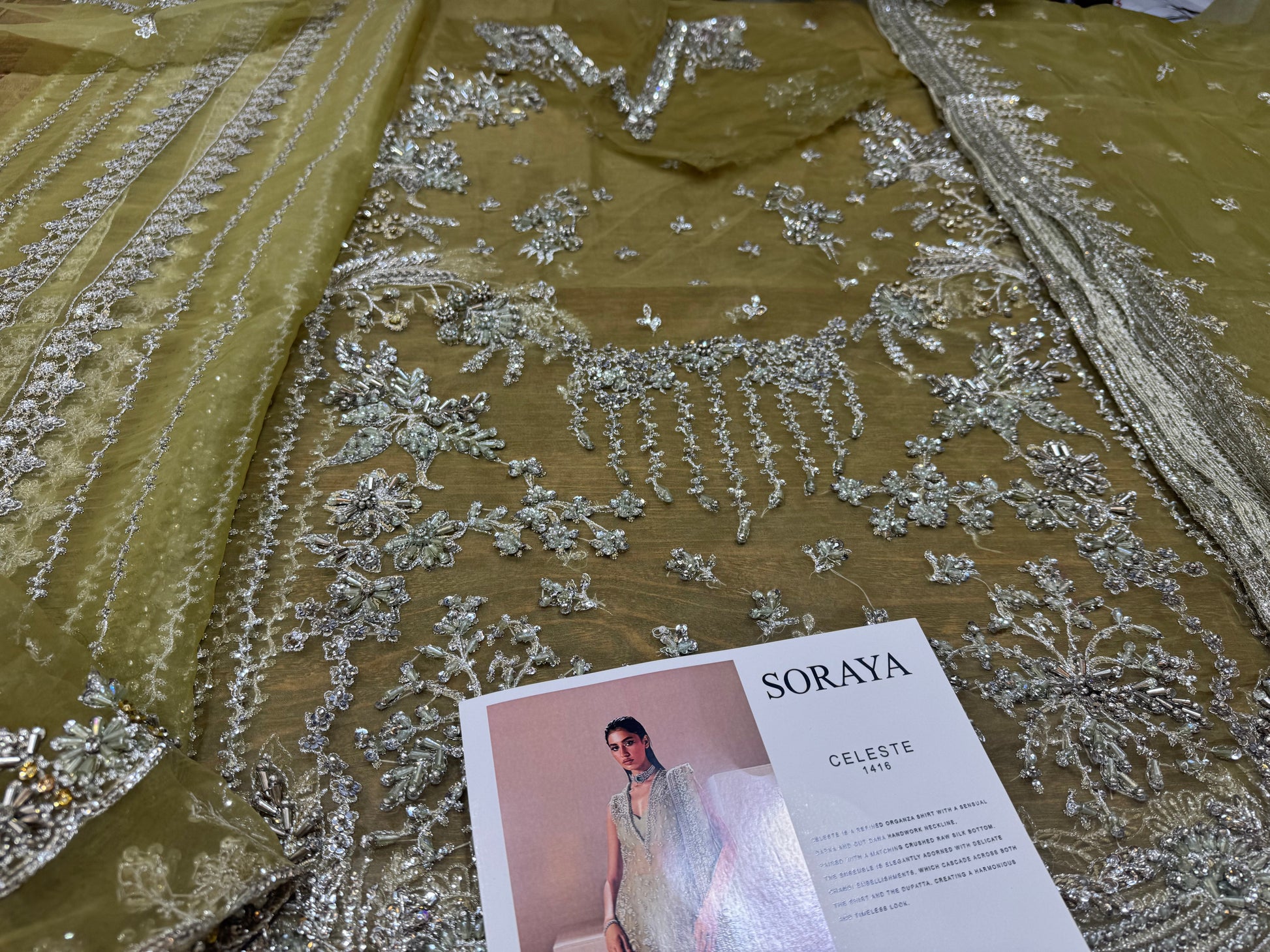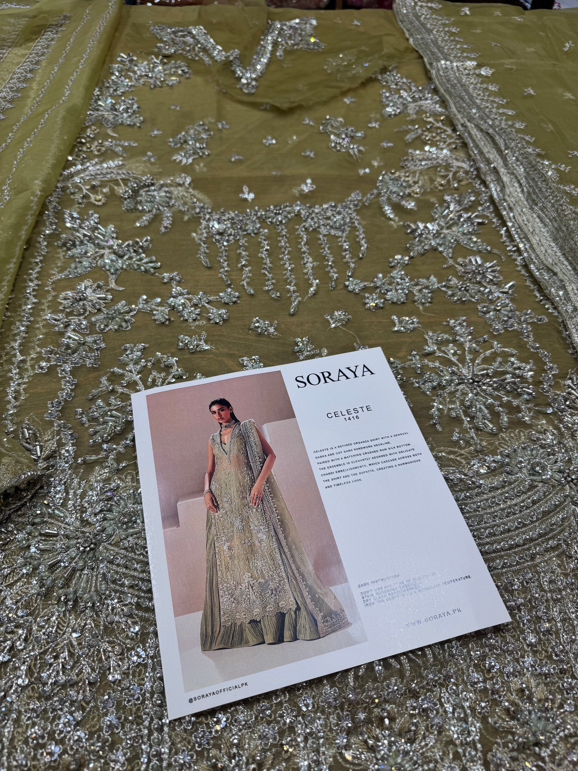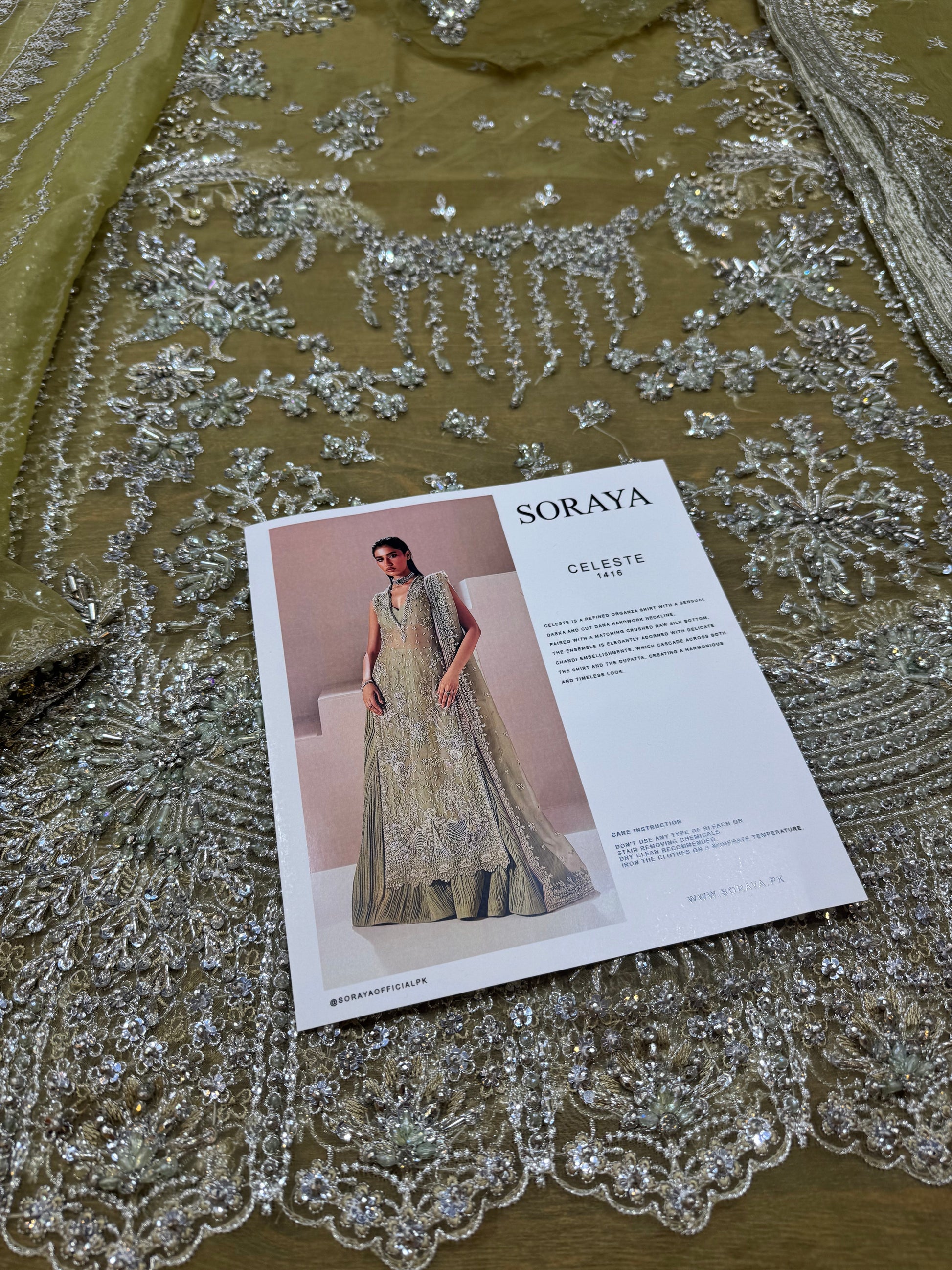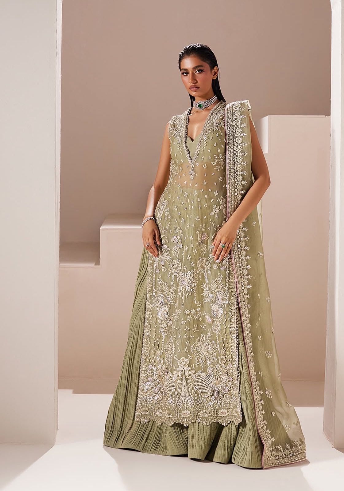 Celeste is a refined organza shirt with a sensual dabka and cut dana handwork neckline, paired with a matching crushed raw silk bottom. The ensemble is elegantly adorned with delicate chandi embellishments, which cascade across both the shirt and the dupatta, creating a harmonious and timeless look.