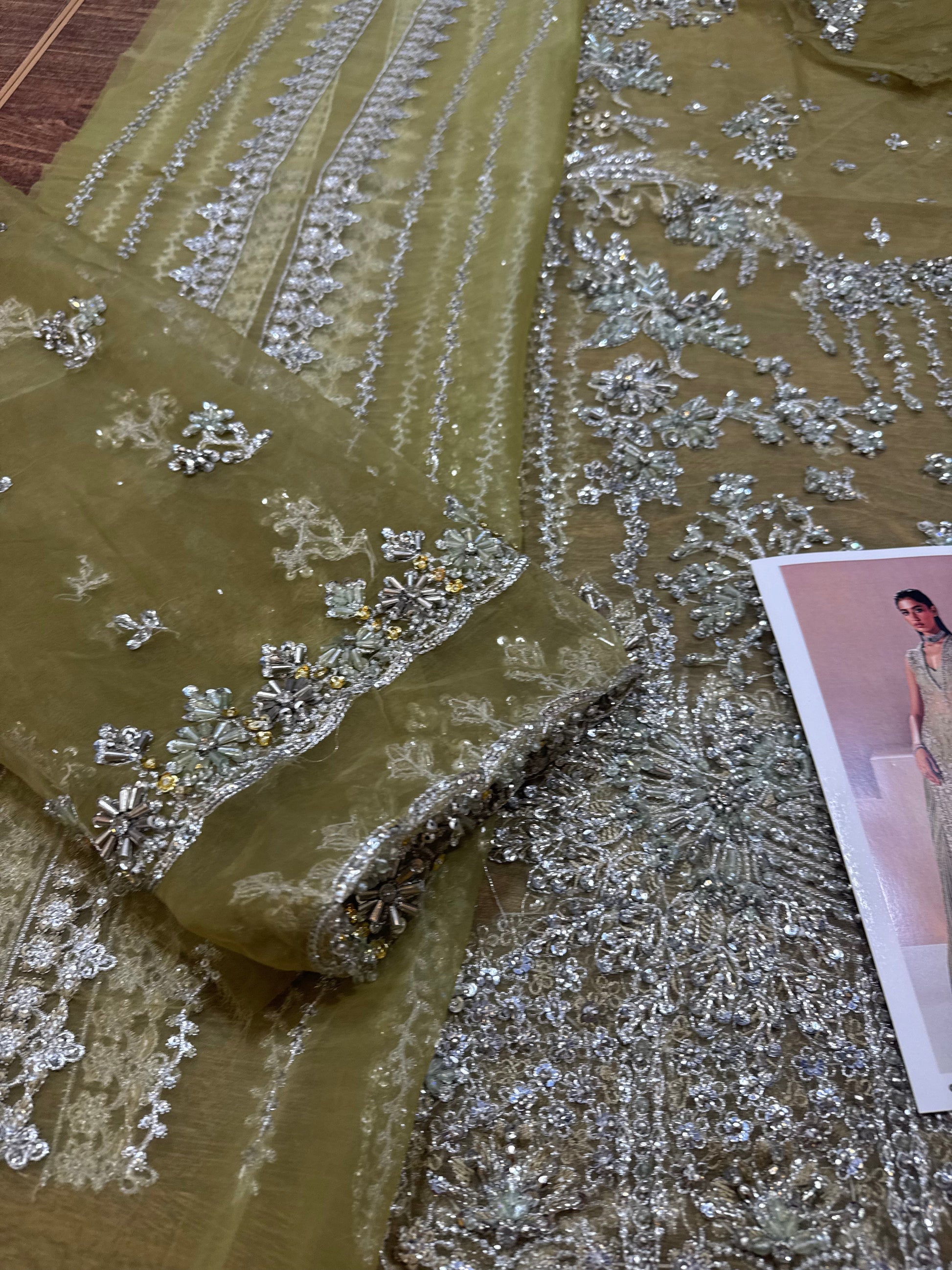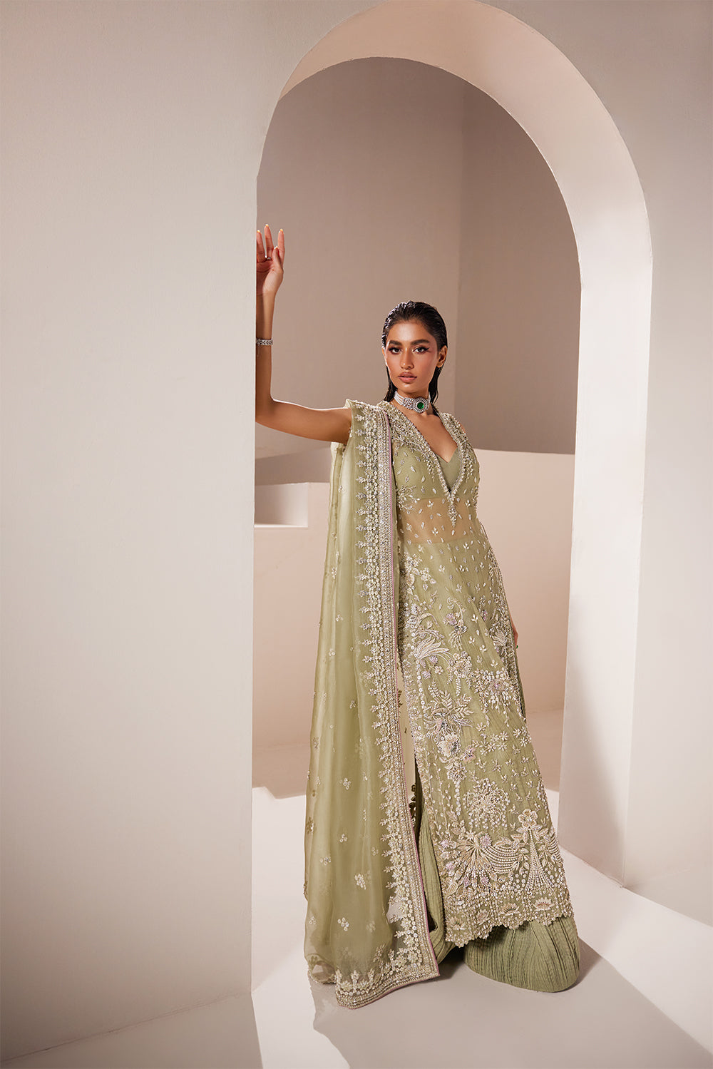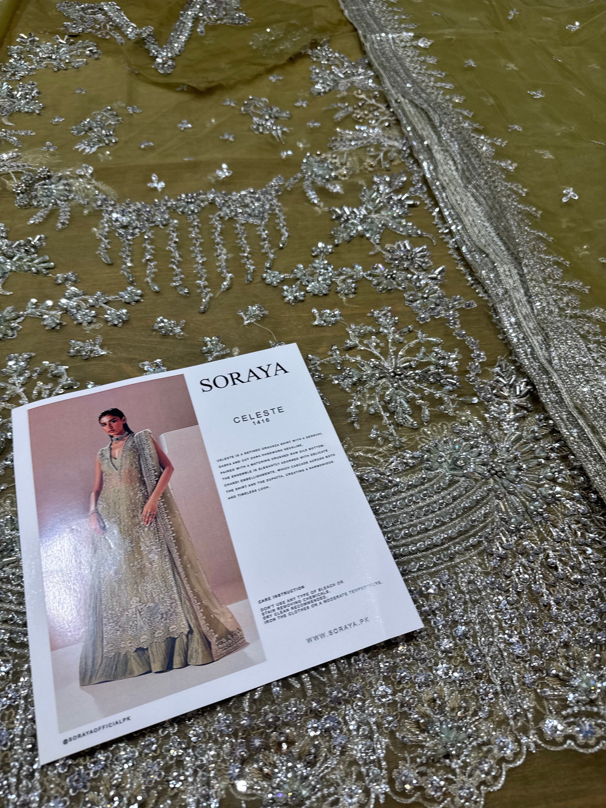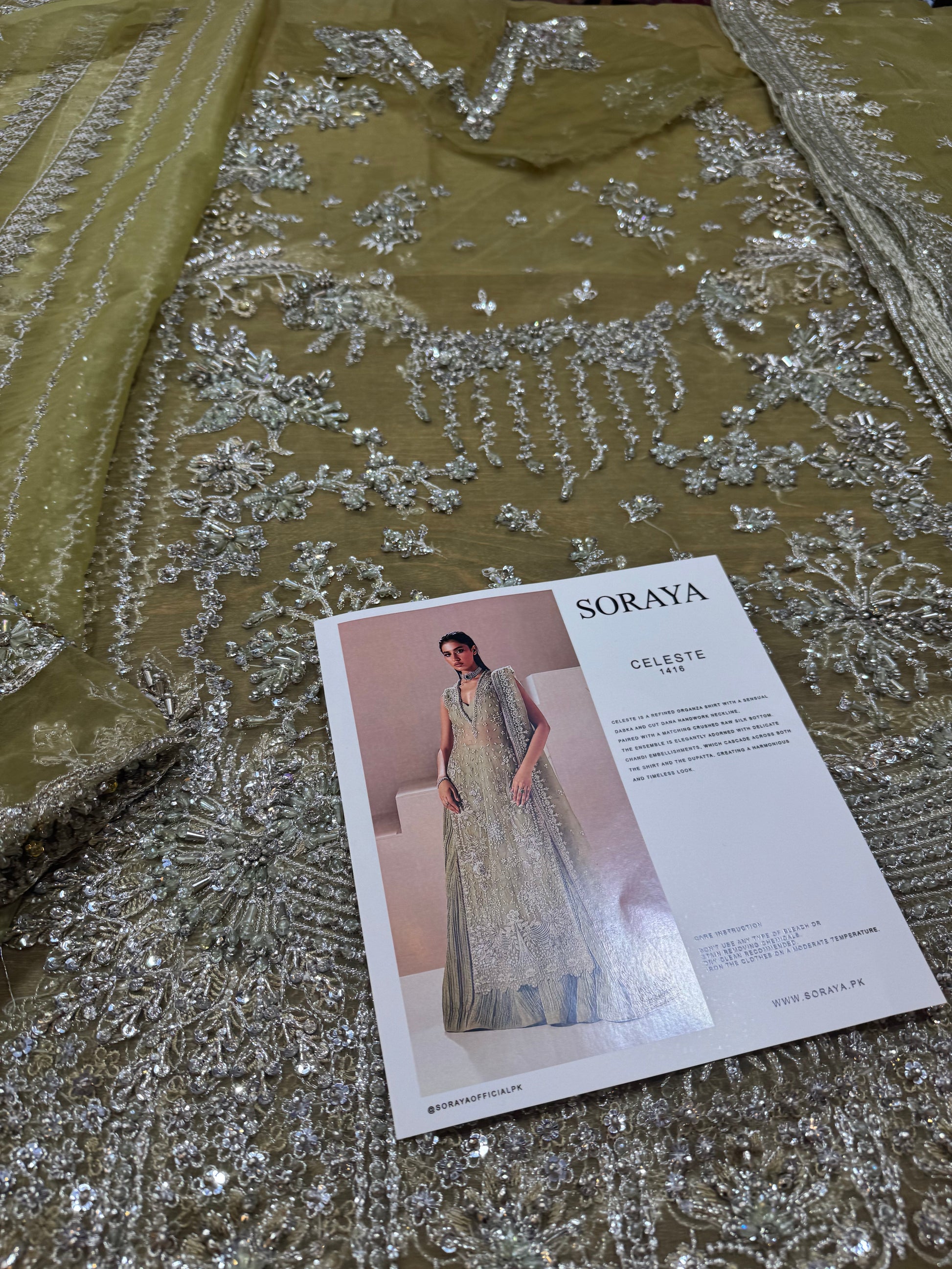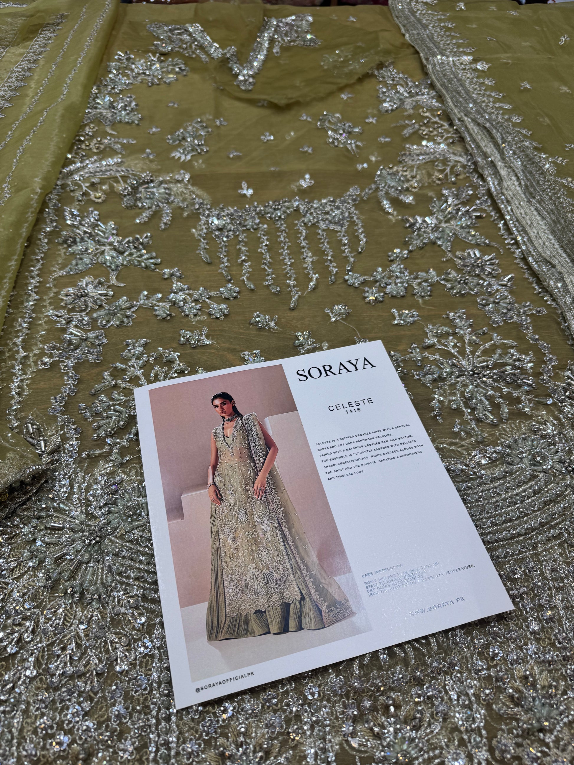 Celeste is a refined organza shirt with a sensual dabka and cut dana handwork neckline, paired with a matching crushed raw silk bottom. The ensemble is elegantly adorned with delicate chandi embellishments, which cascade across both the shirt and the dupatta, creating a harmonious and timeless look.