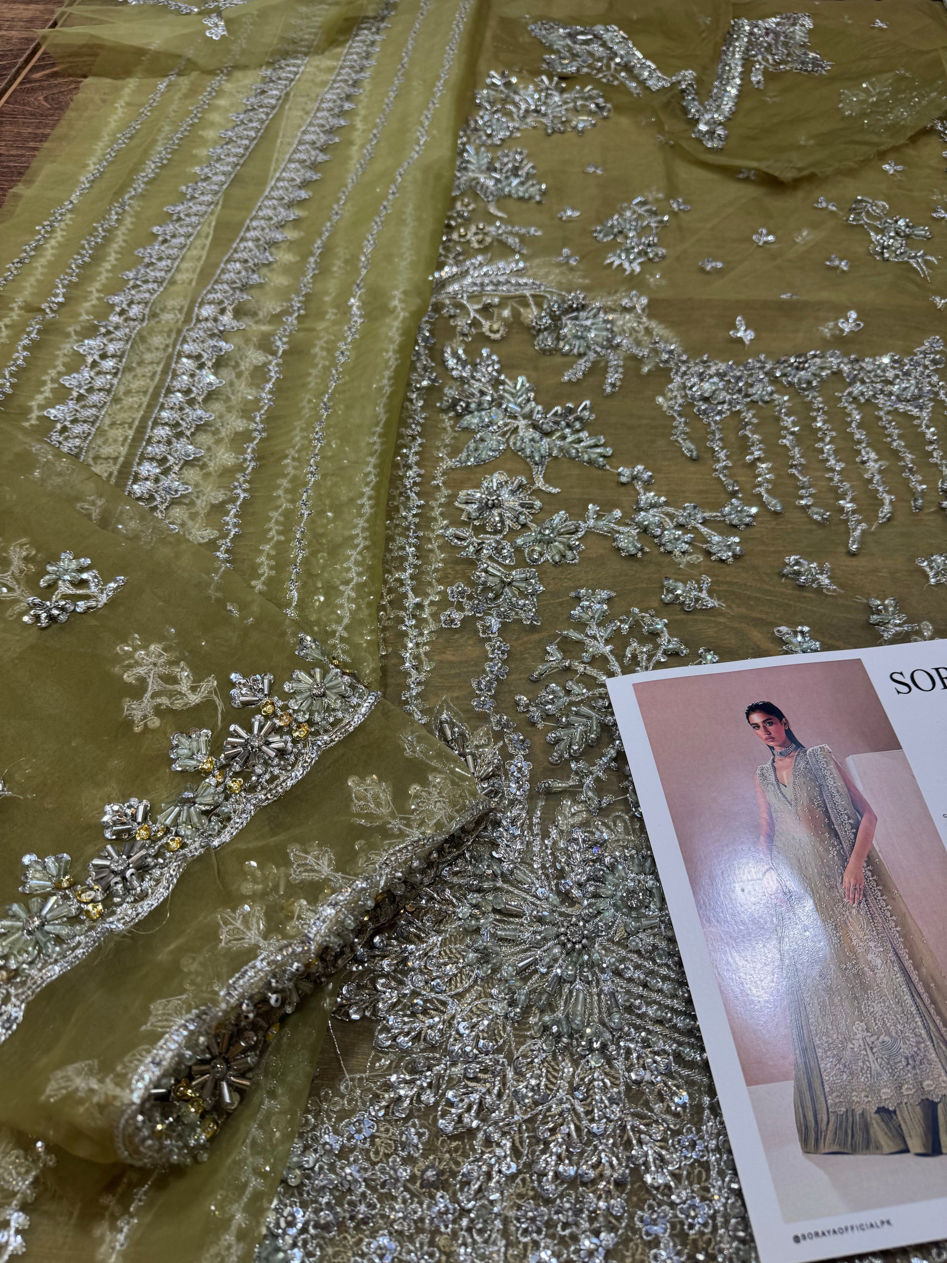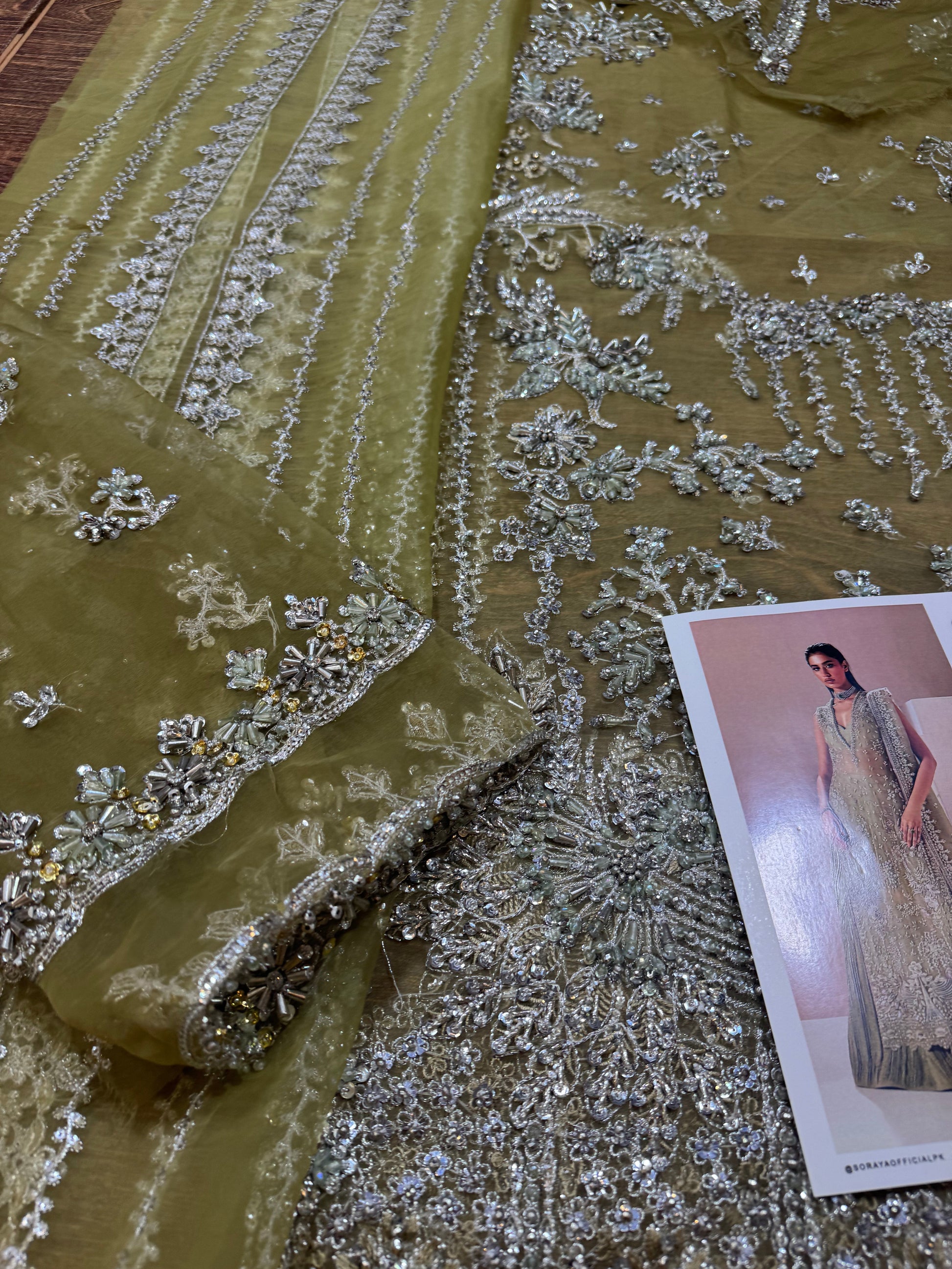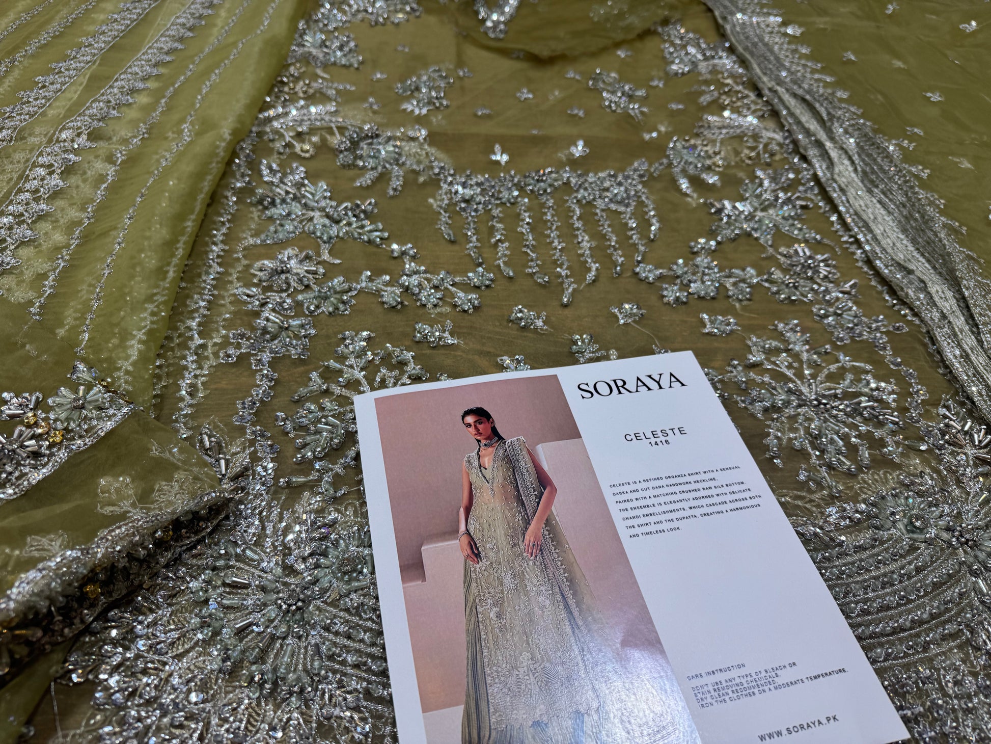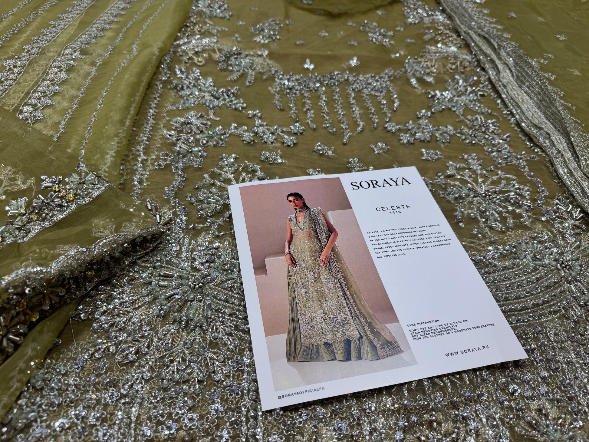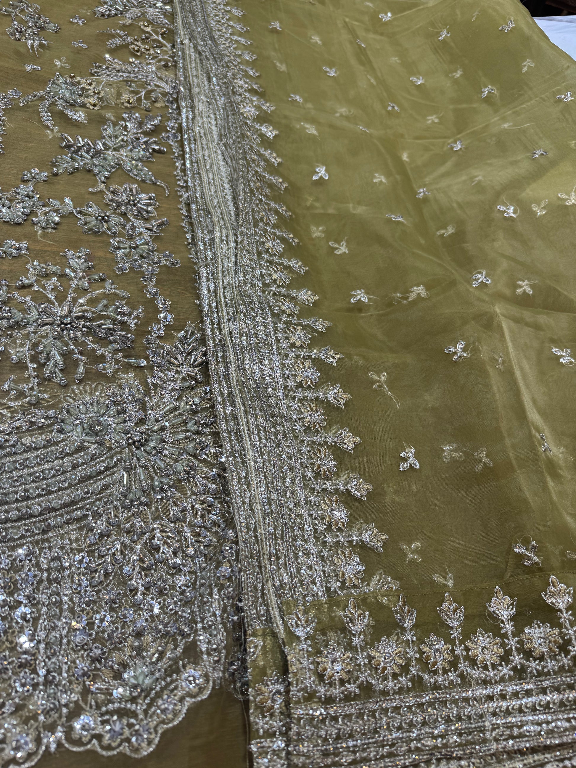 Celeste is a refined organza shirt with a sensual dabka and cut dana handwork neckline, paired with a matching crushed raw silk bottom. The ensemble is elegantly adorned with delicate chandi embellishments, which cascade across both the shirt and the dupatta, creating a harmonious and timeless look.