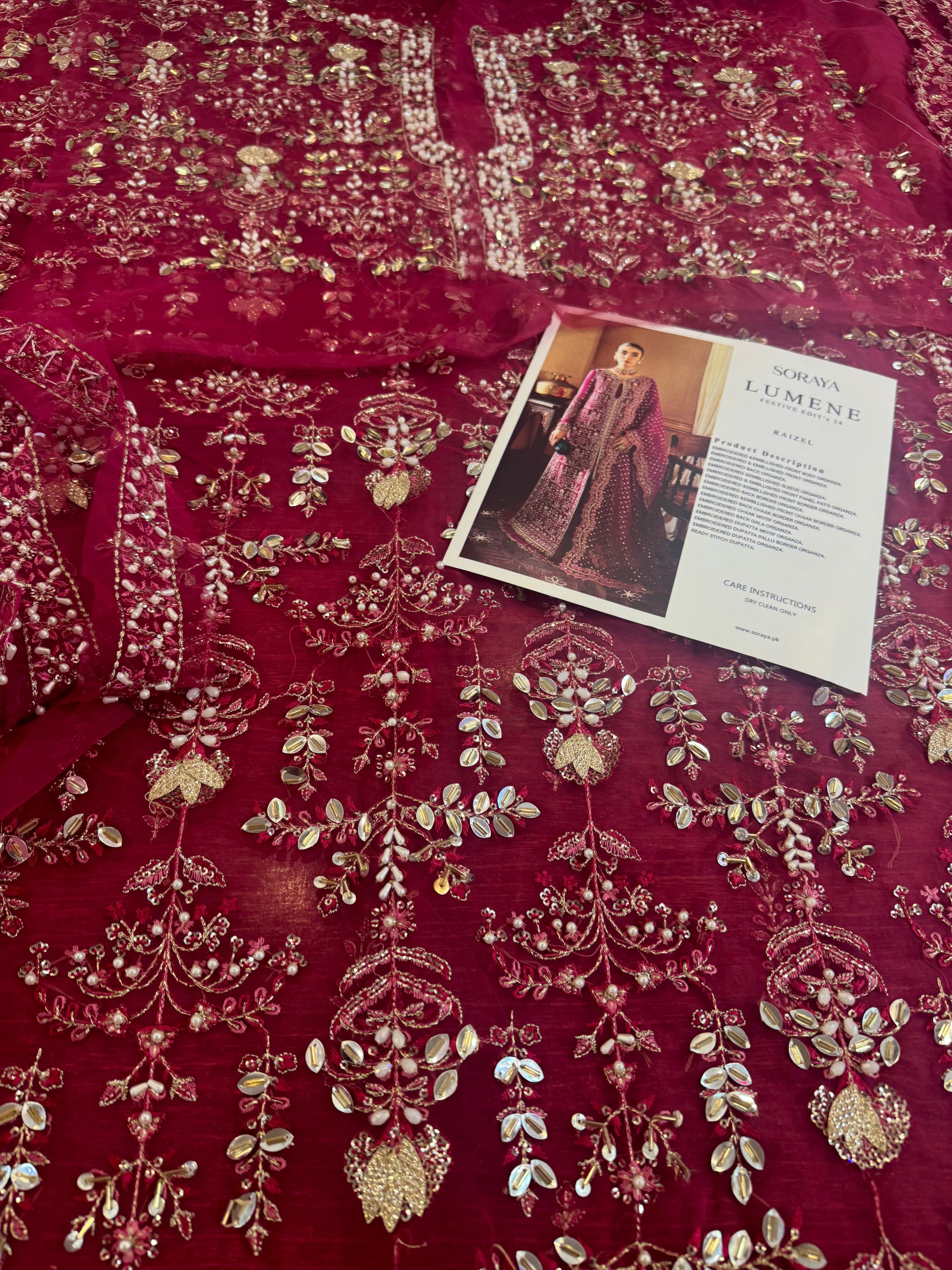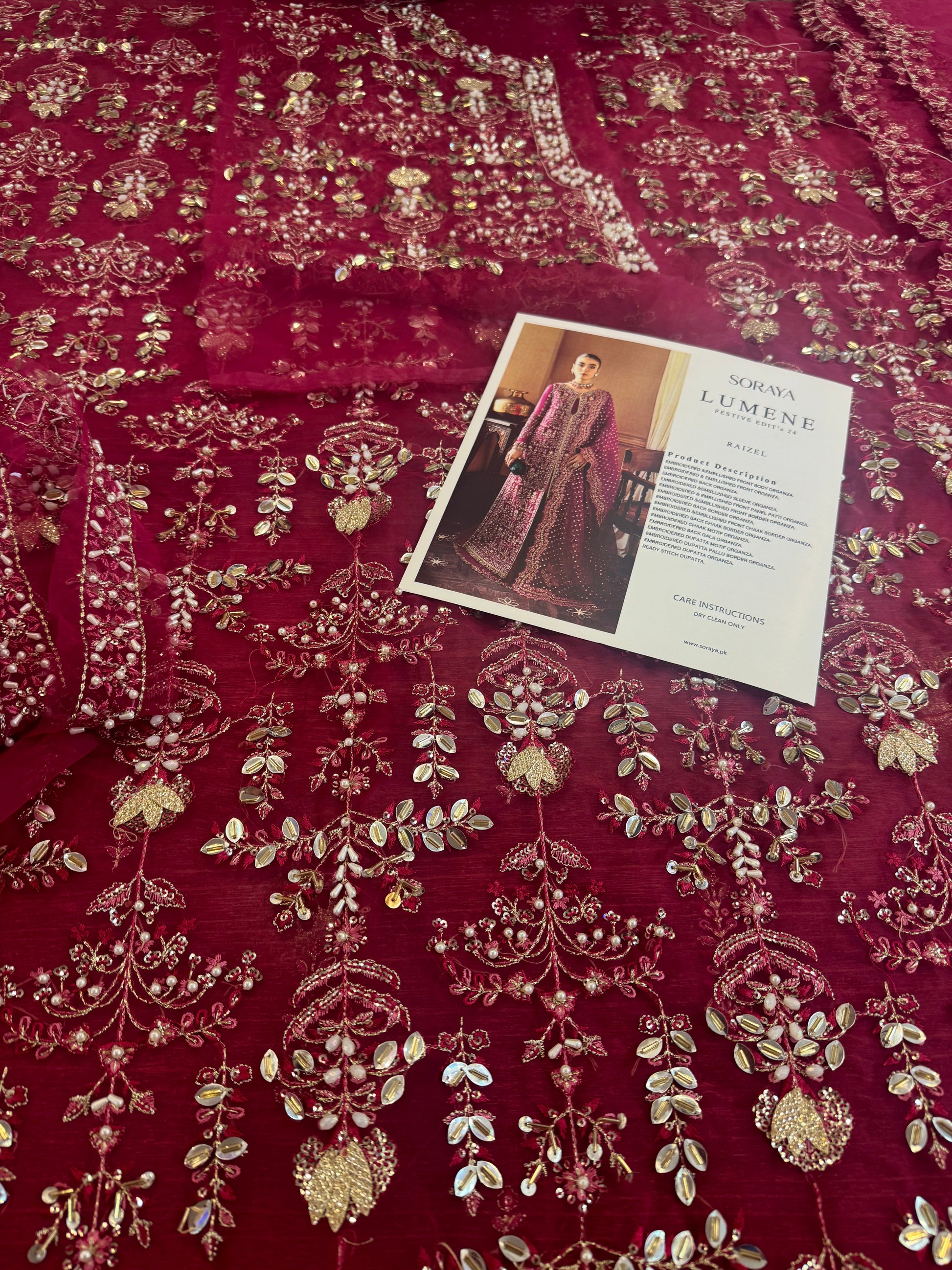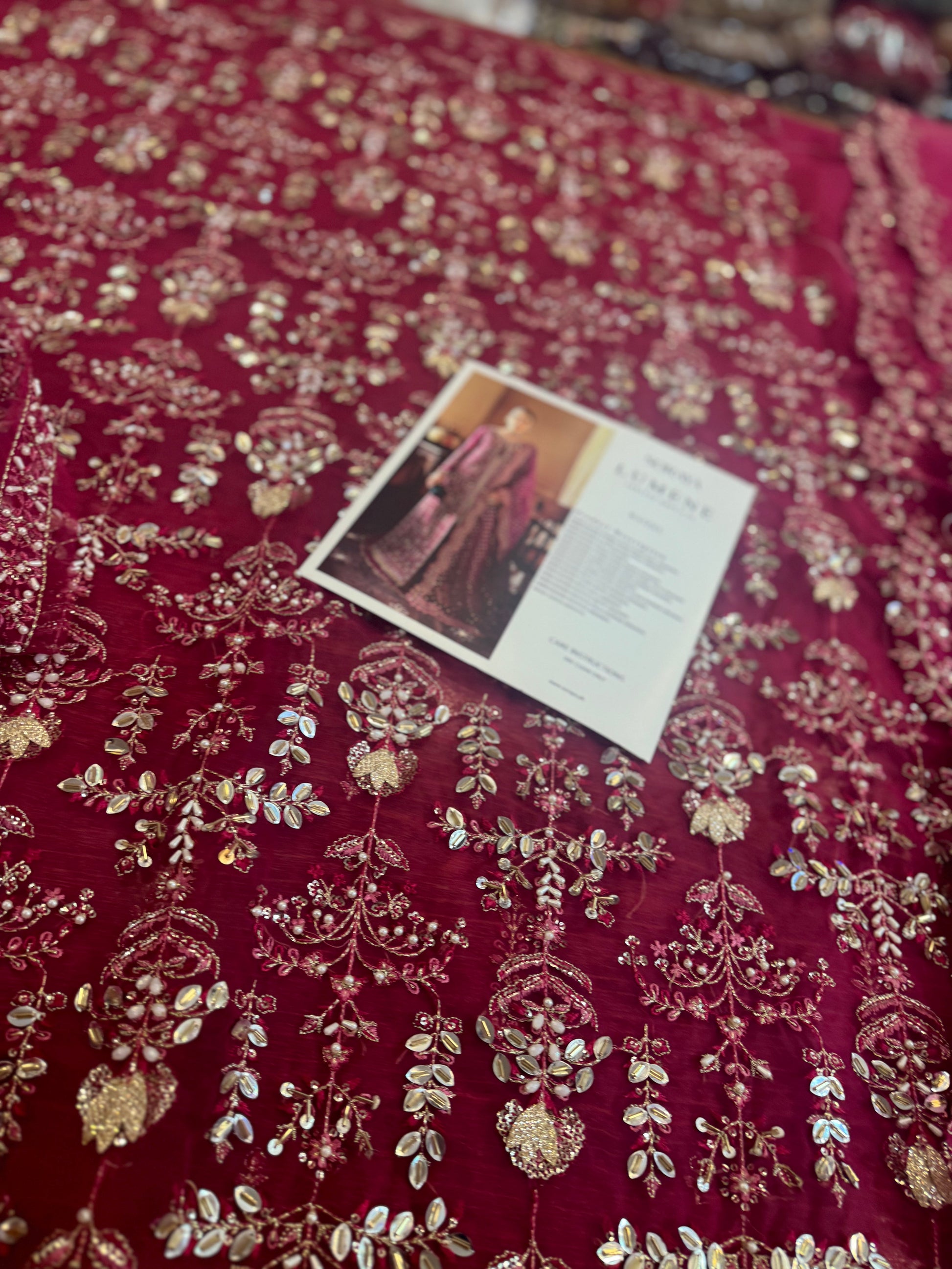 This exquisite fuchsia gown from the Soraya Wedding Edition, part of their chiffon bridal collection, is a stunning piece of couture. The open-front gown is lavishly embroidered with intricate patterns and delicate embellishments. It's paired with a flowing, wide-leg trouser and a matching dupatta, both featuring complementary embellishments and a scattered dot pattern. The entire ensemble, priced at 18500, reflects a sophisticated blend of traditional craftsmanship and contemporary style, making it a perfect choice for a grand occasion.