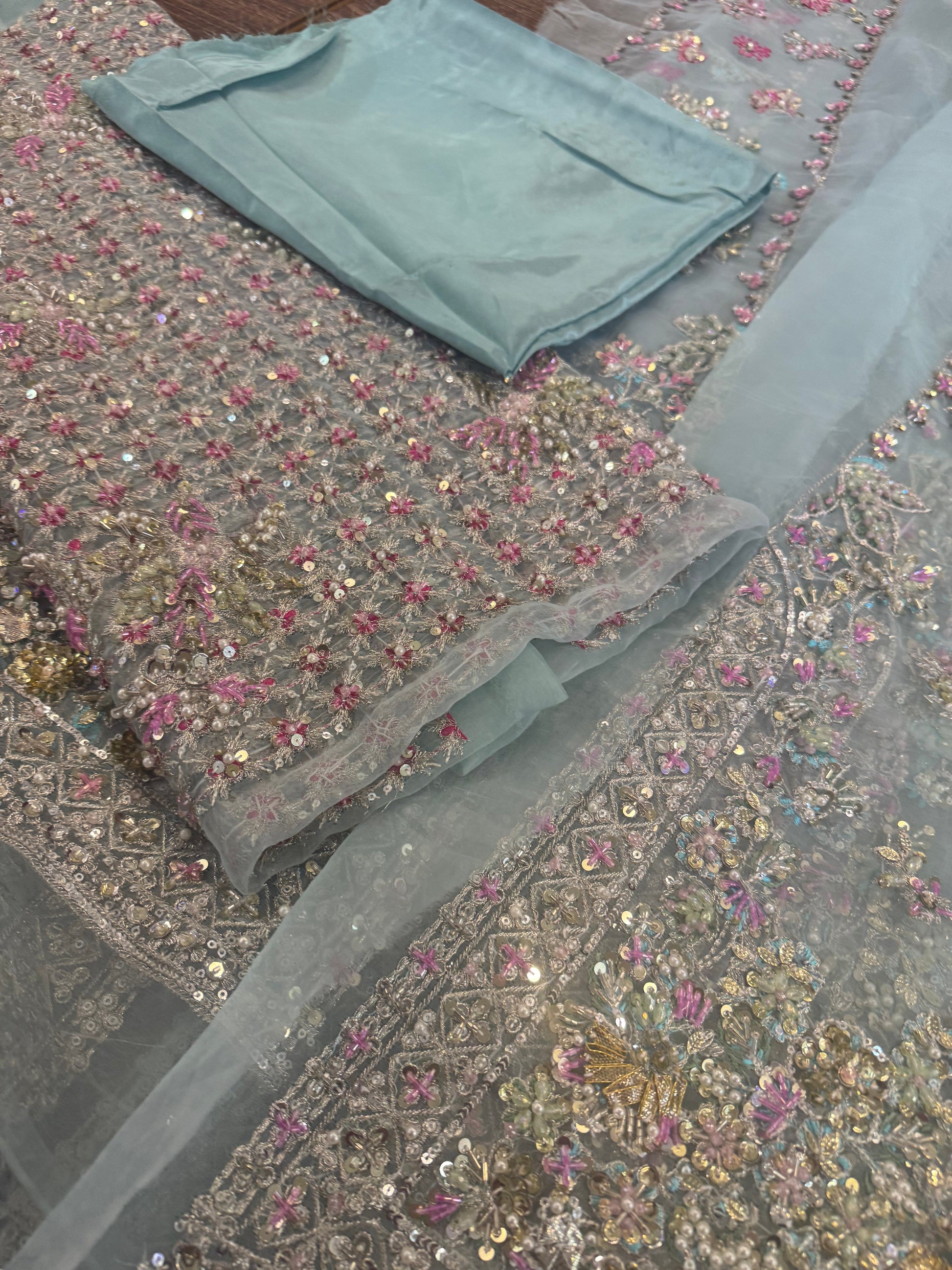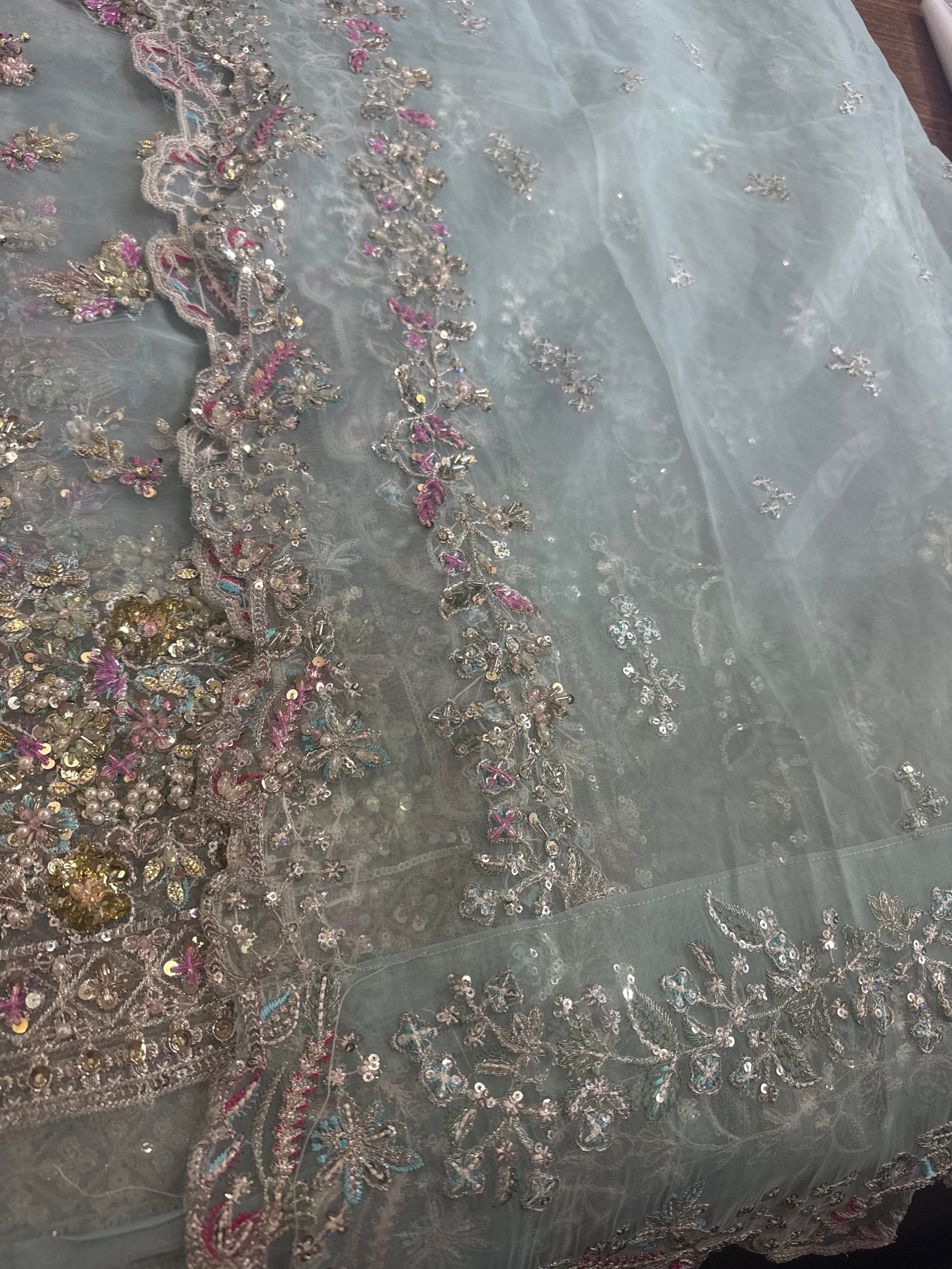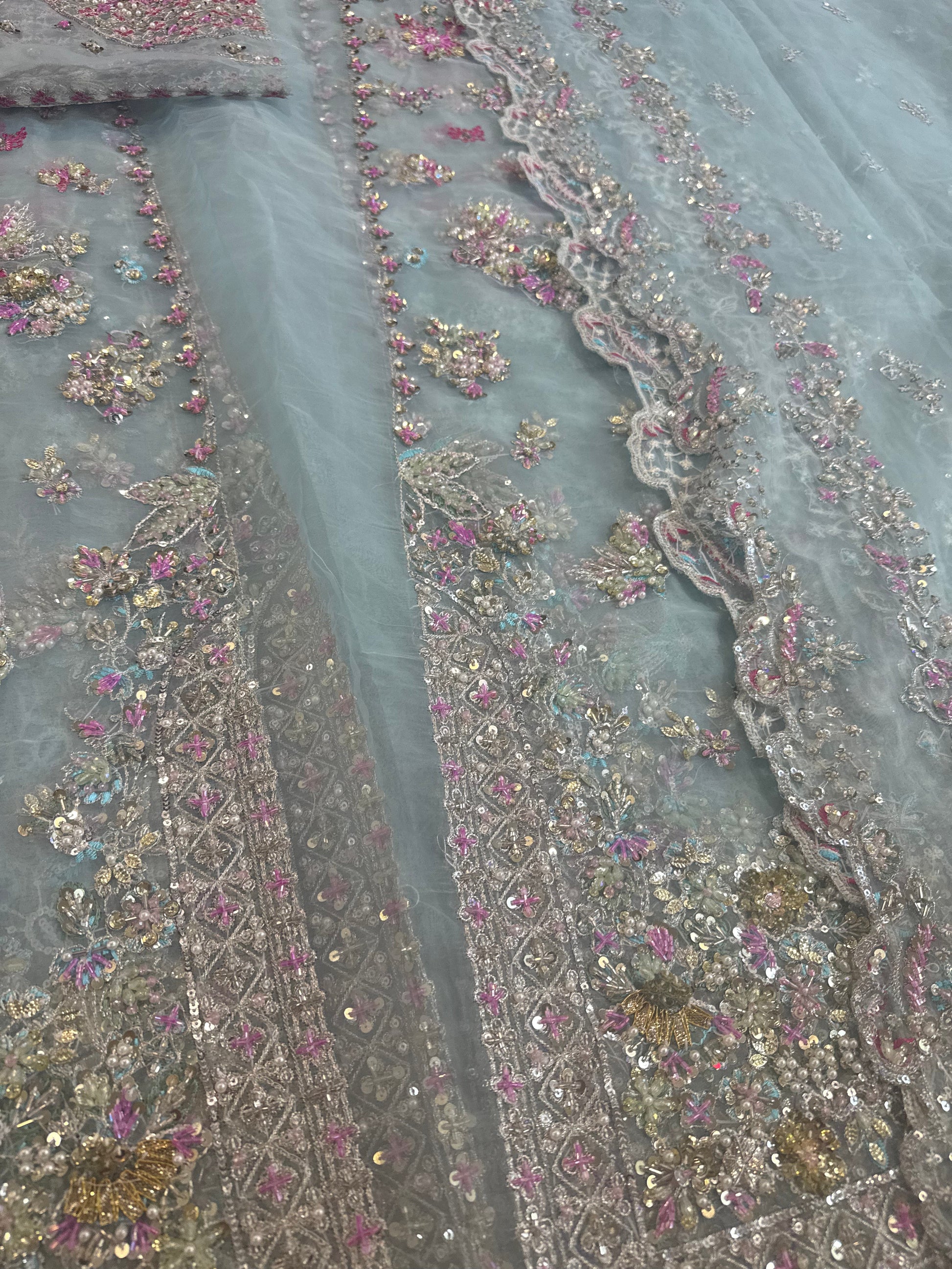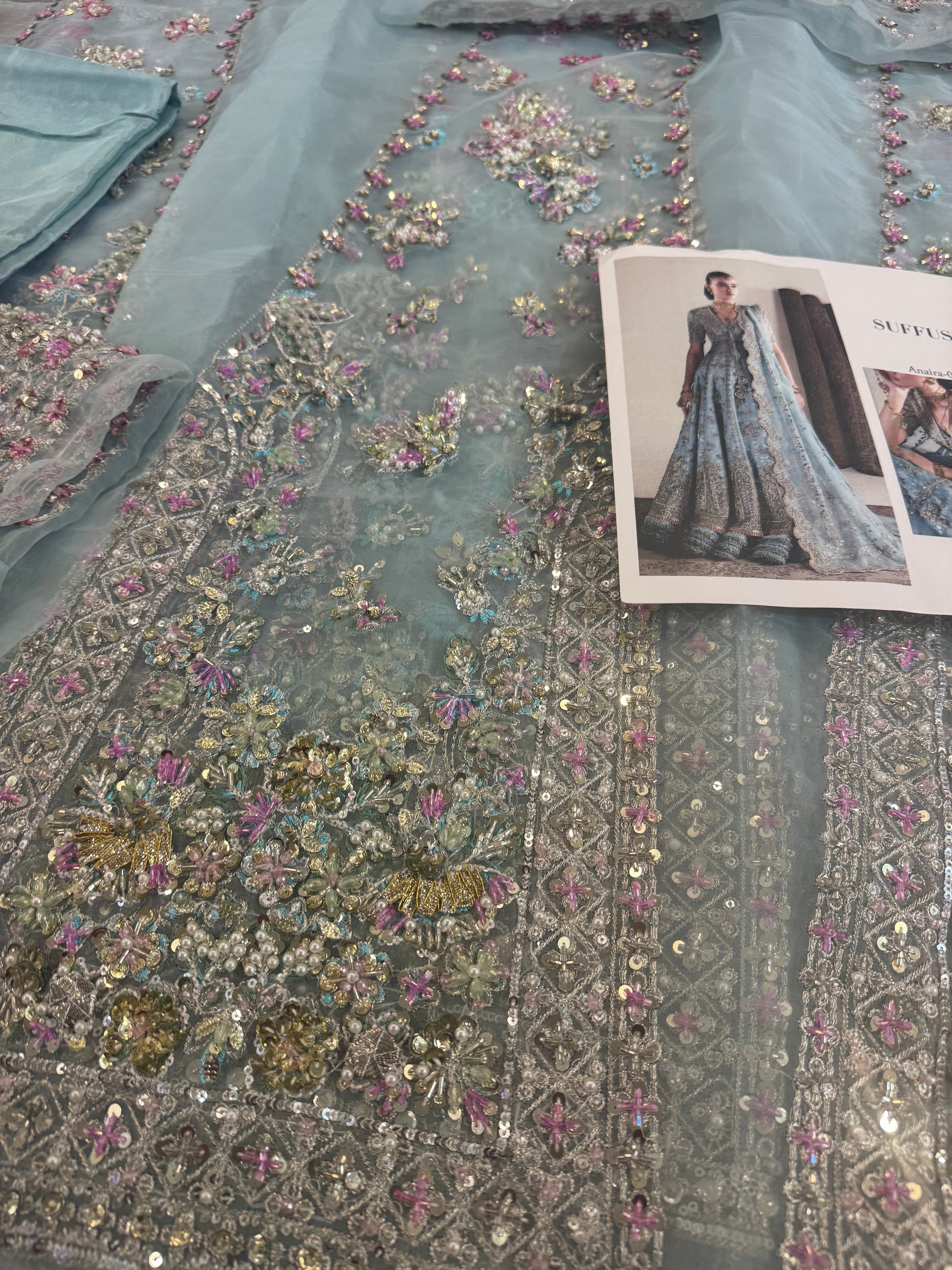 This stunning chiffon bridal lehenga from Suffuse by Sana Yasir, known as the 'Suffuse Sky,' is a breathtaking piece from their wedding edition. The ensemble features a sky-blue lehenga and choli meticulously embellished with intricate silver and gold embroidery, creating a dazzling and luxurious effect. The choli has a deep V-neck and short sleeves, while the voluminous lehenga is adorned with detailed floral and geometric patterns that shimmer with every movement. A matching dupatta, with a heavily embroidered border and scattered sequin work, drapes gracefully over the shoulder, completing the regal look.