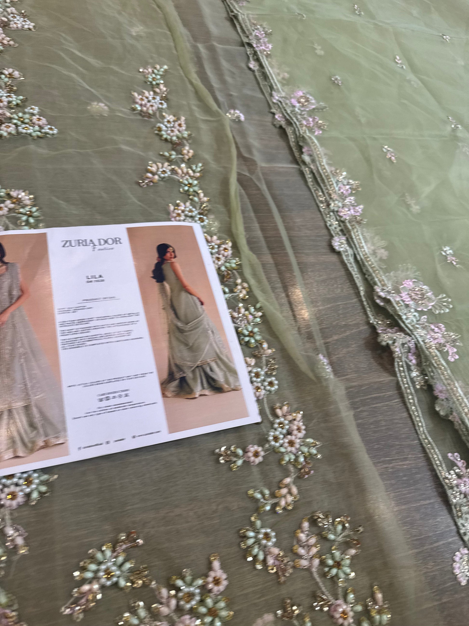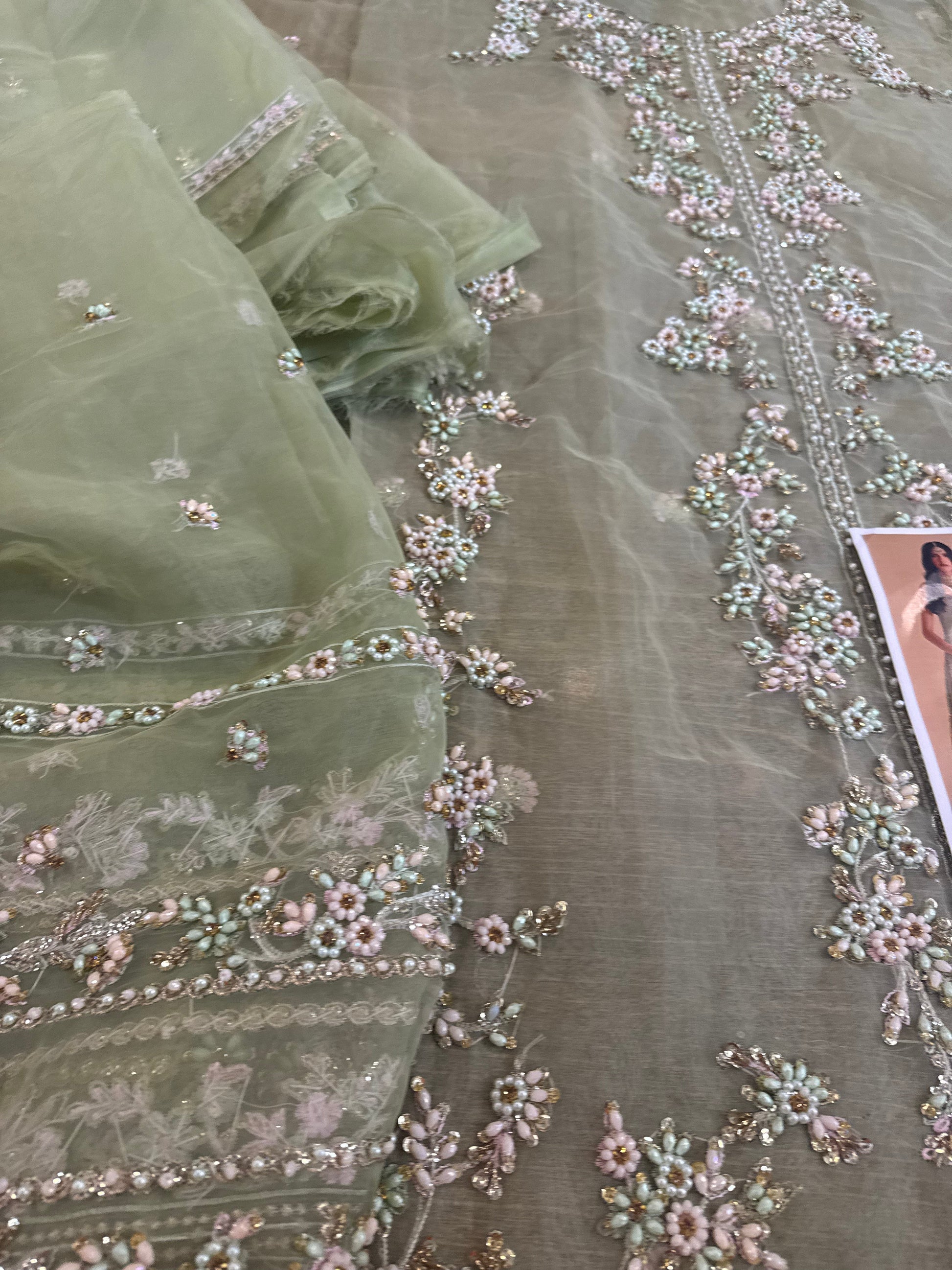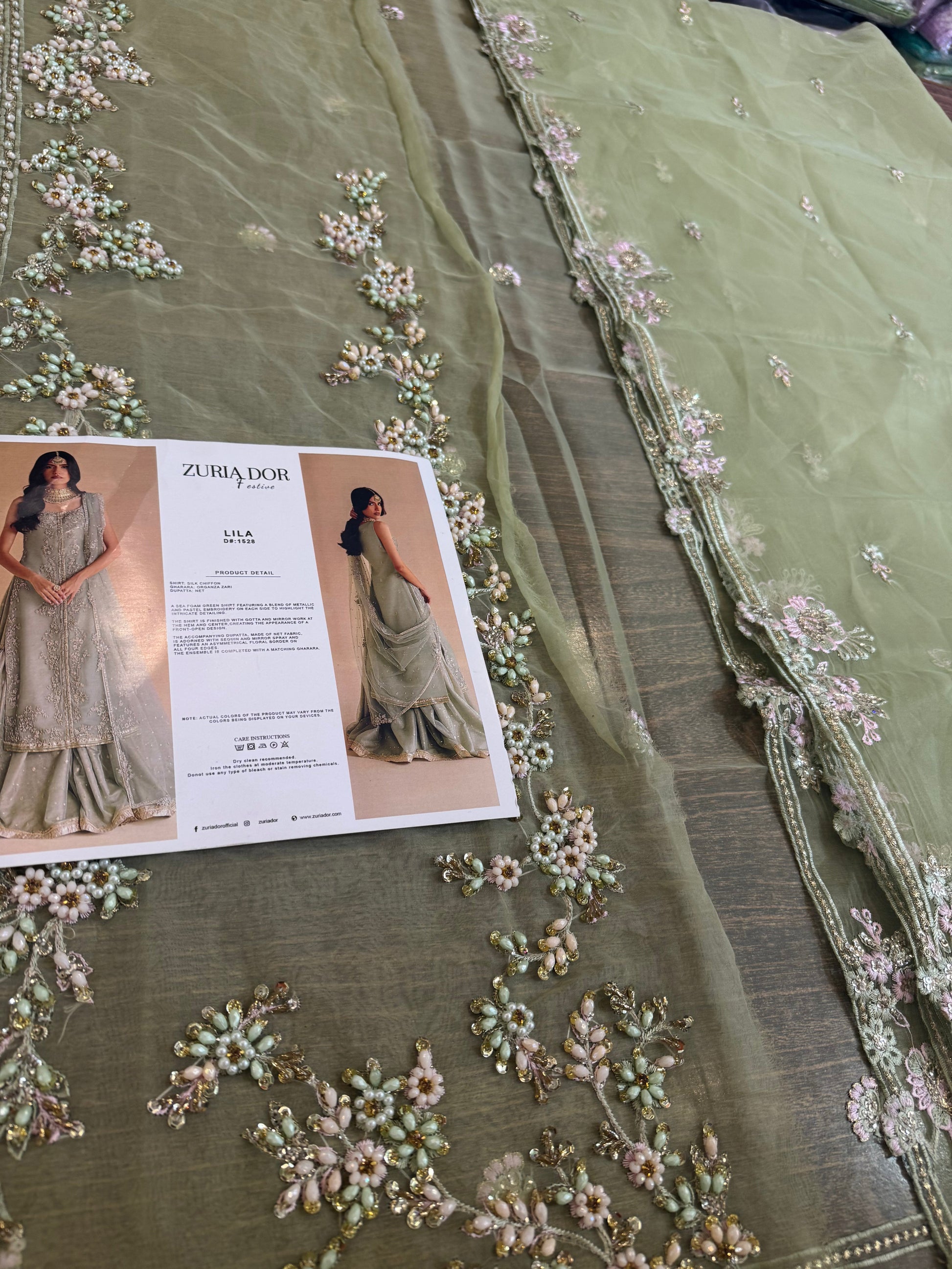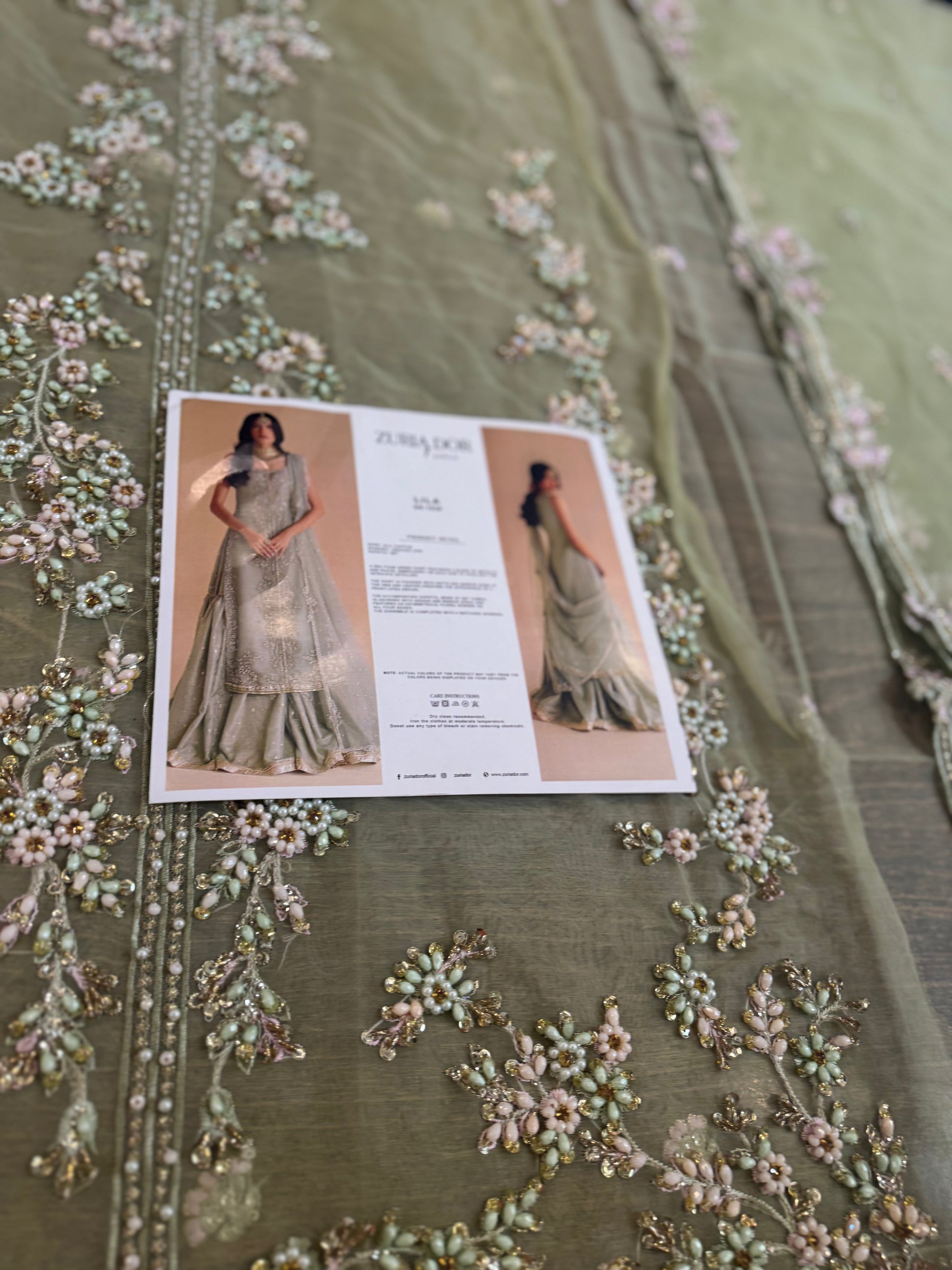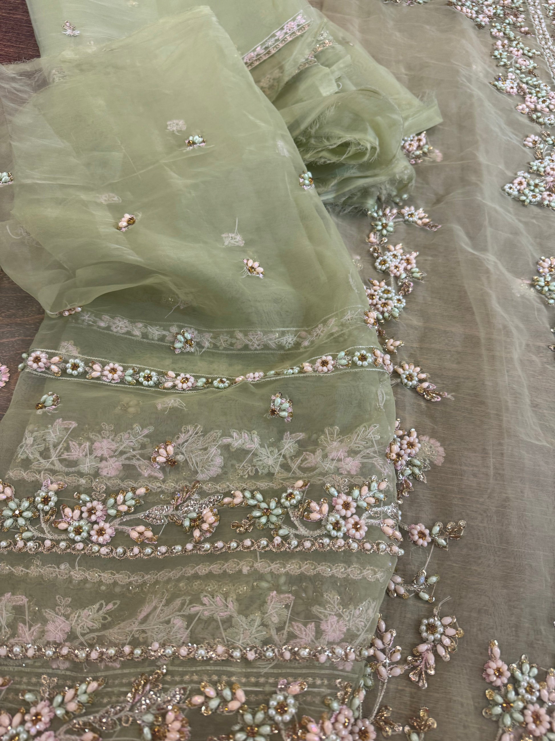 A sea foam green shirt featuring a blend of metallic and pastel embroidery on each side to highlight the intricate detailing. The shirt is finished with gotta and mirror work at the hem and center, creating the appearance of a front-open design. The accompanying dupatta, made of net fabric, is adorned with sequin and mirror spray and features an asymmetrical floral border on all four edges. The ensemble is completed with a matching gharara.