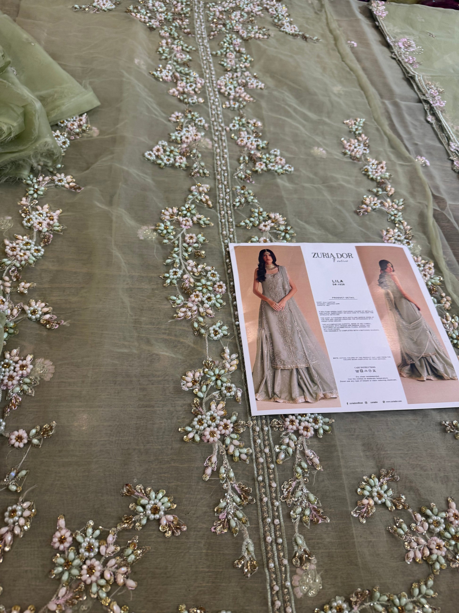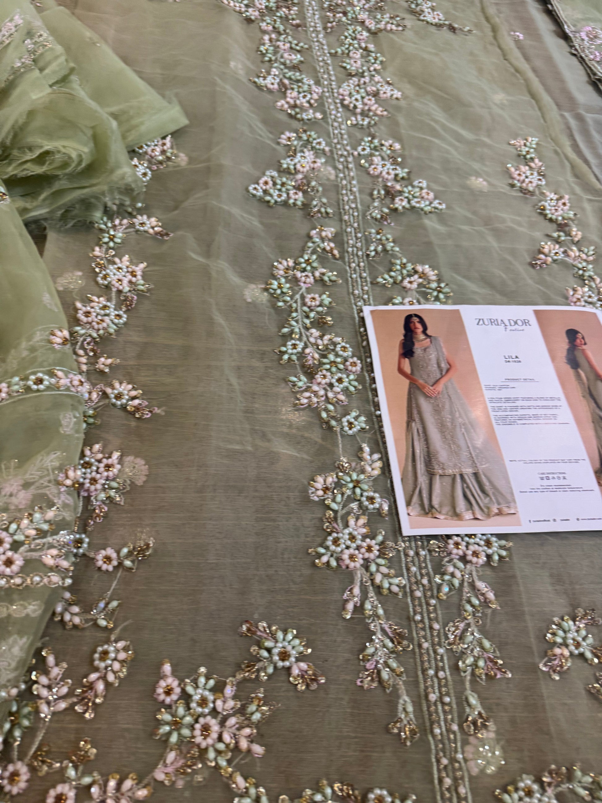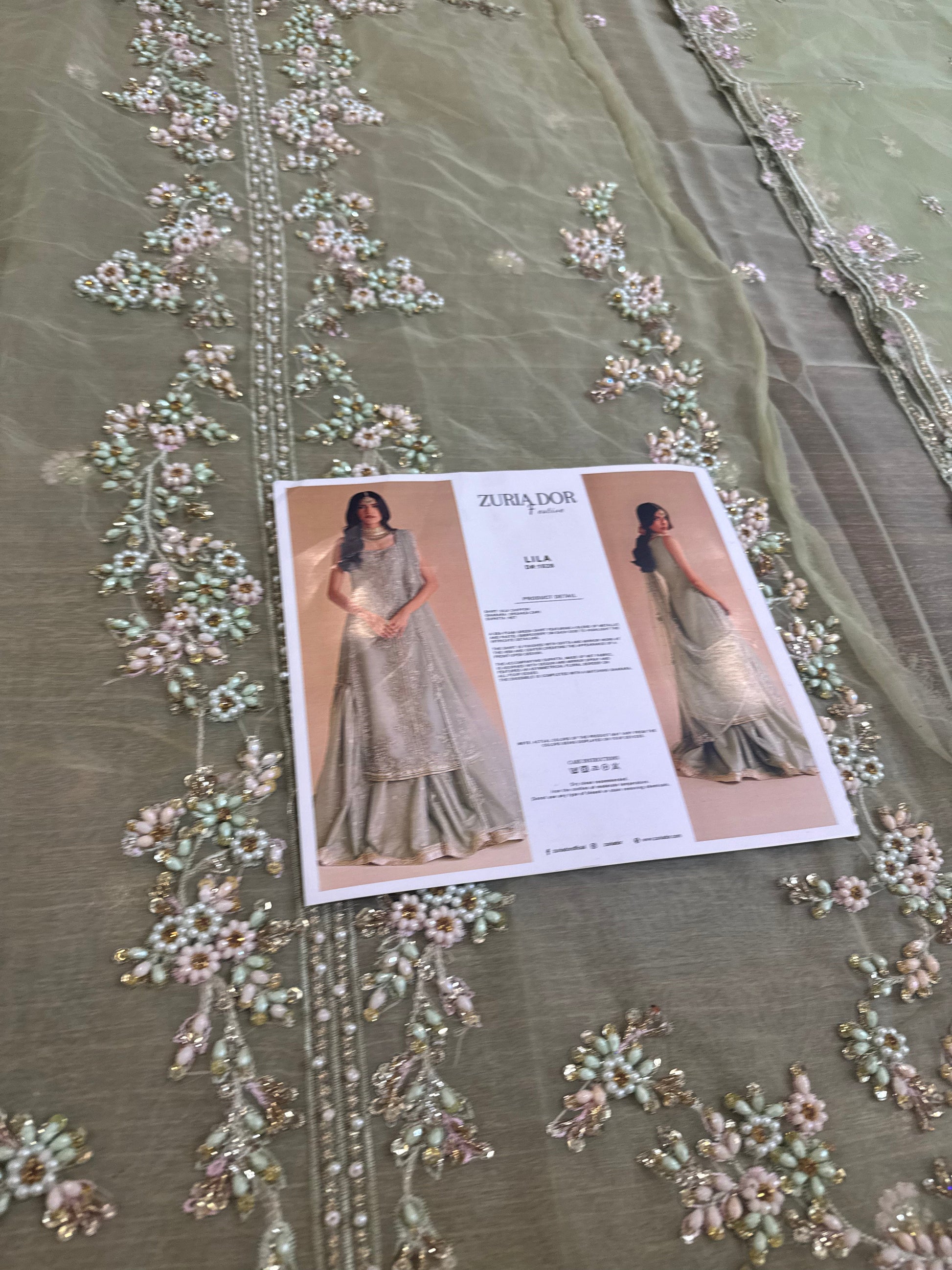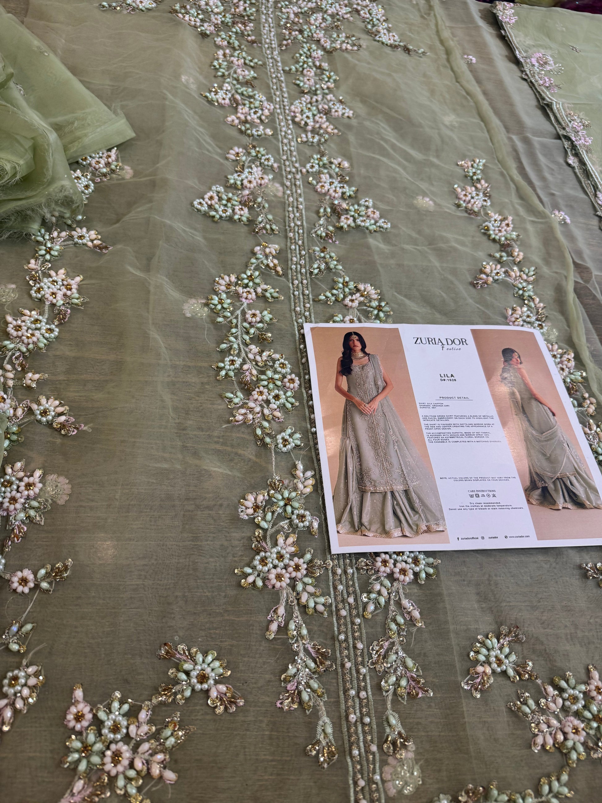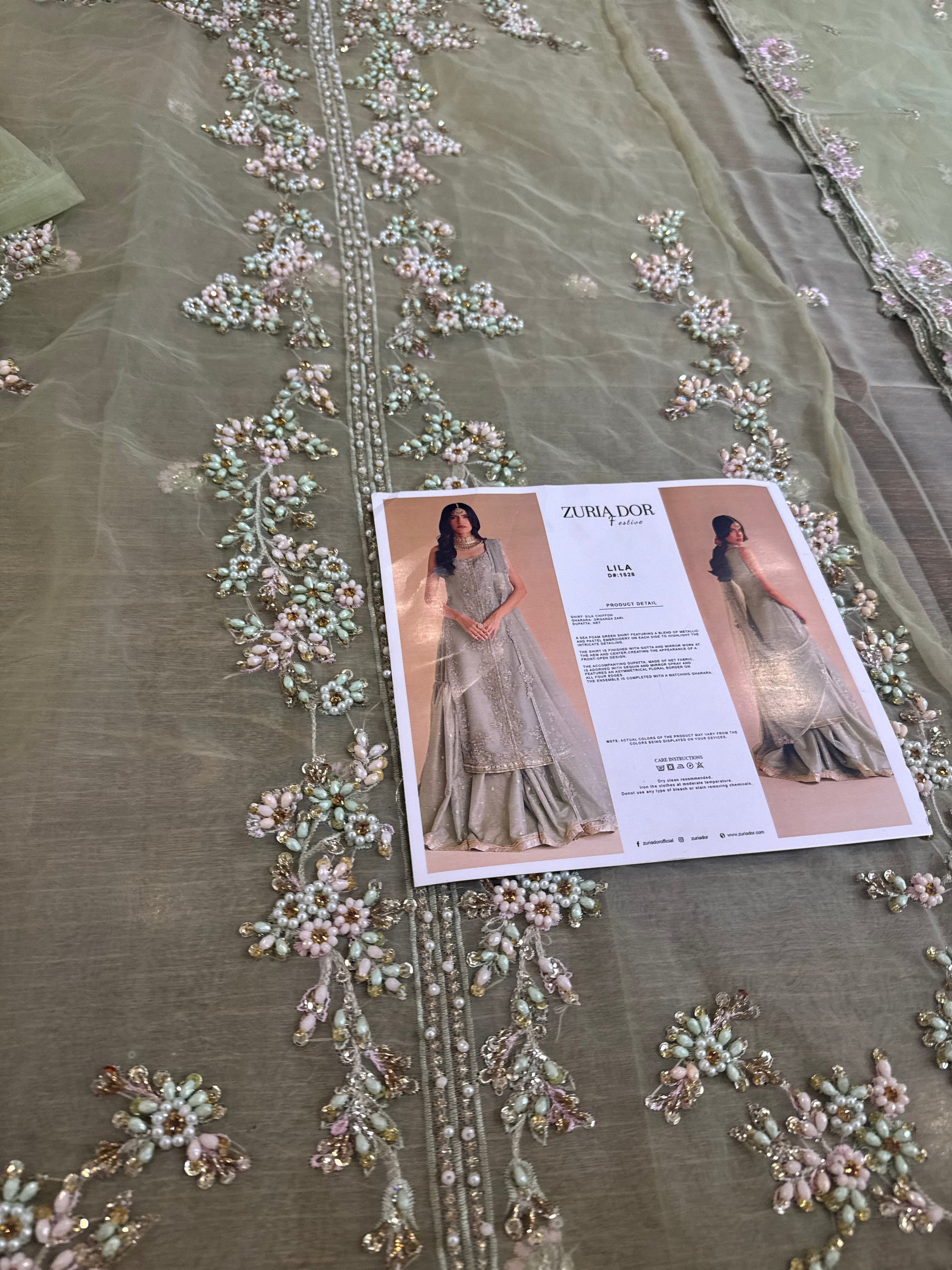 A sea foam green shirt featuring a blend of metallic and pastel embroidery on each side to highlight the intricate detailing. The shirt is finished with gotta and mirror work at the hem and center, creating the appearance of a front-open design. The accompanying dupatta, made of net fabric, is adorned with sequin and mirror spray and features an asymmetrical floral border on all four edges. The ensemble is completed with a matching gharara.